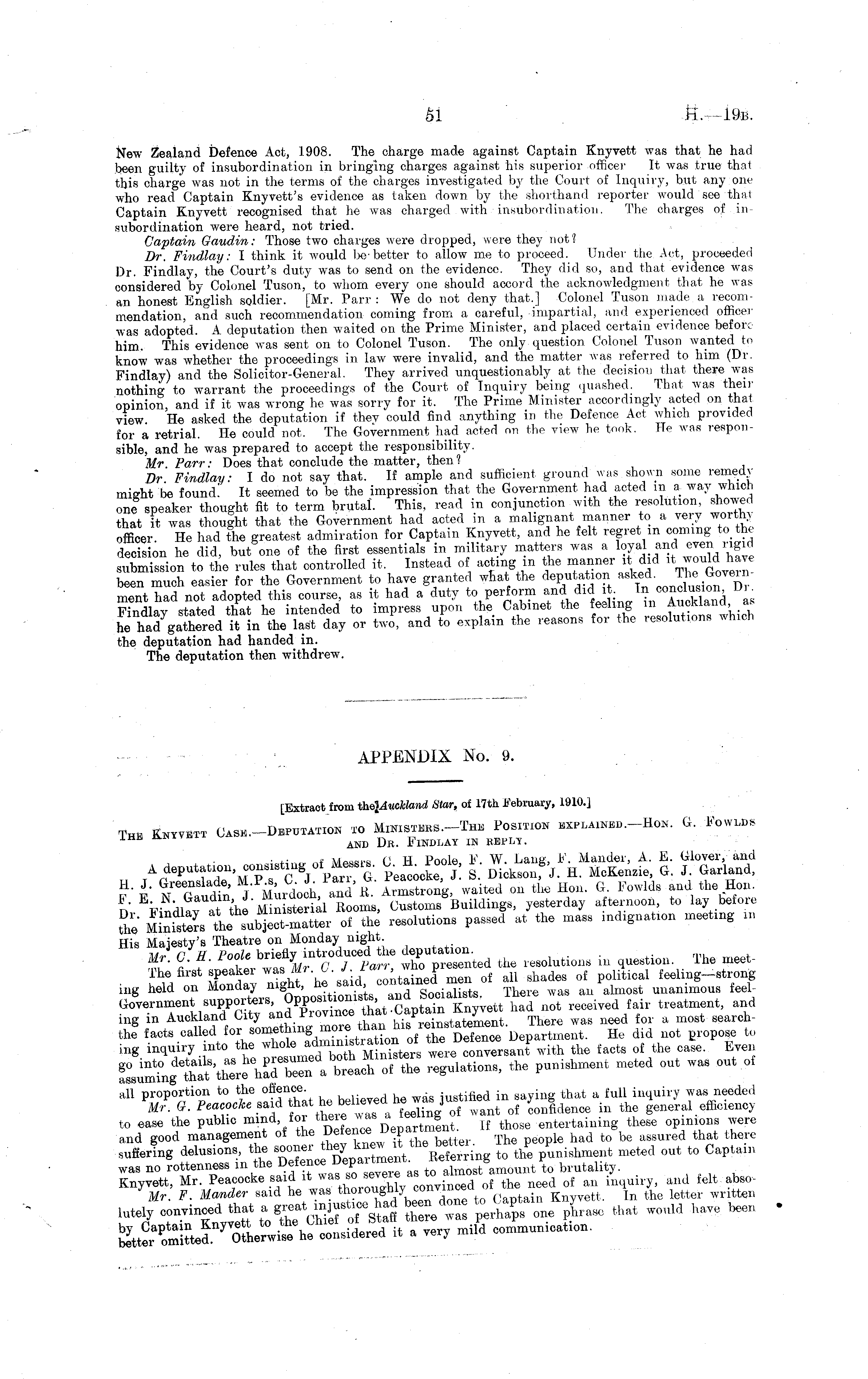 New Zealand Defence Act, 1908. The charge made against Captain Knyvett was that he had been guilty of insubordination in bringing charges against his superior officer It was true that this charge was not in the terms of the charges investigated by the Court of Inquiry, but any one who read Captain Knyvett's evidence as taken down, by the shorthand reporter would see that Captain Knyvett recognised that he was charged with insubordination. The charges of insubordination were heard, not tried. Captain Gaudin: Those two charges were dropped, were they not? Dr. Findlay: I think it would be-better to allow me to proceed. Under the Act, proceeded Dr. Findlay, the Court's duty was to send on the evidence. They did so, and that evidence was considered by Colonel Tuson, to whom every one should accord the acknowledgment that he was an honest English soldier. [Mr. Parr :We do not deny that.] Colonel Tuson made a recommendation, and such recommendation coming from a careful, impartial, and experienced officer was adopted. A deputation then waited on the Prime Minister, and placed certain evidence before him. This evidence was sent on to Colonel Tuson. The only question Colonel Tuson wanted to know was whether the proceedings in law were invalid, and the matter was referred to him (Dr. Findlay) and the Solicitor-General. They arrived unquestionably at the decision that there was nothing to warrant the proceedings of the Court of Inquiry being quashed. That was thenopinion, and if it was wrong he was sorry for it. The Prime Minister accordingly acted on that view He asked the deputation if they could find anything in the Defence Act which provided for a retrial. He could not. The Government had acted on the view he took. He was responsible, and he was prepared to accept the responsibility. Mr. Parr: Does that conclude the matter, then? Dr Findlay: Ido not say that. If ample and sufficient ground was shown some remedy might be found! It seemed to be the impression that the Government, had acted in a- way which one speaker thought fit to term brutal. This, read in conjunction with the resolution, showed that it was thought that the Government had acted in a malignant manner to a very worthy officer. He had the greatest admiration for Captain Knyvett, and he felt regret in coming to the decision he did, but one of the first essentials in military matters was a loyal and even rigid submission to the rules that controlled it, Instead of acting in the manner it did -uld have been much easier for the Government to have granted what the deputation asked. The Govern ment had not adopted this course, as it had a duty to perform and did D £ Findlay stated that he intended to impress upon the Cabinet the feeling in Auoktand he had gathered it in the last day or two, and to explain the reasons for the resolutions which the deputation had handed in. The deputation then withdrew.