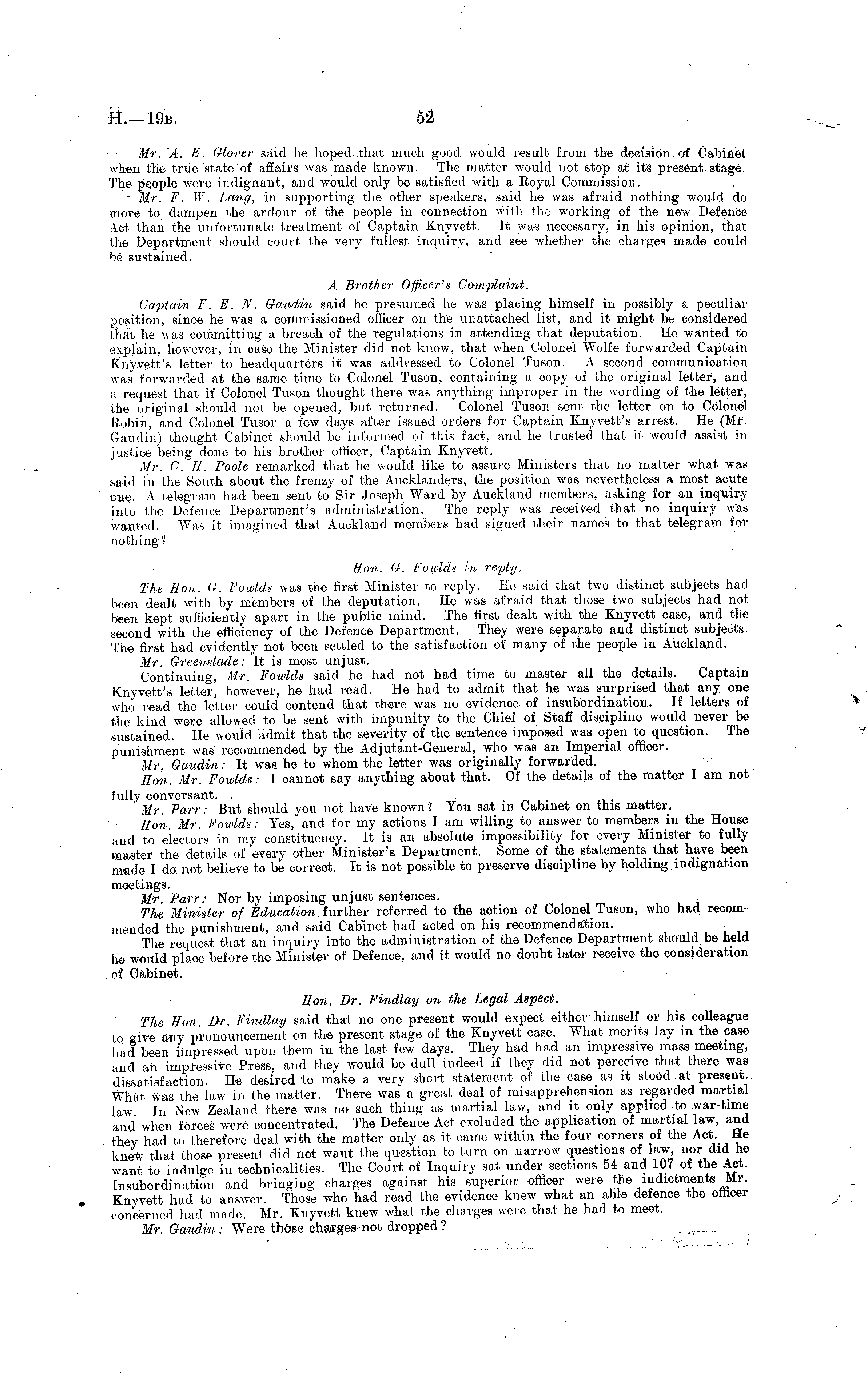 Mr. A. E. Glover said he hoped, that much good would result from the decision of Cabinet when the true state of affairs was made known. The matter would not stop at its present stage. The people were indignant, and would only be satisfied with a Royal Commission. Mr. F. W. Lang, in supporting the other speakers, said he was afraid nothing would do more to dampen the ardour of the people in connection with (ho working of the new Defence Act than the unfortunate treatment of Captain Knyvett. It was necessary, in his opinion, that the Department should court the very fullest inquiry, and see whether the charges made could be sustained. A Brother Officer's Complaint. Captain F. E. N. Gaudin said he presumed he was placing himself in possibly a peculiar position, since he was a commissioned officer on the unattached list, and it might be considered that he was committing a breach of the regulations in attending that deputation. He wanted to explain, however, in case the Minister did not know, that when Colonel Wolfe forwarded Captain Knyvett's letter to headquarters it was addressed to Colonel Tuson. A second communication was forwarded at the same time to Colonel Tuson, containing a copy of the original letter, and a request that if Colonel Tuson thought there was anything improper in the wording of the letter, the original should not be opened, but returned. Colonel Tuson sent the letter on to Colonel Robin, and Colonel Tusou a few days after issued orders for Captain Knyvett's arrest. He (Mr. Gaudin) thought Cabinet should be informed of this fact, and he trusted that it would assist in justice being done to his brother officer, Captain Knyvett. Mr. C. H. Poole remarked that he would like to assure Ministers that no matter what was said in the South about the frenzy of the Aucklanders, the position was nevertheless a most acute one. A telegram had been sent to Sir Joseph Ward by Auckland members, asking for an inquiry into the Defence Department's administration. The reply was received that no inquiry was wanted. Was it imagined that Auckland members had signed their names to that telegram for nothing? Hon. G. Fowlds in reply. The Hon. G. Fowlds was the first Minister to reply. He said that two distinct subjects had been dealt with by members of the deputation. He was afraid that those two subjects had not been kept sufficiently apart in the public mind. The first dealt with the Knyvett case, and the second with the efficiency of the Defence Department. They were separate and distinct subjects. The first had evidently not been settled to the satisfaction of many of the people in Auckland. Mr. Greenslade: It is most unjust. Continuing, Mr. Fowlds said he had not had time to master all the details. Captain Knyvett's letter, however, he had read. He had to admit that he was surprised that any one who read the letter could contend that there was no evidence of insubordination. If letters of the kind were allowed to be sent with impunity to the Chief of Staff discipline would never be sustained. He would admit that the severity of the sentence imposed was open to question. The punishment was recommended by the Adjutant-General, who was an Imperial officer. Mr. Gaudin: It was he to whom the letter was originally forwarded. Hon. Mr. Fowlds: I cannot say anything about that. Of the details of the matter I am not fully conversant. , . Mr. Parr: But should you not have known ? You sat in Cabinet on this matter. Hon. Mr. Fowlds: Yes, and for my actions I am willing to answer to members in the House and to electors in my constituency. It is an absolute impossibility for every Minister to fully master the details of "every other Minister's Department. Some of the statements that have been made Ido not believe to be correct. It is not possible to preserve discipline by holding indignation meetings. Mr Parr: Nor by imposing unjust sentences. The Minister of Education further referred to the action of Colonel Tuson, who had recommended the punishment, and said Cabinet had acted on his recommendation. The request that an inquiry into the administration of the Defence Department should be held he would place before the Minister of Defence, and it would no doubt later receive the consideration of Cabinet. Hon. Dr. Findlay on the Legal Aspect. The II on Dr. Findlay said that no one present would expect either himself or his colleague to give any pronouncement on the present stage of the Knyvett case. What merits lay in the case had been impressed upon them in the last few days. They had had an impressive mass meeting, and an impressive Press, and they would be dull indeed if they did not perceive that there was dissatisfaction. He desired to make a very short statement of the case as it stood at present. What was the law in the matter. There was a great deal of misapprehension as regarded martial law In New Zealand there was no such thing as martial law, and it only applied to war-time and when forces were concentrated. The Defence Act excluded the application of martial law, and they had to therefore deal with the matter only as it came within the four corners of the Act. He knew that those present did not want the question to turn on narrow questions of law, nor did he want to indulge in technicalities. The Court of Inquiry sat under sections 54 and 107 of the Act. Insubordination and bringing charges against his superior officer were the indictments Mr. Knyvett had to answer. Those who had read the evidence knew what an able defence the officer concerned had made. Mr. Knyvett knew what the charges were that he had to meet. Mr. Gaudin : Were those charges not dropped ?