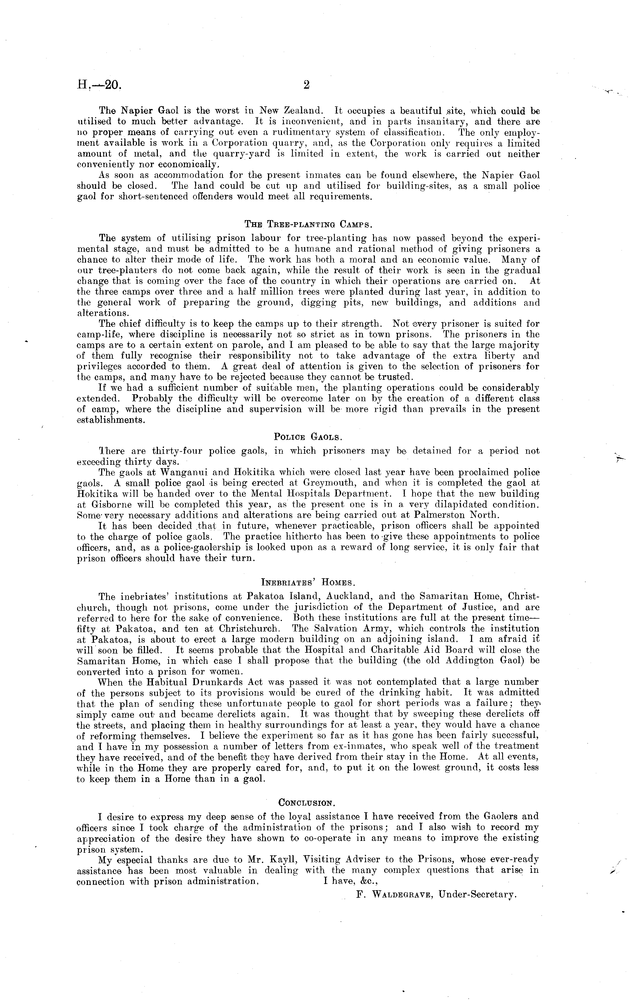 The Napier Gaol is the worst in New Zealand. It occupies a beautiful site, which could be utilised to much better advantage. It is inconvenient, and in parts insanitary, and there are no proper means of carrying out even a rudimentary system of classification. The only employment available is work in a Corporation quarry, and, as the Corporation only requires a limited amount of metal, and the quarry-yard is limited in extent, the work is carried out neither conveniently nor economically. As soon as accommodation for the present inmates can be found elsewhere, the Napier Gaol should be closed. The land could be cut up and utilised for building-sites, as a small police gaol for short-sentenced offenders would meet all requirements. The Tree-planting Camps. The system of utilising prison labour for tree-planting has now passed beyond the experimental stage, and must be admitted to be a humane and rational method of giving prisoners a chance to alter their mode of life. The work has both a moral and an economic value. Many of our tree-planters do not come back again, while the result of their work is seen in the gradual change that is coming over the face of the country in which their operations are carried on. At the three camps over three and a half million trees were planted during last year, in addition to the general work of preparing the ground, digging pits, new buildings, and additions and alterations. The chief difficulty is to keep the camps up to their strength. Not ©very prisoner is suited for camp-life, where discipline is necessarily not so strict as in town prisons. The prisoners in the camps are to a certain extent on parole, and 1 am pleased to be able to say that the large majority of them fully recognise their responsibility not to take advantage of the extra liberty and privileges accorded to them. A great deal of attention is given to the selection of prisoners for the camps, and many have to be rejected because they cannot be trusted. If we had a sufficient number of suitable men, the planting operations could be considerably extended. Probably the difficulty will be overcome later on by the creation of a different class of camp, where the discipline and supervision will be more rigid than prevails in the present est abl i shments. Police Gaols. Ihere are thirty-four police gaols, in which prisoners may be detained for a period not exceeding thirty days. The gaols at Wanganui and Hokitika which were closed last year have been proclaimed police gaols. A small police gaol is being erected at Greymouth, and when it is completed the gaol at Hokitika will be handed over to the Mental Hospitals Department. I hope that the new building at Gisborne will be completed this year, as the present one is in a very dilapidated condition. Some , very necessary additions and alterations are being carried out at Palmerston North. It has been decided that in future, whenever practicable, prison officers shall be appointed to the charge of police gaols. The practice hitherto has been to give these appointments to police officers, and, as a police-gaolsrship is looked upon as a reward of long service, it is only fair that prison officers should have their turn. Inebriates' Homes. The inebriates' institutions at Pakatoa Island, Auckland, and the Samaritan Home, Christchurch, though not prisons, come under the jurisdiction of the Department of Justice, and are referred to here for the sake of convenience. Both these institutions are full at the present time— fifty at Pakatoa, and ten at Christchurch. The Salvation Army, which controls the institution at Pakatoa, is about to erect a large modern building on an adjoining island. I am afraid if. will soon be filled. It seems probable that the Hospital and Charitable Aid Board will close the Samaritan Home, in which case I shall propose that the building (the old Addington Gaol) be converted into a prison for women. When the Habitual Drunkards Act was passed it was not contemplated that a large number of the persons subject to its provisions would be cured of the drinking habit. It was admitted that the plan of sending these unfortunate people to gaol for short periods was a failure ; they simply came out and became derelicts again. It was thought that by sweeping these derelicts off the streets, and placing them in healthy surroundings for at least a year, they would have a chance of reforming themselves. I believe the experiment so far as it has gone has been fairly sucoassful, and I have in my possession a number of letters from ex-inmates, who speak well of the treatment they have received, and of the benefit they have derived from their stay in the Home. At all events, while in the Home they are properly cared for, and, to put it on the lowest ground, it costs less to keep them in a Home than in a gaol. Conclusion. I desire to express my deep sense of the loyal assistance I have received from the Gaolers and officers since I took charge of the administration of the prisons; and I also wish to record my appreciation of the desire they have shown to co-operate in any means to improve the existing prison system. My especial thanks are due to Mr. Kayll, Visiting Adviser to the Prisons, whose ever-ready assistance has been most valuable in dealing with the many complex questions that arise in connection with prison administration, I have, &c, F. Waldegrave, Under-Secretary.