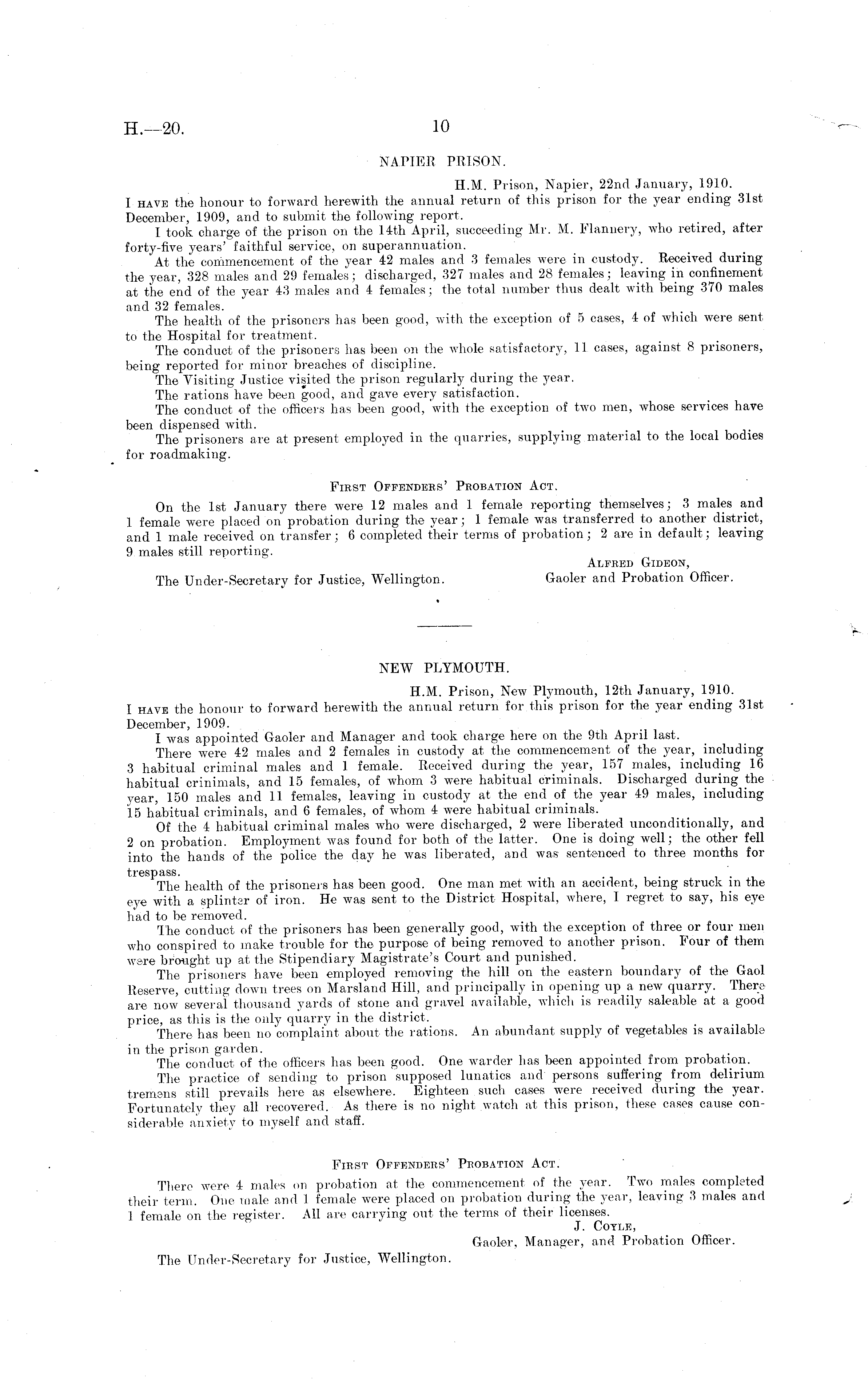 NEW PLYMOUTH. H.M. Prison, New Plymouth, 12th January, 1910. 1 have the honour to forward herewith the annual return for this prison for the }-ear ending 31st December, 1909. I was appointed Gaoler and Manager and took charge here on the 9th April last. There were 42 males and 2 females in custody at the commencement of the }'ear, including 3 habitual criminal males and 1 female. Received during the year, 157 males, including 16 habitual criminals, and 15 females, of whom 3 were habitual criminals. Discharged during the year, 150 males and 11 females, leaving in custody at the end of the year 49 males, including 15 habitual criminals, and 6 females, of whom 4 were habitual criminals. Of the 4 habitual criminal males who were discharged, 2 were liberated unconditionally, and 2 on probation. Employment was found for both of the latter. One is doing well; the other fell into the hands of the police the day he was liberated, and was sentenced to three months for trespass. The health of the prisoners has been good. One man met with an accident, being struck in the eve with a splinter of iron. He was sent to the District Hospital, where, I regret to say, his eye had to be removed. The conduct of the prisoners has been generally good, with the exception of three or four men who conspired to make trouble for the purpose of being removed to another prison. Four of them ware brought up at the Stipendiary Magistrate's Court and punished. The prisoners have been employed removing the hill on the eastern boundary of the Gaol Reserve, cutting down trees on Marsland Hill, and principally in opening up a new quarry. There are now several thousand yards of stone and gravel available, winch is readily saleable at a good price, as this is the only quarry in the district. There has been no complaint about the rations. An abundant supply of vegetables is available in the prison garden. The conduct of the officers has been good. One warder has been appointed from probation. The practice of sending to prison supposed lunatics and persons suffering from delirium tremens still prevails here as elsewhere. Eighteen such cases were received during the year. Fortunately they all recovered. As there is no night watch at this prison, these cases cause considerable anxiety to myself and staff. First Offenders' Probation Act. There were 4 males on probation at the commencement of the year. Two males completed their term. One male and 1 female were placed on probation during the year, leaving 3 males and 1 female on the register. All are carrying out the terms of their licenses. J. Cotle, Gaoler, Manager, and Probation Officer. The Under-Secretary for Justice, Wellington.