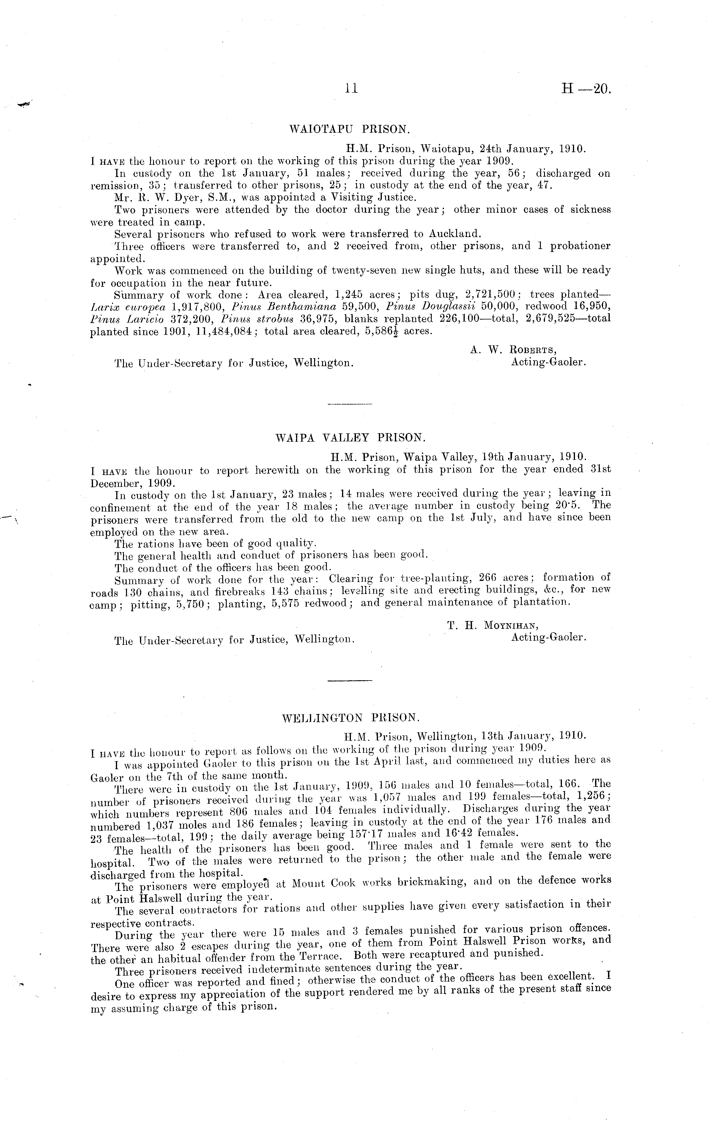 WAI PA VALLEY PRISON. H.M. Prison, Waipa Valley, 19th January, 1910. I havk the honour to report herewith on the working of this prison for the year ended 31st December, 1909. In custody on the Ist January, 23 males; 14 males were received during the year; leaving in confinement at the end of the year 18 males ; the average number in custody being 205. The prisoners were transferred from the old to the new camp on the Ist July, and have since been employed on the new area. The rations have been of good quality. The general health and conduct of prisoners has been good. The conduct of the officers has been good. Summary of work done for the year: Clearing for tree-planting, 266 acres; formation of roads 130 chains, and firebreaks 143 "chains; levelling site and erecting buildings, &c., for new camp; pitting, 5,750; planting, 5,575 redwood; and general maintenance of plantation. T. H. Motnihan, The Under-Secretary for Justice, Wellington. Acting-Gaoler.