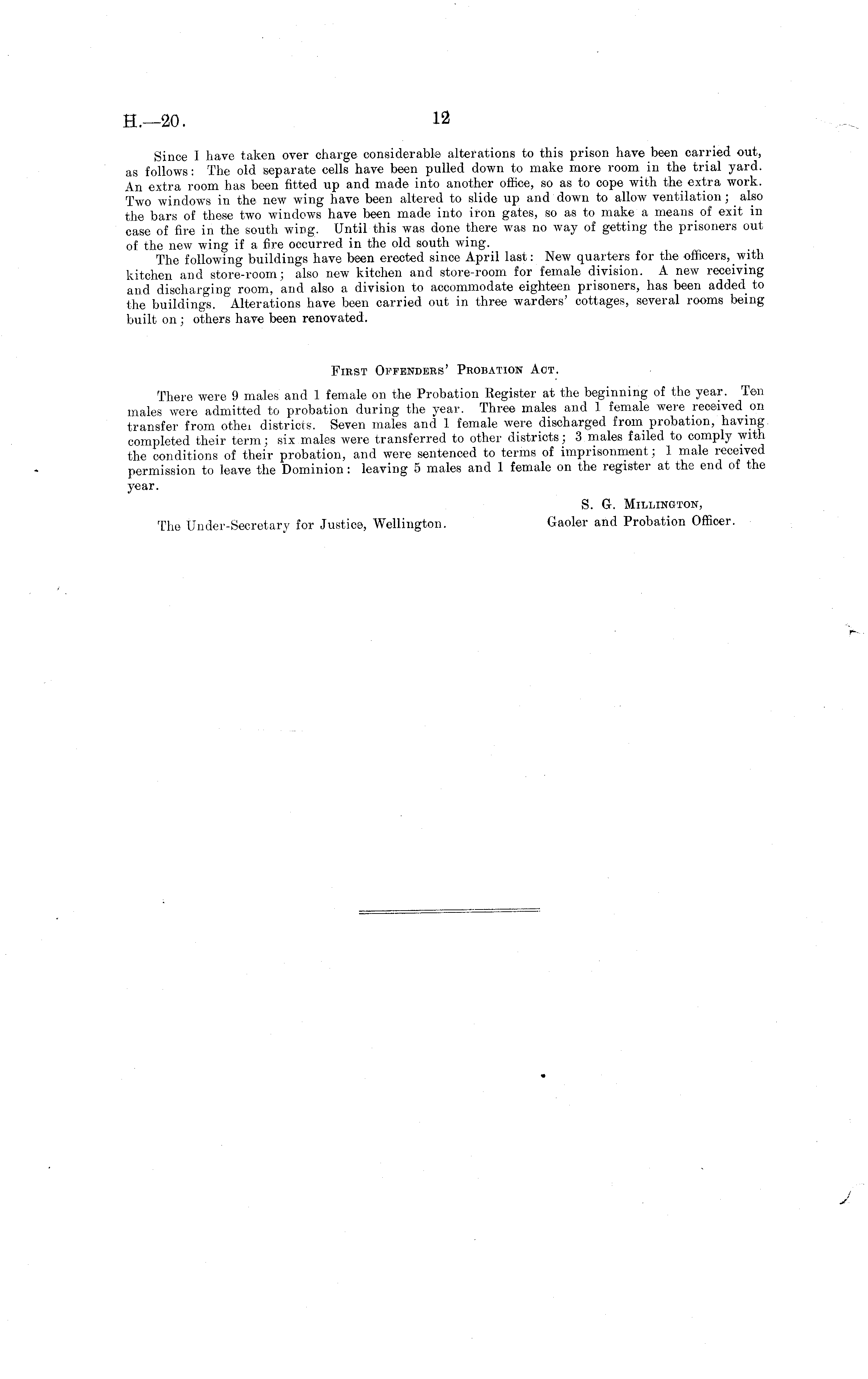 Since I have taken over charge considerable alterations to this prison have been carried out, as follows: The old separate cells have been pulled down to make more room in the trial yard. An extra room has been fitted up and made into another office, so as to cope with the extra work. Two windows in the new wing have been altered to slide up and down to allow ventilation; also the bars of these two windows have been made into iron gates, so as to make a means of exit in case of fire in the south wing. Until this was done there was no way of getting the prisoners out of the new wing if a fire occurred in the old south wing. The following buildings have been erected since April last: New quarters for the officers, with kitchen and store-room; also new kitchen and store-room for female division. A new receiving and discharging room., and also a division to accommodate eighteen prisoners, has been added to the buildings. Alterations have been carried out in three warders' cottages, several rooms being built on ; others have been renovated. Fiest Offenders' Probation Act. There were 9 males and 1 female on the Probation Register at the beginning of the year. Ten males were admitted to probation during the year. Three males and 1 female were received on transfer from othei districts. Seven males and 1 female were discharged from probation, having completed their term; six males were transferred to other districts; 3 males failed to comply with the conditions of their probation, and were sentenced to terms of imprisonment; 1 male received permission to leave the Dominion : leaving 5 males and 1 female on the register at the end of the year. S. G. Millington, The Under-Secretary for Justice, Wellington. Gaoler and Probation Officer.