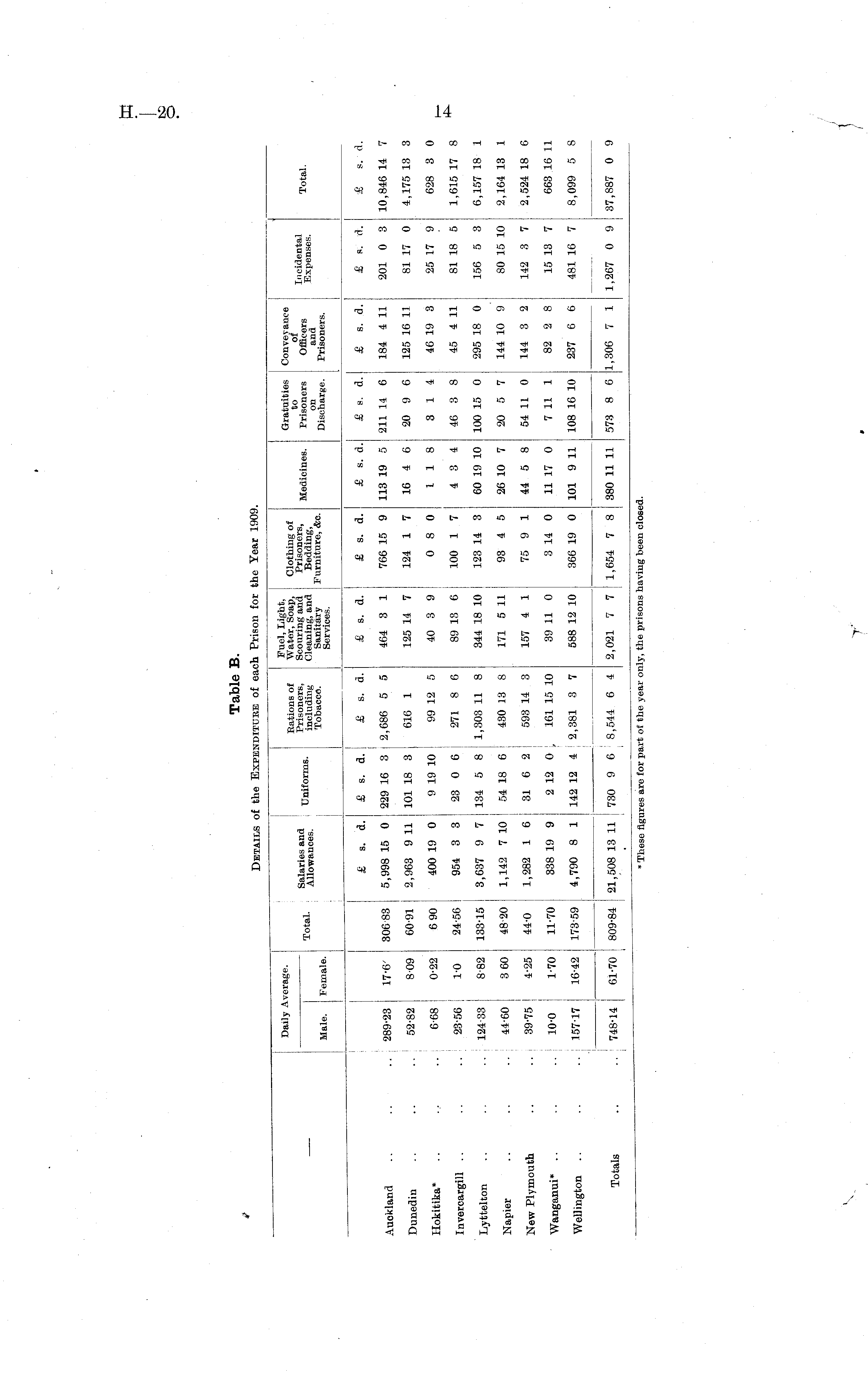 Male. Daily Average. Total. St* ™*»»»- Rations of Prisoners, including Tobacco. Fuel, Light, Water, Soap, ! Clothing of Scouring and ! Prisoners, Cleaning, and Bedding, Sanitary i Furniture, &c. Services. Medicines. Gratuities Conveyance to of Prisoners ! Officers on and Discharge. Prisoners. Incidental Expenses. Total. Fernale. Auckland Dunedin Hokitika* Invercargill .. j .. 289-23 : .. [ 52-82 i I .. j 6-68 J i 23-56 ; 17-6' 8 09 0-22 1-0 17-6' 8 09 0-22 1-0 306 83 60-91 6 90 24-56 S 133-15 I 48-20 j 44-0 11-70 173-59 £ s. d. £ s. d. ! £ s. d. 5,998 15 0 229 16 3 j 2,686 5 5 2,963 9 11 101 18 3 i 616 1 400 19 0 9 19 10 99 12 5 954 3 3 J 23 0 6 I 271 8 6 3,637 9 7 J 134 5 8 j 1,303 11 8 1,142 7 10 54 18 6 430 13 8 1,282 1 6 ; 31 6 2 I 593 14 3 338 19 9 I 2 12 0 ;. 161 15 10 4,790 8 1 I 142 12 i 2,381 3 7 £ s. d. I 464 3 1 J 125 14 7 I 40 3 9 J 89 13 6 344 18 10 i £ s. d. 766 15 9 124 1 7 0 8 0 100 1 7 123 14 3 £ s. d. 113 19 5 16 4 6 118 4 3 4 60 19 10 £ s. d. 211 14 6 20 9 6 3 14 46 3 8 100 15 0 £ s. d. 184 4 11 125 16 11 46 19 3 45 4 11 295 18 0 £ f>. d. 201 0 3 81 17 0 25 17 9 81 18 5 156 5 3 £ s. d. 10,846 14 7 4,175 13 3 628 3 0 1,615 17 8 6,157 18 1 Lyttelton .. ; 124-33 8-82 8-82 Napier .. ; 44-60 3 60 3 60 171 5 11 93 4 5 26 10 7 20 5 7 144 10 9 80 15 10 2,164 13 1 New Plymouth .. : 39-75 I 4-25 4-25 157 4 1 75 9 1 44 5 8 54 11 0 144 3 2 142 3 7 2,524 18 6 Wanganui* .. 10-0 j 1-70 1-70 39 11 0 3 14 0 11 17 0 7 11 1 82 2 8 15 13 7 663 16 11 Wellington .. .. I 157-17 J 16-42 16-42 588 12 10 ! 366 19 0 101 9 11 108 16 10 237 6 6 481 16 7 8,099 5 8 i i 21,508 13 11 J 730 9 6 8,544 6 4 Totals i I .. : 748-14 i 61-70 809-84 2,021 7 7 1,654 7 8 380 11 11 573 8 6 1,306 7 1 1,267 0 9 37,887 0 9