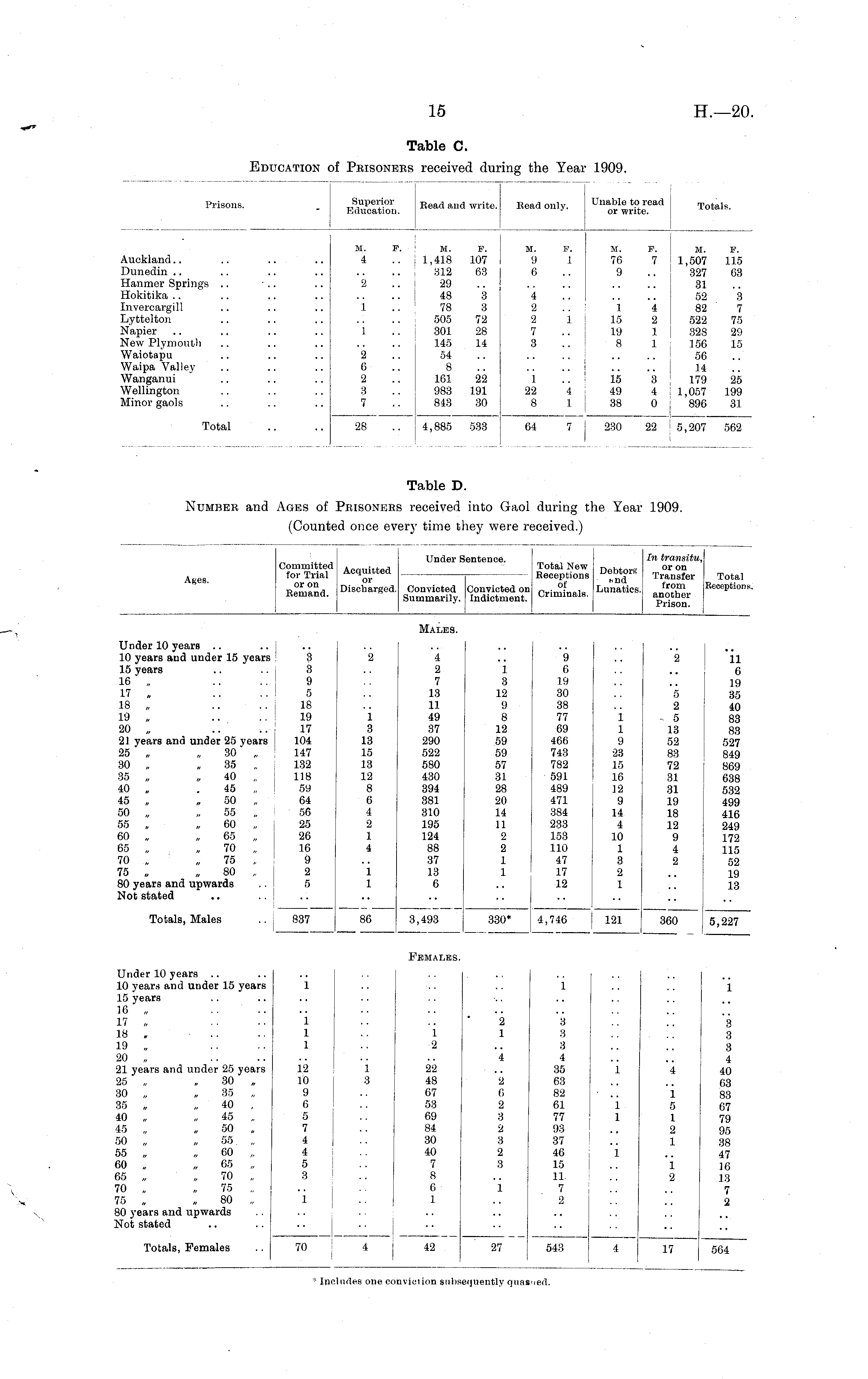 Table D. Number and Ages of Prisoners received into Gaol during the Year 1909. (Counted once every time they were received.)