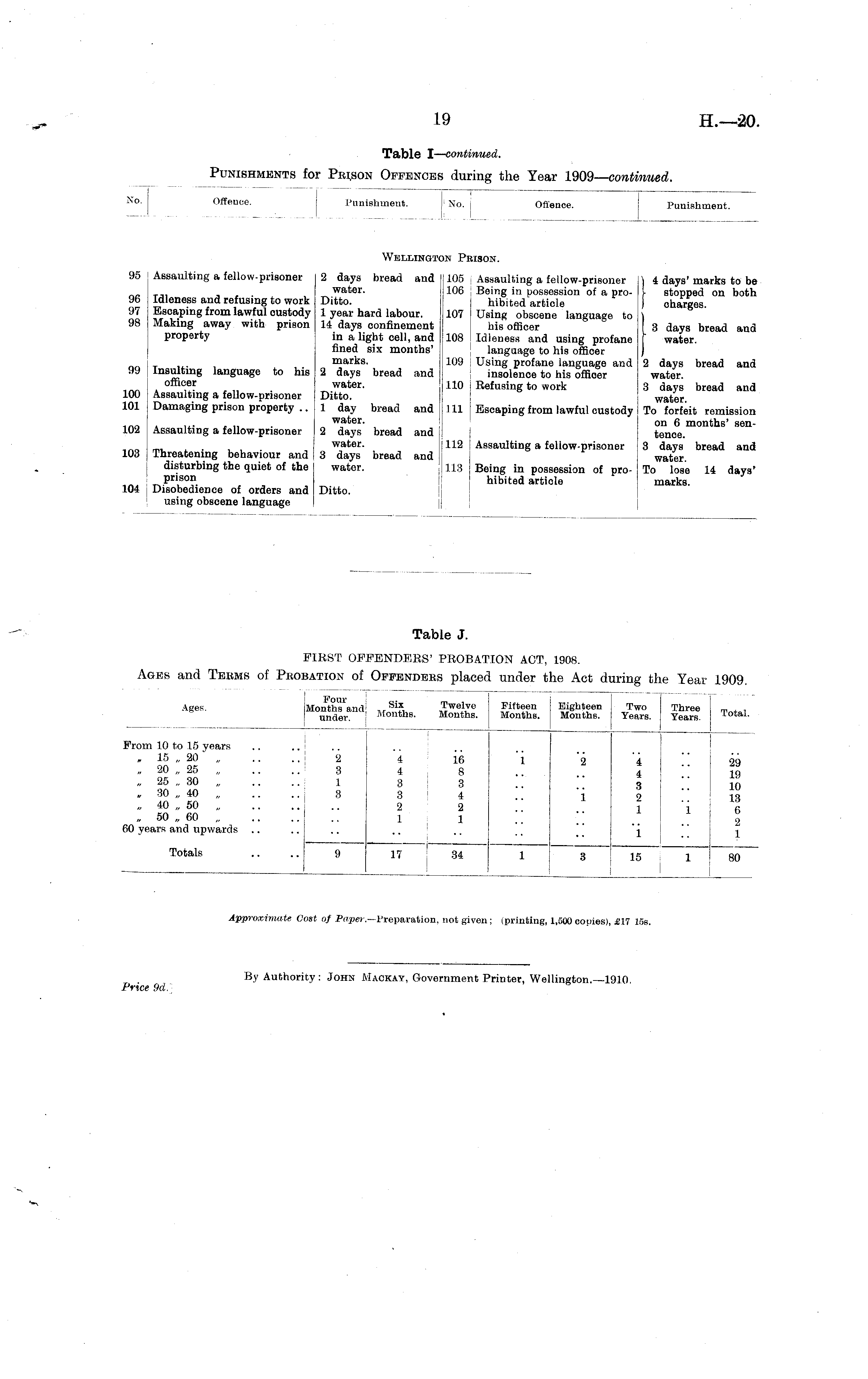Table I — continued. Punishments for Prison Offences during the Year 1909— continued.