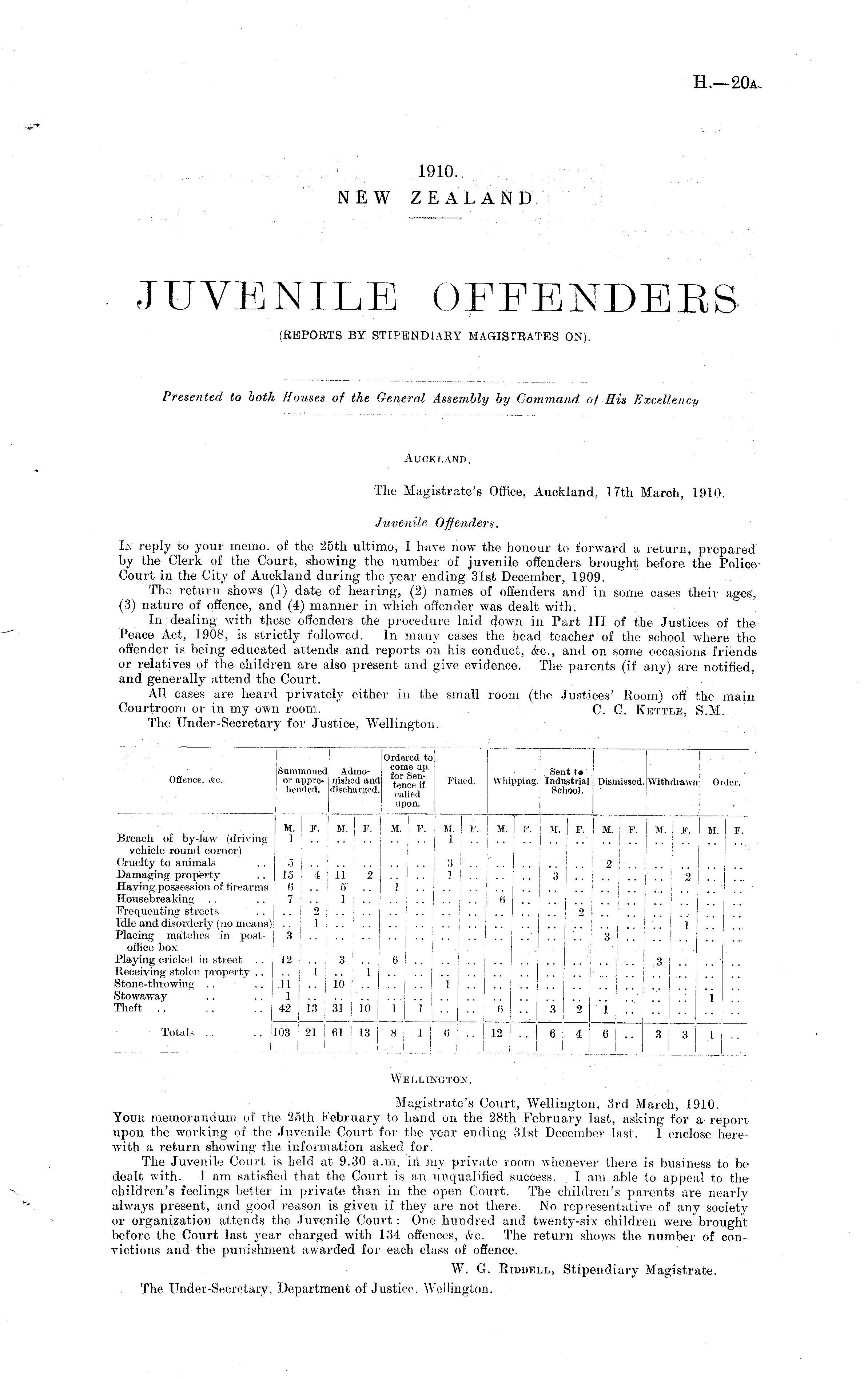 Wellington. Magistrate's Court, Wellington, 3rd March, 1910. Youit memorandum of the 25th February to hand on the 28th February last, asking for a report upon the working of the Juvenile Court for the year ending 31st December last. I enclose herewith a return showing the information asked for. The Juvenile Court is held at 9.30 a.m. in my private room whenever there is business to be dealt, with. lam satisfied that the Court is an unqualified success. lam able to appeal to the children's feelings better in private than in the open Court. The children's parents are nearly always present, and good reason is given if they are not there. No representative of any society or organization attends the Juvenile Court: One hundred and twenty-six children were brought before the Court last year charged with 134 offences, Are. The return shows the number of convictions and the punishment awarded for each class of offence. W. G. Riddbll, Stipendiary Magistrate. The Under-Secretary, Department of Justice. Wellington.