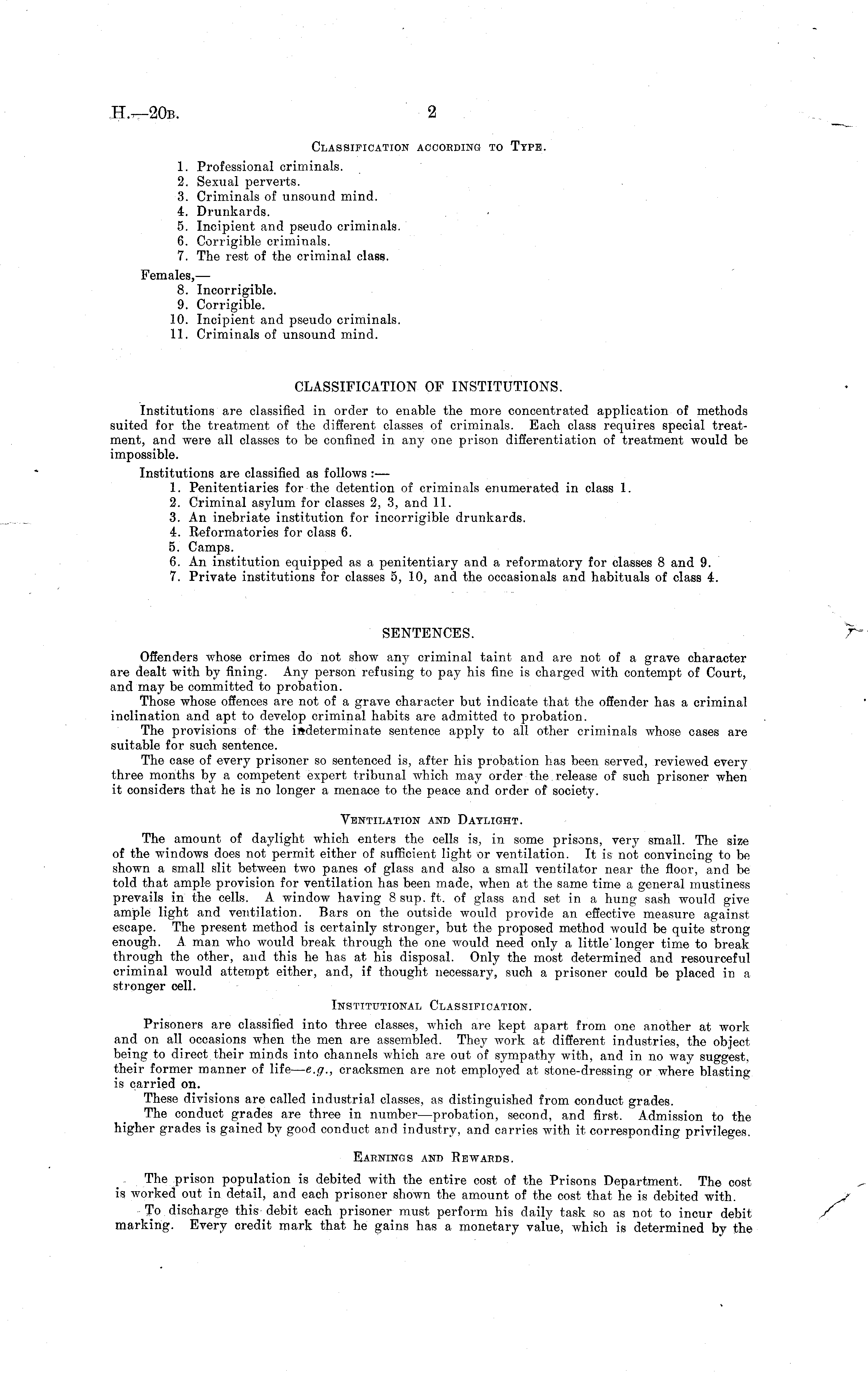 Classification according to Type. 1. Professional criminals. 2. Sexual perverts. 3. Criminals of unsound mind. 4. Drunkards. 5. Incipient and pseudo criminals. 6. Corrigible criminals. 7. The rest of the criminal class. Females, — 8. Incorrigible. 9. Corrigible. 10. Incipient and pseudo criminals. 11. Criminals of unsound mind. CLASSIFICATION OF INSTITUTIONS. Institutions are classified in order to enable the more concentrated application of methods suited for the treatment of the different classes of criminals. Each class requires special treatment, and were all classes to be confined in any one prison differentiation of treatment would be impossible. Institutions are classified as follows :— 1. Penitentiaries for the detention of criminals enumerated in class 1. 2. Criminal asylum for classes 2, 3, and 11. 3. An inebriate institution for incorrigible drunkards. 4. Reformatories for class 6. 5. Camps. 6. An institution equipped as a penitentiary and a reformatory for classes 8 and 9. 7. Private institutions for classes 5, 10, and the occasionals and habituals of class 4. SENTENCES. Offenders whose crimes do not show an}' criminal taint and are not of a grave character are dealt with by fining. Any person refusing to pay his fine is charged with contempt of Court, and may be committed to probation. Those whose offences are not of a grave character but indicate that the offender has a criminal inclination and apt to develop criminal habits are admitted to probation. The provisions of the indeterminate sentence apply to all other criminals whose cases are suitable for such sentence. The case of every prisoner so sentenced is, after his probation has been served, reviewed every three months by a competent expert tribunal which may order the.release of such prisoner when it considers that he is no longer a menace to the peace and order of society. Ventilation and Daylight. The amount of daylight which enters the cells is, in some prisons, very small. The size of the windows does not permit either of sufficient light or ventilation. It is not convincing to be shown a small slit between two panes of glass and also a small ventilator near the floor, and be told that ample provision for ventilation has been made, when at the same time a general mustiness prevails in the cells. A window having 8 sup. ft. of glass and set in a hung sash would give ample light and ventilation. Bars on the outside would provide an effective measure against escape. The present method is certainly stronger, but the proposed method would be quite strong enough. A man who would break through the one would need only a little'longer time to break through the other, and this he has at his disposal. Only the most determined and resourceful criminal would attempt either, and, if thought necessary, such a prisoner could be placed in a stronger cell. Institutional Classification. Prisoners are classified into three classes, which are kept apart from one another at work and on all occasions when the men are assembled. They work at different industries, the object being to direct their minds into channels which are out of sympathy with, and in no way suggest, their former manner of life— e.g., cracksmen are not employed at stone-dressing or where blasting is carried on. These divisions are called industrial classes, as distinguished from conduct grades. The conduct grades are three in number —probation, second, and first. Admission to the higher grades is gained by good conduct and industry, and carries with it corresponding privileges. Earnings and Rewards. The prison population is debited with the entire cost of the Prisons Department. The cost is worked out in detail, and each prisoner shown the amount of the cost that he is debited with. To discharge this debit each prisoner must perform his daily task so as not to incur debit marking. Every credit mark that he gains has a monetary value, which is determined by the