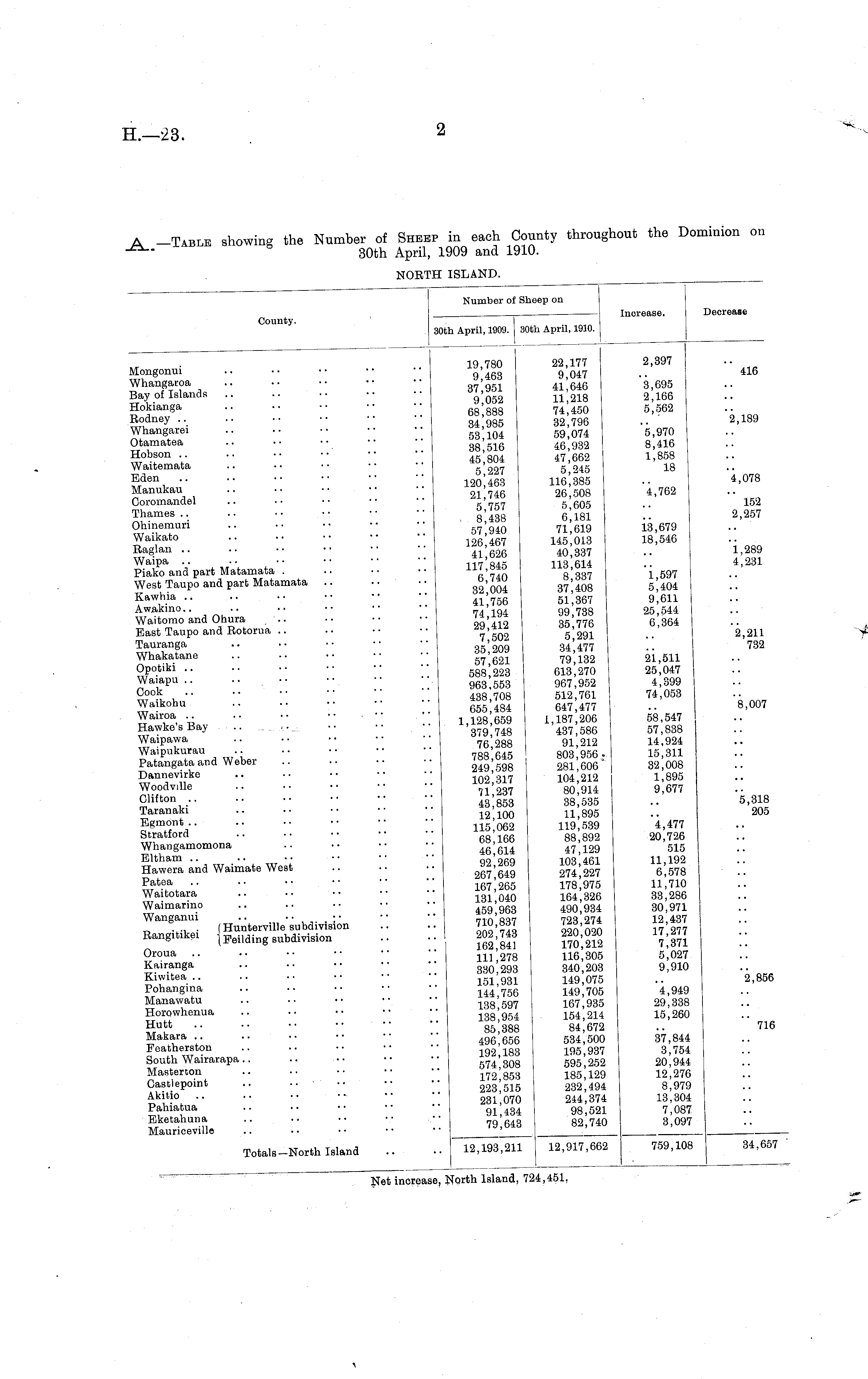 A.-Table showing the Number of Sheep in each County throughout the Dominion on 30th April, 1909 and 1910. NORTH ISLAND.