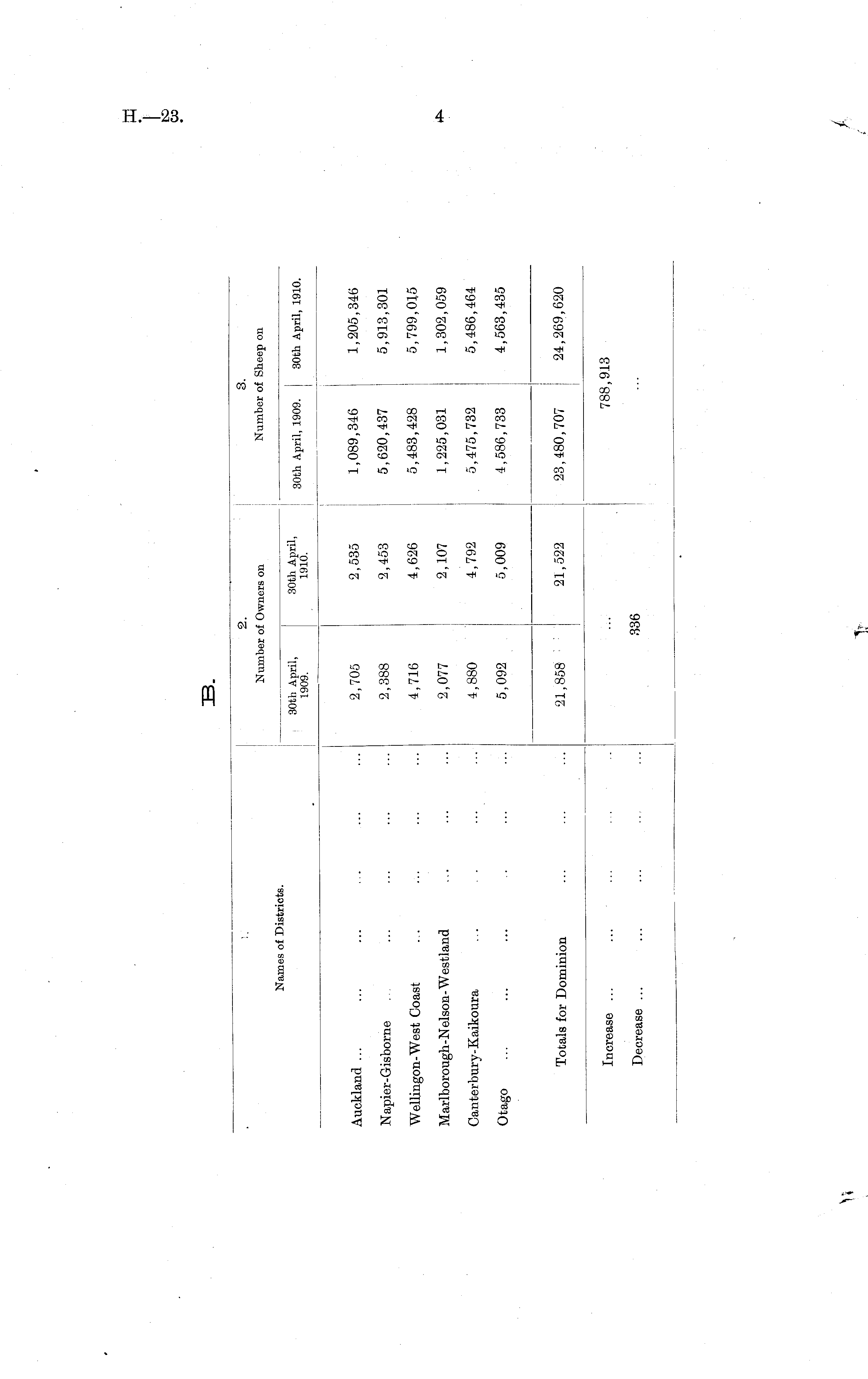 2. S. Number of Owners on Number of Sheep on Names of Districts. 30th April, 1909. 30th April, 1910. 30th April, 1909. I 30th April, 1910. Auckland ... 2,705 2,535 1,089,346 5,620,437 1,205,346 5,913,301 Napier-Gisborne 2,388 2,453 Wellingon-West Coast 4,716 4,626 5,483,428 5,799,015 Marlborough-Nelson- Westland 2,077 2,107 1,225,031 1,302,059 Canterbury- Kaikoura 4,880 4,792 5,475,732 5,486,464 Otago 5,092 5,009 4,586,733 4,563,435 Totals for Dominion 21,858 21,522 23,480,707 24,269,620 Increase ... 788,9.13 Decrease ... 336