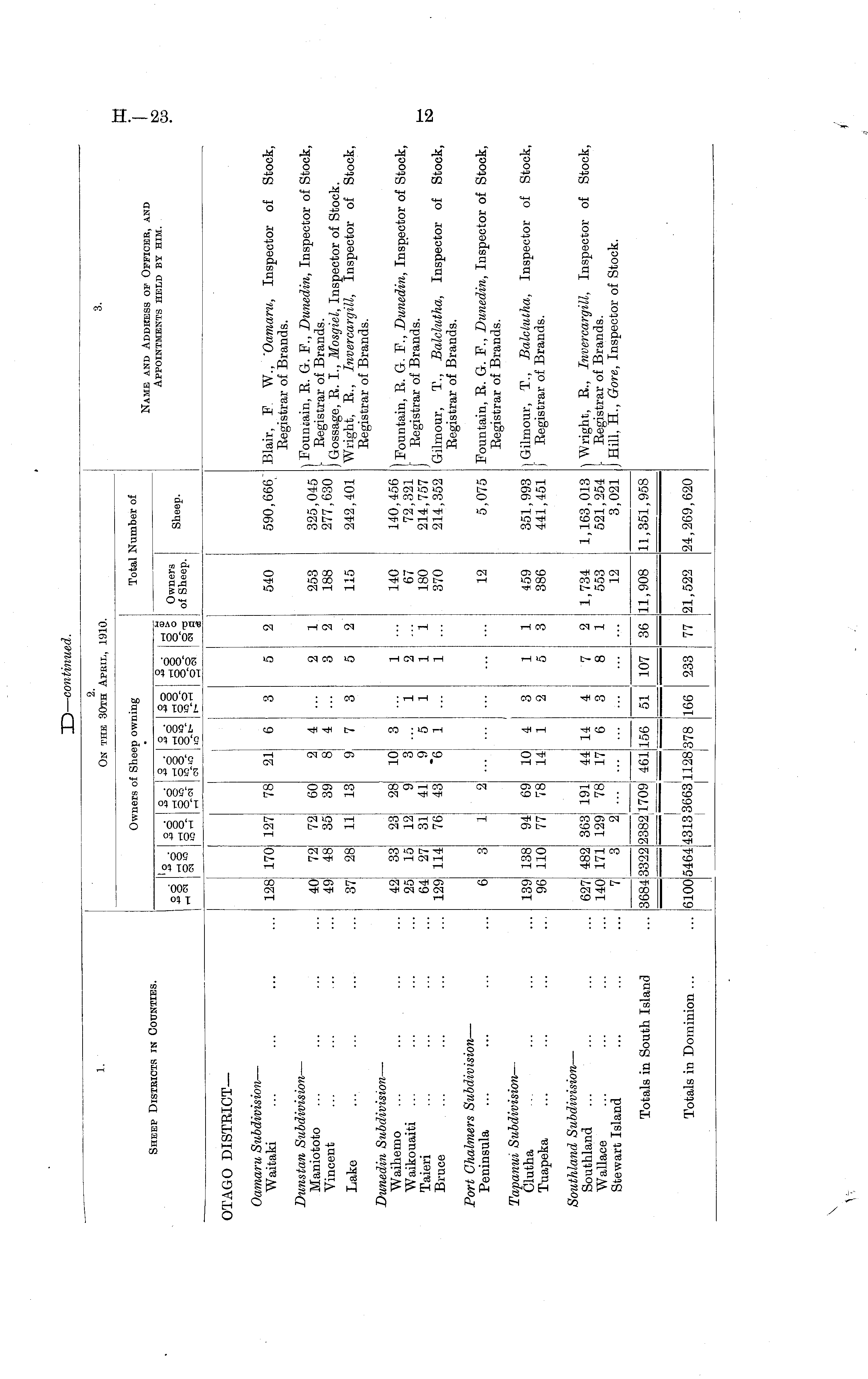 1. 2. On the 30th April, 1910. 3. Sheep Districts in Counties. Owners of Sheep owning Total Number of Name and Addkess of Officer, and Appointments held by him. Io o d "° d -» O HO rt CN O O O 0<-,.°,.__.m -So O O O O Hn °£ O HO HO HO HO On <=> ° 3°. 8°- S°- 8"°- SO 8°- OH Owners of Sheep. Sheep. OTAGO DISTRICT— Oamaru Subdivision — Waitaki 78; 21 540 590,666" Blair, F. W., 'Oamaru, Inspector of Stock, Registrar of Brands. 128 170 127 Dunstan Subdivision — Maniototo Vincent 40 49 72 48 72 35 60 39 2 8 4 4 2 3 1 2 253 188 325,045 277,630 \ Fountain, R. G. F., Dunedin, Inspector of Stock, I Registrar of Brands. J Gossage, R. I., Mosgiel, Inspector of Stock. Wright, R., Invercargill, Inspector of Stock, Registrar of Brands. Lake 37 28 11 13 9 7 3 5 2 115 242,401 Dunedin Subdivision — Waihemo Waikouaiti ... Taieri Bruce 42 25 64 129 33 15 27 114 23 12 31 76 28 41 43 10 3 9 "6 3 "5 1 1 1 2 1 1 i 140 67 180 370 140,456 72,321 214,757 214,352 [Fountain, R. G. F., Dunedin, Inspector of Stock, j" Registrar of Brands. Gilmour, T., Balclutha, Inspector of Stock, Registrar of Brands. Port Chalmers Subdivision — Peninsula 12 5,075 Fountain, R. G. F., Dunedin, Inspector of Stock, Registrar of Brands. Tapanui Subdivision — Clutha Tuapeka 139! 96! 138 110 94 77 69 78 10 14 4 1 3 2 1 5 1 3 459 386 351,993 441,451 ] Gilmour, T., Balclutha, Inspector of Stock, I Registrar of Brands. Southland Subdivision — Southland Wallace Stewart Island 627 140 7 482 171 3 363 129 2 191 78 44 17 14 6 4 3 7 8 2 1 1,734 553 12 1,163,013 521,254 3,021 \ Wright, R., Invercargill, Inspector of Stock, t Registrar of Brands. ) Hill, H., Gore, Inspector of Stock. i — Totals in South Island 3684 3322 2382 1 |l709 461 156 51 107 36 11,908 11,351,958 L__j i i 1 I Totals in Dominion ... 5464 1128: '378 6100 4313 3663 166 233 77 21,522 124,269,620