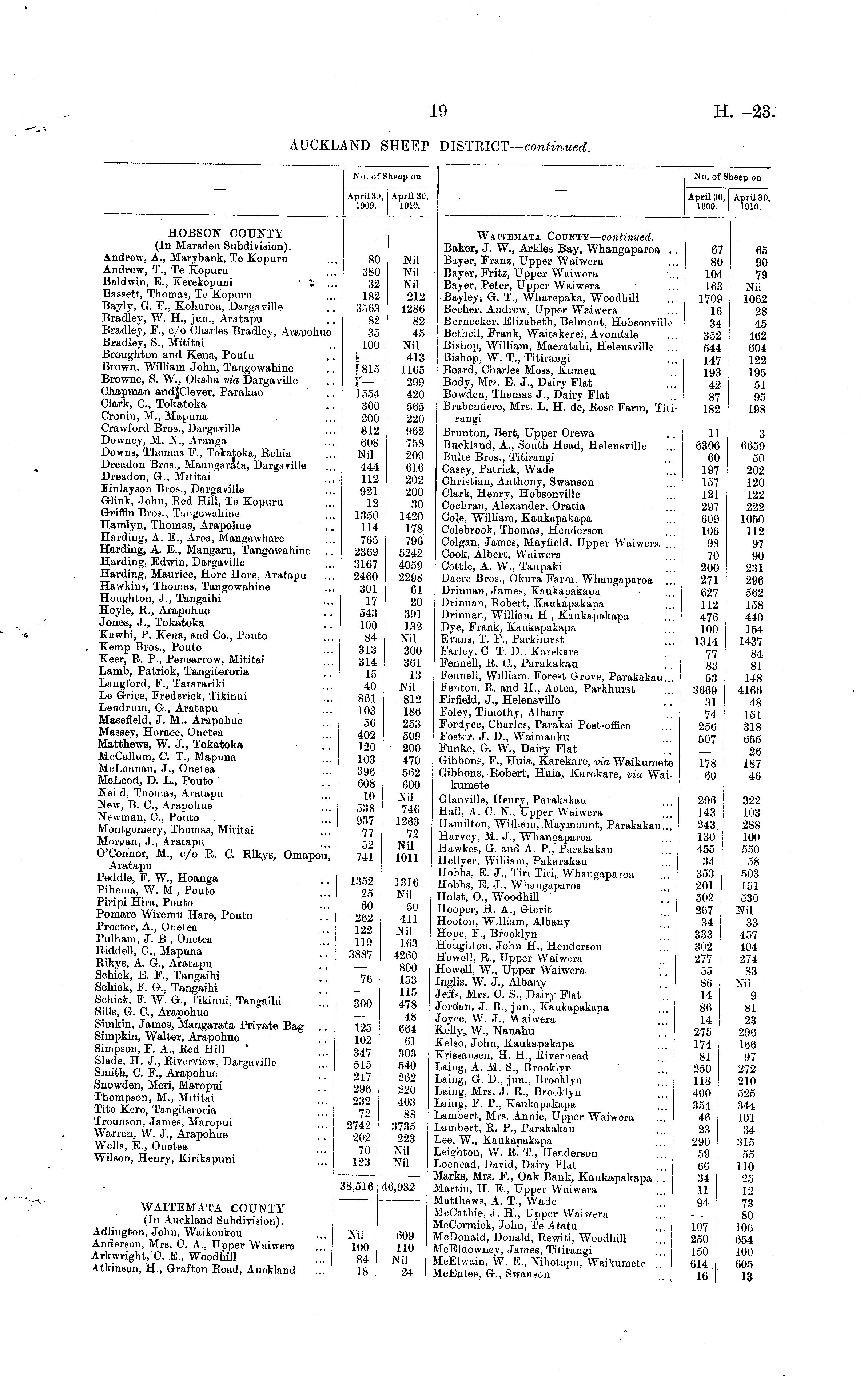 No. of Sheep on April 30, April 30 1909. 1910. No. of Sheep on April 30, April 3 1908. 1910. April 30, 1910. HOBSON COUNTY (In Marsden Subdivision). Andrew, A., Marybank, Te Kopuru Andrew, T., Te Kopuru Baldwin, E., Kerekopuni * • Bassett, Thomas, Te Kopuru Bayly, G. P., Kohuroa, Dargaville Bradley, W. H., jun., Aratapu F., c/o Charles Bradley, Arapohue Bradley, S., Mititai Broughton and Kena, Poutu Brown, William John, Tangowahine Browne, S. W., Okaha via Dargaville Chapman andfClever, Parakao Clark, C, Tokatoka Cronin, M., Mapuna Crawford Bros., Dargaville Downey, M. N., Aranga Downs, Thomas F., Tokatoka, Eehia Dreadon Bros., Maungarata, Dargaville Dreadon, G., Mititai Finlayson Bros., Dargaville G-link, John, Bed Hill, Te Kopuru G-rifBn Bros., Tangowahine Hamlyn, Thomas, Arapohue Harding, A. E., Aroa, Mangawhare Harding, A. E., Mangaru, Tangowahine .. Harding, Edwin, Dargaville Harding, Maurice, Hore Hore, Aratapu Hawkins, Thomas, Tangowahine Houghton, J., Tangaihi Hoyle, R., Arapohue Jones, J., Tokatoka Kawhi, H, Kena, and Co., Pouto Kemp Bros., Pouto Keer, R. P., Penoarrow, Mititai Lamb, Patrick, Tangiteroria Langt'ord, if., Tatarariki Le Grice, Frederick, Tikinui Lendrum, G., Aratapu Masefield, J. M., Arapohue Massey, Horace, Onetea Matthews, W. J., Tokatoka ".' McCullum, 0. T., Mapuna McLennan, J., Onetea McLeod, D. L., Pouto .". Neild, Thomas, Aralapu New, B. C, Arapohue Newman, 0., Pouto Montgomery, Thomas, Mititai ... i Mors an, J., Aratapu O'Connor, M., c/o R. C. Rikys, Omapou, Aratapu Peddle, F. W., Hoanga Pihema, W. M., Pouto Piripi Hira, Pouto Pomare Wiremu Hare, Pouto .. | Proctor, A., Onetea Pulliam, J. B., Onetea Riddell, G., Mapuna Rikys, A. G., Aratapu Schick, E. F., Tangaihi Schick, F. G., Tangaihi Schick, F. W. G-., 1'ikinui, Tangaihi ]," Sills, G. G, Arapohue Simkin, James, Mangarata Private Bag Simpkin, Walter, Arapohue Simpson, F. A., Red Hill Slade, H. J., Riverview, Dargaville Smith, C. F., Arapohue ' ".' Snowden, Meri, Maropui Thompson, M., Mititai Tito Kere, Tangiteroria James, Maropui Warren, W. J., Arapohue Wells, E., Ouetea Wilson, Henry, Kirikapuni 80 380 32 182 3563 82 35 100 f.815 I r— 1554 300 200 812 608 Nil 444 112 921 12 1350 114 765 2369 3167 2460 301 17 543 100 84 313 314 15 40 861 103 56 402 120 103 396 608 10 538 937 77 52 741 ) Nil ) Nil ! Nil ! 212 ! 4286 ! 82 i 45 I Nil 413 i 1165 299 420 I 565 I 220 : 962 758 209 616 '. 202 200 30 1420 178 796 5242 4059 2298 61 20 391 132 Nil 300 361 13 Nil 812 186 253 509 200 470 562 600 Nil 746 1263 72 Nil 1011 Waitemata County— continued. Baker, J. W., Arkles Bay, Whangaparoa .. Bayer, Franz, Upper Waiwera Bayer, Fritz, Upper Waiwera Bayer, Peter, Upper Waiwera Bayley, G. T., Wharepaka, Woodhill Becher, Andrew, Upper Waiwera Berneeker, Elizabeth, Belmont, Hobsonville Bethell, Frank, Waitakerei, Avondale Bishop, William, Maeratahi, Helensville Bishop, W. T., Titirangi Board, Charles Moss, Kumeu Body, Mr.«. E. J., Dairy Plat Bowden, Thomas J., Dairy Flat Brabendere, Mrs. L. H. de, Rose Farm, Titirangi Brunton, Bert, Upper Orewa Buekland, A., South Head, Helensville Bulte Bros., Titirangi Casey, Patrick, Wade Christian, Anthony, Swanson Clark, Henry, Hobsonville Cochran, Alexander, Oratia Cole, William, Kaukapakapa Colebrook, Thomas, Henderson Colgan, James, Mayfield, Upper Waiwera Cook, Albert, Waiwera Cottie, A. W., Taupaki .., Daere Bros., Okura Farm, Whangaparoa Drinnan, James, Kaukapakapa Drinnan, Robert, Kaukapakapa Drinnan, William H , Kaukapakapa Dye, Prank, Kaukapakapa Evans, T. F., Parkhurst Parley, C. T. D.. Karekare Fennell, R. C, Parakakau ,. Feimell, William, Forest Grove, Parakakau... Fenton. R. and H., Aotea, Parkhurst Firfield, J., Helensville Foley, Timothy, Albany | Fordyce, Charles, Parakai Post-office Foster, J. D., Waimaiiku Funke, G. W., Dairy Flat '." Gibbons, F., Huia, Karekare, via Waikumete Gibbons, Robert, Huia, Karekare, via Waikumete Glanville, Henry, Parakakau Hall, A. C. N., Upper Waiwera '.['. Hamilton, William, Maymount, Parakakau... Harvey, M. J., Whangaparoa Hawkes, G. and A. P., Parakakau Hellyer, William, Pakarakau Hobbs, E. J., Tiri Tiri, Whangaparoa Hobbs, E. J., Whangaparoa Hoist, O., Woodhill Hooper, H. A., Glorit Hooton, William, Albany lope, P., Brooklyn loughton, John H., Henderson lowell, R., Upper Waiwera lowell, W., Upper Waiwera Jiglis, W. J., Albany effs, Mrs. C. S., Dairy Flat ordan, J. B., jun., Kaukapakapa oyce, W. J., Waiwera Celly,. W., Nanahu felso, John, Kaukapakapa irissansen, S. H., Riverhead jaing, A. M. S., Brooklyn jaing, G. D., jun., Brooklyn jaing, Mrs. J. R., Brooklyn jaing, P. P., Kaukapakapa jambert, Mrs. Annie, Upper Waiwera jambert, R. P., Parakakau jee, W., Kaukapakapa jeighton, W. R. T., Henderson jochead, David, Dairy Flat larks, Mrs. F., Oak Bank, Kaukapakapa .. Martin, H. E., Upper Waiwera latthews, A. T., Wade ,.[ tlcCathie, J. H., Upper Waiwera icCormick, John, Te Atatu tcDonald, Donald, Rewiti, Woodhill [cEldowney, James, Titirangi [cElwain, W. E., Nihotapu, Waikumete icEntee, G., Swanson 67 80 104 163 1709 16 34 352 544 147 193 42 87 182 11 6306 60 197 157 121 297 609 106 98 70 200 271 627 112 476 100 1314 77 83 53 3669 31 74 256 507 65 90 79 Nil 1062 28 45 462 604 122 195 51 95 198 3 6659 50 202 120 122 222 1050 112 97 90 231 296 562 158 440 154 1437 84 81 148 4166 48 151 318 655 26 187 46 178 60 1352 25 60 I 262 122 119 3887 76 300 1316 Nil 50 411 Nil 163 4260 800 153 115 478 48 664 61 303 540 262 220 403 88 3735 223 Nil Nil 296 i 143 ! 243 130 455 ! 34 353 201 I 502 I 267 i 34 333 ! 302 277 55 86 14 86 14 275 174 81 250 118 400 354 46 23 290 59 66 34 11 94 322 103 288 100 550 58 503 151 530 Nil 33 457 404 274 83 Nil 9 81 23 296 166 97 272 210 525 344 101 34 315 55 110 25 12 73 80 106 654 100 605 13 125 102 347 515 217 296 232 72 2742 202 70 123 38,516 46,932 WAITEMATA COUNTY (In Auckland Subdivision). Adlington, John, Waikoukou Anderson, Mrs. C. A., Upper Waiwera Arkwright, C. E., Woodhill '.. Atkinson, H , Grafton Road, A