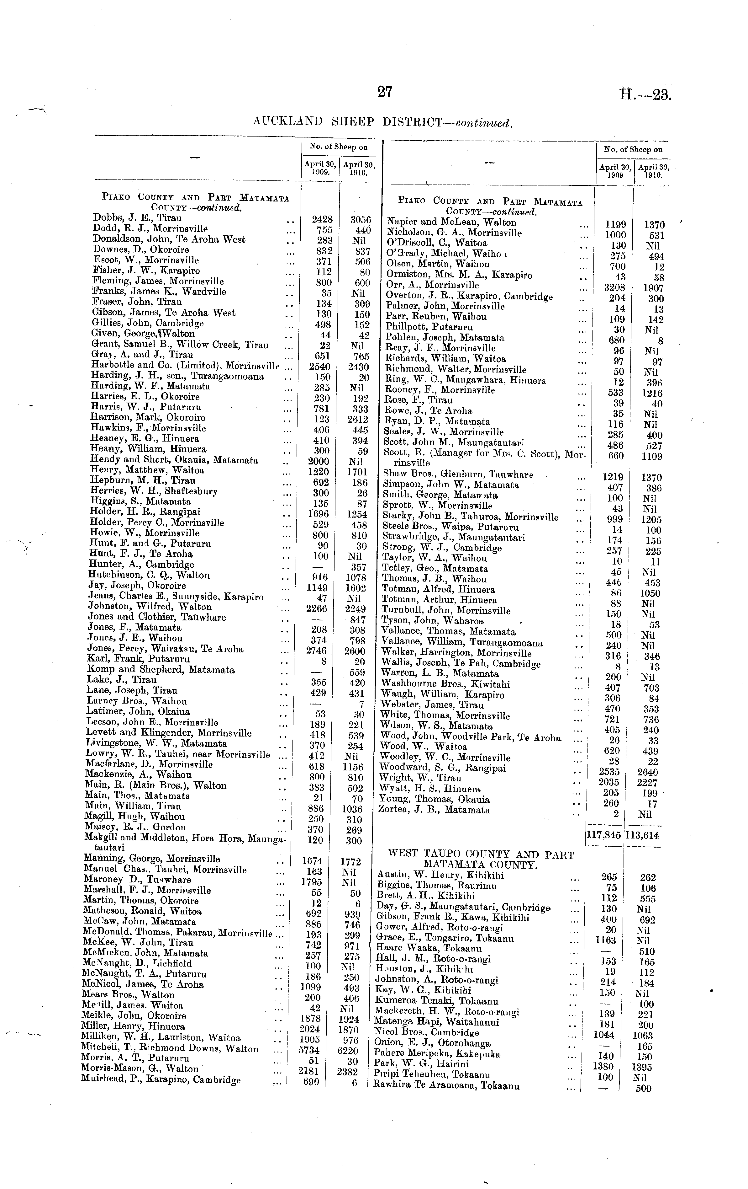 No. of Sheep on April 30, April 3 1909. 1910. April 30, 1910. No. of Sheep on April 30, April 30, 1909 1910. Piako County and Paet Matamata County— continued. Dobbs, J. B., Tirau .. 2428 305f Dodd, R. J., Morrinsville ... 755 44( Donaldson, John, Te Aroha West .. 283 Nil Downes, D., Okoroire ... 832 83"/ Escot, W., Morrinsyille ... 371 50f Fisher, J. W., Karapiro ... 112 8C Fleming, James, Morrinsville ... 800 60C Franks, James K., Wardville .. 35 Nil FTaser, John, Tirau .. 134 309 Gibson, James, Te Aroha West .. 130 150 Gillies, John, Cambridge 498 152 Given, George, Walton .. 44 42 Grant, Samuel B., Willow Creek, Tirau ... 22 Nil Gray, A. and J., Tirau ... 651 765 Harbottle and Co. (Limited), Morrinsville ... 2540 2430 Harding, J. H., sen., Turangaomoana .. 150 20 Harding, W. F., Matamata ... 285 Nil Harries, B. L., Okoroire ... 230 192 Harris, W. J., Putaruru ... 781 333 Harrison, Mark, Okoroire .. 123 2612 Hawkins, F., Morrinsville ... 406 445 Heaney, B. G., Hinuera ... 410 394 Heany, William, Hinuera .. 300 59 Hendy and Short, Okauia, Matamata ... 2000 Nil Henry, Matthew, Waitoa ... 1220 1701 Hepburn, M. H., Tirau ... 692 186 Herries, W. H., Shaftesbury ... 300 26 Higgins, S., Matamata ... 135 87 Holder, H. R., Rangipai ., 1696 1254 Holder, Percy C, Morrinsville ... 529 458 Howie, W., Morrinsville ... 800 810 Hunt, F. an-i G., Putaruru ... 90 30 Hunt, F. J., Te Aroha .. 100 Nil Hunter, A., Cambridge I 357 Hutchinson, C. Q., Walton .. 916 1078 Jay, Joseph, Okoroire 1149 1602 Jeans, Charles E., Sunnyside, Karapiro ... ! 47 Nil Johnston, Wilfred, Walton ... j 2266 2249 Jones and Clothier, Tauwhare .. 847 Jones, F., Matamata .. 208 308 Jones, J. B., Waihou ... 374 793 Jones, Percy, Wairakau, Te Aroha ... 2746 2600 Karl, Frank, Putaruru .. 8 20 Kemp and Shepherd, Matamata .. 559 Lake, J., Tirau .. 355 420 Lane, Joseph, Tirau .. 429 431 Larney Bros., Waihou ... 7 Latimer, John, Okaiua .. 53 39 Leeson, John E., Morrinsville ... 189 221 Levett and Klingender, Morrinsville .. 418 ,539 Livingstone, W. W., Matamata .. 370 254 Lowry, W. R., Tauhei, near Morrinsville ... 412 Nil Macfarlane, D., Morrineville ... j 618 1156 Mackenzie, A., Waihou .. ! 800 810 Main, R. (Main Bros.), Walton .. j 383 502 Main, Tlios., Matamata ... 21 70 Main, William. Tirau ... j 886 1036 Magill, Hugh, Waihou .. 250 310 Maisey, R. J.. Gordon ... 370 269 Makgill and Middleton, Hora Hora, Maunga- j 120 300 tautari Manning, George, Morrinsville .. 1674 1772 Manuel Chas.. Tauhei, Morrinsville ... 163 Nil Maroney D., Tmwhare ... 1795 j^j( Marshall, F. J., Morrinsville ," 55 50 Martin, Thomas, Okoroire 12 6 Matheson, Ronald, Waitoa ... 692 939 McCaw, John, Matamata ... 885 746 McDonald, Thomas, Pakarau, Morrinsville ... 193 299 McKee, W. John, Tirau ... 742 971 McMicken, John, Matamata ... 257 275 McNaught, D., T.jchfield .'. jqq jjjj McNaught, T. A., Putaruru ..! i8fj 250 McNicol, James, Te Aroha .. 1099 493 Mears Bros., Walton 200 406 Me'iill, James, Waitoa ... 42 Nil Meikle, John, Okoroire .. 1378 1924 Miller, Henry, Hinuera .. 2024 1870 Milliken, W. H., Lauriston, Waitoa .'. 1 1905 976 Mitchell, T., Richmond Downs, Walton ... 5734 6220 Morris, A. T., Putaruru 51 30 Morris-Mason, G., Walton ... 2181 2'382 Muirhead, P., Karapino, Cambridge ,'." 690 " 6 | 3056 440 Nil 837 506 80 600 Nil 309 150 152 42 Nil 765 2430 20 Nil 192 333 2612 445 394 59 Nil 1701 186 26 87 1254 458 810 30 Nil 357 1078 1602 Nil 2249 847 308 798 2600 20 559 420 431 7 30 221 539 254 Nil 1156 810 502 70 1036 310 269 300 Piako County and Paet Matamata County— continued. Napier and McLean, Walton ... 1199 1370 Nicholson, G. A., Morrinsville ... 1000 531 O'Driscoll, C, Waitoa ".' 130 jjil O'9-rady, Michael, Waiho 1 ... 275 494 Olsen, Martin, Waihou 700 12 Ormiston, Mrs. M. A., Karapiro .. 43 53 Orr, A., Morrinsville 3208 1907 Overton, J. E., Karapiro, Cambridge .. 204 300 Palmer, John, Morrinsville ... 14 13 Parr, Eeuben, Waihou ... jO9 142 Phillpott, Putaruru 30 Nil Pohlen, Joseph, Matamata 680 g Reay, J. F., Morrineville ... j 96 Nil Richards, William, Waitoa ... 97 97 Richmond, Walter, Morrinsville ... 50 Nil Ring, W. C, Mangawhara, Hinuera ... j 12 39(i Rooney, P., Morrinsville ... 533 J2i6 Rose, F., Tirau .. 39 40 Rowe, J., Te Aroha ... 35 j^ Ryan, D. P., Matamata ng jjjj Scales, J. W., Morrinsville ... 285 400 Scott, John M., Maungatautari 486 527 Scott, R. (Manager for Mrs. C. Scott), Mor- 660 I 1109 rinsville Shaw Bros., Glenburn, Tauwhare 1219 1370 Simpson, John W., Matamata ... 407 ggg Smith, George, Matatrata .... jjjj Sprott, W., Morrinsnille ... ! 43 jjjj Starky, John B., Tahuroa, Morrinsville ... : 999 1205 Steele Bros., Waipa, Putaruru ... j 14 j iqq Strawbridge, J., Maungatautari ",' 174 j i5(i Strong, W. J., Cambridge j ook Taylor, W. A., Waihpu ... 10 \y Tetley, Geo., Matamata "' 45 j^il Thomas, J. B., Waihou aar ' **•> lotman, Alfred, Hinuera 8fi ]ftt ;n otman, Arthur, Hinuera gg | jj-jj Turnbull, John, Morrinsville i W ' N; , Tyson, John, Waharoa . jg 53 Vallance, Thomas, Matamata .. goo jjy Vallanoe, William, Turangaomoana .. j 240 Nil Walker, Harrington, Morrinsville . . ' 315 , 346 Wallis, Joseph, Te Pah, Cambridge ... g 13 Warren, L. B., Matamata .. 200 Nil Washbourne Bros., Kiwitahi ... ! 407 j 703 Waugh, William, Karapiro ... 396 84 Webster, James, Tirau ... 47Q j ggg White, Thomas, Morrinsville ... ; 721 736 Wilson, W. S., Matamata 495 I 2 40 Wood, John, Woodville Park, Te Aroha '".I or „ Wood, W., Waitoa J* Woodley, W. C, Morrineville '." \ 28 : 22 Woodward, S. G., Rangipai j ome I 9 KAn WrigH W I; 2 2 l^ Wyatt, H. S., Hinuera 20 k 1Q q Young, Thomas, Okauia '" I 260 ! 17 Zortea, J. B., Matamata \\ 2 1772 Nil Nil 50 6 939 746 299 971 275 : Nil 250 , 493 406 ■ Nil 1924 ] 1870 ] 976 ( 6220 ] 30 ] 2382 1 6 \l 117,845 113,614 WEST TAUPO COUNTY AND PART MATAMATA COUNTY. Austin, W. Henry, Kihikihi ... 265 ! 262 Biggins, Thomas, Raurimu ... ! 75 J 106 Brett, A. H., Kihikihi . I 112 ' 355 Day, G-. S., Maungatautari, Cambridge 