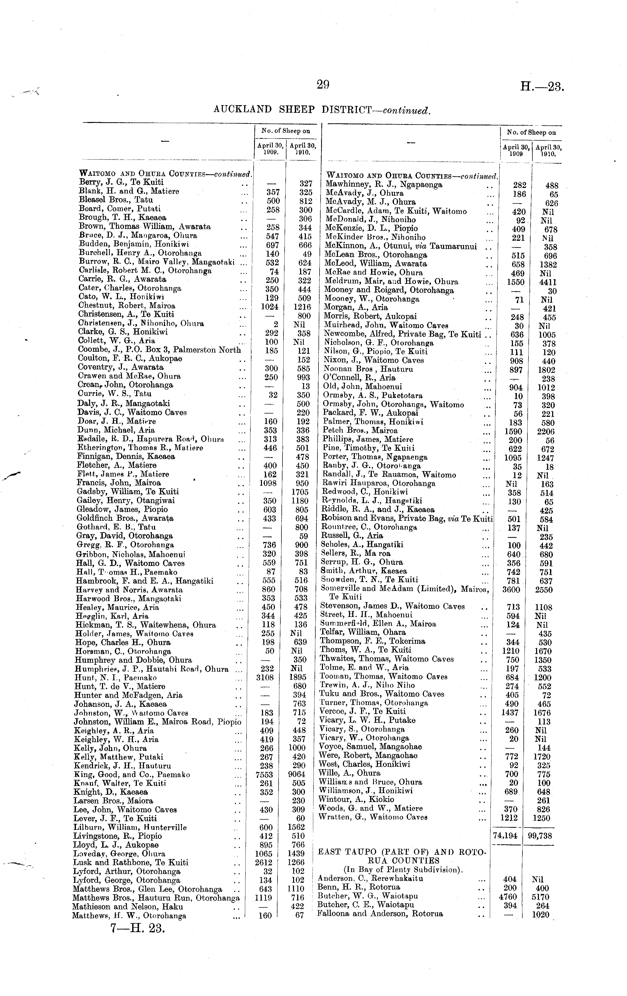 April 30, 1909. No. of Sheep on April 30, 1910. No. of Sheep on April 30, April* 1909 1910. April 30, 1910. Waitomo and Ohuea Counties— continued. Berry, J. G., Te Kuiti Blank, H. and G., Matiere Bleasel Bros., Tatu Board, Comer, Putati Brough, T. H, Kaeaea Brown, Thomas Wilham, Awarata Bruce, D. J., Mangaroa, Ohura Budden, Benjamin, Honikiwi Burchell, Henry A., Otorohanga Burrow, R. C, iWairo Valley, Mangaotaki ... Carlisle, Robert M. C., Otorohanga Carrie, R. G., Awarata Cater, Charles, Otorohanga Cato, W. L., Honikiwi Chestnut, Robert, Mairoa Christensen, A., Te Kuiti Christensen, J., Nihoniho, Ohura Clarke, G. S., Honikiwi Collett, W. &., Aria Coombe, J., P.O. Box 3, Palmerston North Coulton, F. R. G, Aukopae Coventry, J., Awarata Crawen and McRae, Ohura Crean r John, Otorohanga Currie, W. S., Tatu Daly, J. R., Mangaotaki Davis, J. G, Waitomo Caves .. ' Doar, J. H., Matiere Dunn, Michael, Aria Esdaile, R. D., Hapurera Road, Ohura Etherington, Thomas R., Matiere Finnigan, Dennis, Kaeaea Fletcher, A., Matiere Flett, James P., Matiere Francis, John, Mairoa Gadsby, Wilham, Te Kuiti Gailey, Henry, Otangiwai Gleadow, James, Piopio Goldfinch Bros., Awarata Gotbard, E. B., Tatu Gray, David, Otorohanga Gregg, R. F., Otorohanga Gribbon, Nicholas, Mahoenui . . Hall, G. D., Waitomo Caves Hull, T omas H,Paemako Hambrook, F. and E. A., Hangatiki Harvey and Norris, Awarata ... Harwood Bros., Mangaotaki Healey, Maurice, Aria Hepglin, Karl, Aria Hickman, T. S., Waitewhena, Ohura Holder, James, Waitomo Caves Hope, Charles H, Ohura Horsman, C, Otorohanga Humphrey and Dobbie, Ohura Humphries, J. P., Hautahi Road, Ohura ... Hunt, N. I., Paemako Hunt, T. de V., Matiere Hunter and McFadgen, Aria Johanson, J. A., Kaeaea Johnston, W., VV aitomo Caves Johnston, William E., Mairoa Road, Piopio Keighley, A. R., Aria Keighley, W. H., Aria Kelly, John, Ohura Kelly, Matthew, Putaki Kendrick, J. H., Hauturu King, Good, and Co., Paemako Knauf, Walter, Te Kuiti Knight, D., Kaeaea Larsen Bros., Maiora Lee, John, Waitomo Caves Lever, J. F., Te Kuiti Lilburn, William, Hunterville Livingstone, R., Piopio Lloyd, L. J., Aukopae Loveday, George, Ohura Lusk and Rathbone, Te Kuiti Lyford, Arthur, Otorohanga Lyford, George, Otorohanga Matthews Bros., Glen Lee, Otorohanga Matthews Bros., Hauturu Run, Otorohanga Mathieson and Nelson, Haku Matthews, If. W., Otorohanga 357 500 258 258 547 697 140 532 74 250 350 129 1024 2 292 100 185 300 250 32 160 353 313 446 400 162 1098 350 603 433 736 320 559 87 555 860 353 450 344 118 255 198 50 327 325 812 300 306 344 415 666 49 624 187 322 444 509 1216 800 Nil 358 Nil 121 152 585 993 13 350 500 220 192 336 383 501 478 450 321 950 1705 1180 805 694 800 59 900 398 751 83 516 708 533 478 425 136 Nil 639 Nil 350 Nil 1895 680 394 763 715 72 448 357 1000 420 290 9064 505 300 230 309 60 1562 510 766 1439 1266 102 ! 102 1110 716 422 67 Waitomo and Ohuea Counties— continued. Mawhinney, R. J., Ngapaenga .. 282 485 McAvady, J., Ohura ... 186 65 McAvady, M. J., Ohura .. — 620 McCardle, Adam, Te Kuiti, Waitomo ... 420 Nil McDonald, J., Nihoniho ... 92. Nil McKenzie, D. L., Piopio .. 409 678 McKinder Bros., Nihoniho ... 221 Nil McKinnon, A., Otunui, via Taumarunui .. — 358 McLean Bros., Otorohanga .. 515 696 McLeod, William, Awarata .. 658 1382 McRae and Howie, Ohura 469 Nil Meldrum, Mair, and Howie, Ohura ... 1550 4411 Mooney and Roigard, Otorohanga .. — 30 Mooney, W., Otorohanga ... 71 Nil Morgan, A., Aria .. — 421 Morris, Robert, Aukopai .. 248 455 Muirhead, John, Waitomo Caves ... 30 Nil Newcombe, Alfred, Private Bag, Te Kuiti .. 636 1005 Nicholson, G. F., Otorohanga 155 378 Nilson, G., Piopio, Te Kuiti ... m 120 Nixon, J., Waitomo Caves .. 908 440 Noonan Bros, Hauturu ... 897 1802 O'Connell, R., Aria .. 238 Old, John, Mahoenui ... 904 1012 Ormsby, A. S., Puketotara ... 10 398 Ormsby, John, Otorohanga, Waitomo .. 73 320 Packard, F. W, Aukopai .. 56 221 Palmer, Thomas, Honikiwi ... 183 580 Petch Bros., Mairoa ... 1590 2206 Phillips, James, Matiere ... 200 56 Pine, Timothy, Te Kuiti ... 622 672 Porter, Thomas, Ngapaenga ... 1095 1247 Ranby, J. G., Otorohanga ... 35 18 Randall, J., Te Rauamoa, Waitomo ... 12 Nil Rawiri Hauparoa, Otorohanga ... Nil 163 Redwood, G, Honikiwi ... 358 514 R»ynolds, L. J., Hangatiki ... 130 65 Riddle, R. A., and J., Kaeaea .. — 425 Robison and Evans, Private Bag, via Te Kuiti 501 584 Rountree, C, Otorohanga ... 137 Nil Russell, G., Aria .. — 235 Scholes, A., Hangatiki ... 100 442 Sellers, R., Ma roa ... 640 680 Serrup, H. G., Ohura .,, 356 591 Smith, Arthur, Kaeaea ... 742 751 Snowden, T. N., Te Kuiti ... 781 637 Somerville and McAdam (Limited), Mairoa, 3600 2550 Te Kuiti Stevenson, James D., Waitomo Caves .. 713 1108 Street, H. II., Mahoenui ... 594 Nil Summerfi'dd, Ellen A., Mairoa ... 124 Nil Telfar, William, Ohara .. — 435 Thompson, F. E., Tokerima .. 344 530 Thorns, W. A., Te Kuiti .. 1210 1670 Thwaites, Thomas, Waitomo Caves .. 750 1350 Tolme, E. and W., Aria ... 197 533 Toouian, Thomas, Waitomo Caves ... 684 1200 Trewin, A. J., Niho Niho ... 274 552 Tuku and Bros., Waitomo Caves .. 405 72 turner, Thomas, Otorohanga ... 490 465 Vercoe, J. F., Te Kuiti .. 1437 1676 Vicary, L. W. H., Putake .. — 113 Vicary, S., Otorohanga ... 260 Nil Vicary, W., Otorohanga ... 20 Nil Voyce, Samuel, Mangaohae .. — 144 Were, Robert, Mangaohae .. 772 1720 West, Charles, Honikiwi .. 92 325 Wilie, A., Ohura .. 700 775 Williams and Bruce, Ohura ... 20 100 Williamson, J, Honikiwi ... 689 648 Wintour, A., Kiokio .. — 261 Woods, G. and W., Matiere ... 370 826 Wratten, G., Waitomo Caves ... 1212 1250 1± 1CM QO. 700 488 65 626 Nil Nil 678 Nil 358 696 1382 Nil 4411 30 Nil 421 455 Nil 1005 378 120 440 1802 238 1012 398 320 221 580 2206 56 672 1247 18 Nil 163 514 65 425 584 Nil 235 442 680 591 751 637 2550 232 3108 183 194 409 419 266 267 238 7553 261 352 1108 Nil Nil 435 530 1670 1350 533 1200 552 72 465 1676 113 Nil Nil 144 1720 325 775 100 648 261 826 1250 430 600 412 895 1