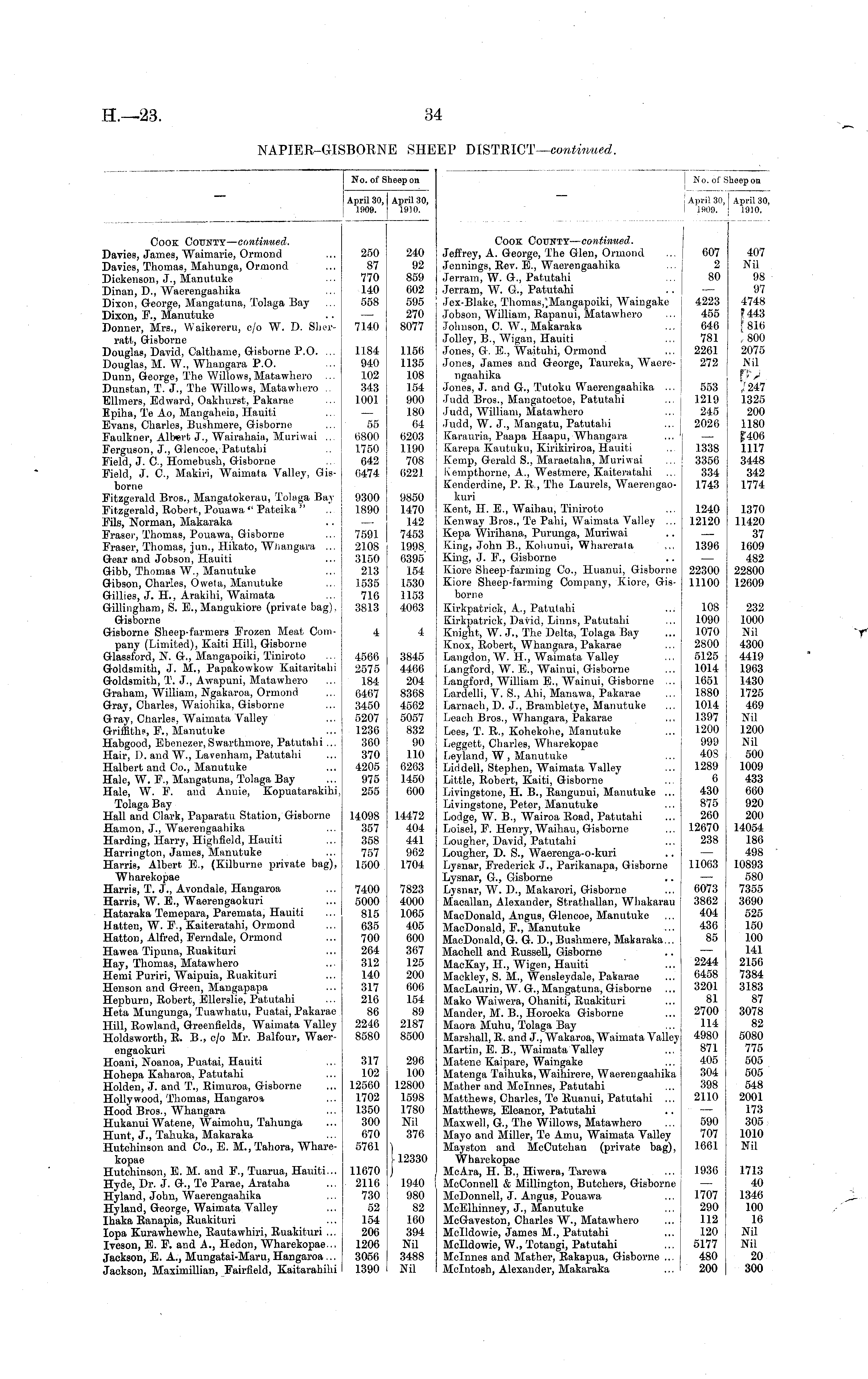 No. of Sheep on No. ofS >heep on April 30, ! 1910. April 30, 1909. April 30, 1910. I April 30, 1909. Cook County— continued. Davies, James, Waimarie, Ormond Davies, Thomas, Mahunga, Ormond Dickenson, J., Manutuke Dinan, D., Waerengaahika Dixon, George, Mangatuna, Tolaga Bay Dixon, F., Manutuke Donner, Mrs., Waikereru, c/o W. D. Sherratt, Gisborne Douglas, David, Calthame, Gisborne P.O. ... Douglas, M. W., Whangara P.O. Dunn, George, The Willows, Matawhero Dunstan, T. J., The Willows, Matawhero .. Ellmers, Edward, Oakhurst, Pakarae Epiha, Te Ao, Mangaheia, Hauiti Evans, Charles, Bushmere, Gisborne Faulkner, Albert J., Wairahaia, Muriwai ... Ferguson, J., Glencoe, Patutahi Field, J. G, Homebush, Gisborne Field, J. G, Makiri, Waimata Valley, Gisborne Fitzgerald Bros., Mangatokerau, Tolaga Bay | Fitzgerald, Robert, Pouawa " Pateika " .. j Fils, Norman, Makaraka Fraser, Thomas, Pouawa, Gisborne ... ! Fraser, Thomas, jun., Hikato, Whangara ... | Gear and Jobson, Hauiti ... j Gibb, Thomas W., Manutuke ... Gibson, Charles, Oweta, Manutuke ... Gillies, J. H, Arakihi, Waimata ... Gillingham, S. E., Mangukiore (private bag). ! Gisborne Gisborne Sheep-farmers Frozen Meat Com- j pany (Limited), Kaiti Hill, Gisborne Glassford, N. G., Mangapoiki, Tiniroto Goldsmith, J. M., Papakowkow Kaitaritahi Goldsmith, T. J., Awapuni, Matawhero Graham, William, Ngakaroa, Ormond Gray, Charles, Waiohika, Gisborne Gray, Charles, Waimata Valley Griffith!", F., Manutuke Habgood, Ebenezer,Swarthmore, Patutahi ... Hair, D. and W., Lavenham, Patutahi Halbert and Co., Manutuke Hale, W. F., Mangatuna, Tolaga Bay Hale, W. F. and Annie, Kopuatarakihi, Tolaga Bay Hall and Clark, Paparatu Station, Gisborne Hamon, J., Waerengaahika Harding, Harry, Highfield, Hauiti Harrington, James, Manutuke Harris, Albert E., (Kilburne private bag), Wharekopae Harris, T. J., Avondale, Hangaroa Harris, W. E., Waerengaokuri Hataraka Temepara, Paremata, Hauiti Hatten, W. F., Kaiteratahi, Ormond Hatton, Alfred, Ferndale, Ormond Hawea Tipuna, Ruakituri Hay, Thomas, Matawhero Hemi Puriri, Waipuia, Ruakituri Henson and Green, Mangapapa Hepburn, Robert, EUerslie, Patutahi Heta Mungunga, Tuawhatu, Puatai, Pakarae Hill, Rowland, Greenfields, Waimata Valley Holdsworth, R. B., c/o Mr. Balfour, Waerengaokuri Hoani, Noanoa, Puatai, Hauiti Hohepa Kaharoa, Patutahi Holden, J. and T., Rimuroa, Gisborne Hollywood, Thomas, Hangaroa Hood Bros., Whangara Hukanui Watene, Waimohu, Tahunga Hunt, J., Tahuka, Makaraka Hutchinson and Co., E. M., Tahora, Wharekopae Hutchinson, E. M. and F., Tuarua, Hauiti... Hyde, Dr. J. G., Te Parae, Arataha Hyland, John, Waerengaahika Hyland, George, Waimata Valley Ihaka Ranapia, Ruakituri Iopa Kurawhewhe, Rautawhiri, Ruakituri ... Iveson, E. F. and A., Hedon, Wharekopae... Jackson, E. A., Mungatai-Maru, Hangaroa... Jackson, Maximillian, Fairfield, Kaitarahihi 250 87 770 140 558 7140 1184 940 102 343 1001 55 0800 1750 642 6474 9300 1890 7591 2108 3150 213 1535 716 3813 4 4566 2575 184 6467 3450 5207 1236 360 370 4205 975 255 240 92 859 602 595 270 8077 1156 1135 108 154 900 180 64 6203 1190 708 6221 9850 1470 142 7453 1998 6395 154 1530 1153 4063 4 3845 4466 204 8368 4562 5057 832 90 110 6263 1450 600 Cook County— continued,. Jeffrey, A. George, The Glen, Ormond ... 607 Jennings, Rev. E., Waerengaahika ... 2 Jerram, W. G., Patutahi ... 80 Jerram, W. G., Patutahi Jex-Blake, Thomas,°Mangapoiki, Waingake 4223 Jobson, William, Rapanui, Matawhero ... 455 Johnson, G W., Makaraka ... 646 Jolley, B., Wigan, Hauiti ... 781 Jones, G. E., Waituhi, Ormond ... 2261 Jones, James and George, Taureka, Waere- 272 ngaahika Jones, J. and G., Tutoku Waerengaahika ... 553 Judd Bros., Mangatoetoe, Patutahi ... i 1219 Judd, William, Matawhero ... 245 Judd, W. J., Mangatu, Patutahi ... 2026 Karauria, Paapa Haapu, Whangara ... ' — Karepa Kautuku, Kirikiriroa, Hauiti ... 1338 Kemp, Gerald S., Maraetaha, Muriwai ... 3356 Kempthorne, A., Westmere, Kaiteratahi ... 334 Kenderdine, P. R., The Laurels, Waerengao- 1743 kuri Kent, H. E., Waihau, Tiniroto ... 1240 Kenway Bros., Te Pahi, Waimata Valley ... 12120 Kepa Wirihana, Purunga, Muriwai .. — King, John B., Kohunui, Wharerata ... 1396 King, J. F., Gisborne .. — Kiore Sheep-farming Co., Huanui, Gisborne 22300 Kiore Sheep-farming Company, Kiore, Gis- 11100 borne Kirkpatrick, A., Patutahi ... 108 Kirkpatrick, David, Linns, Patutahi ... 1090 Knight, W. J., The Delta, Tolaga Bay ... 1070 Knox, Robert, Whangara, Pakarae ... 2800 Langdon, W. H., Waimata Valley ... 5125 Langford, W. E., Wainui, Gisborne ... 1014 Langford, William E., Wainui, Gisborne ... 1651 Lardelli, V. S., Ahi, Manawa, Pakarae ... 1880 Larnach, D. J., Brambletye, Manutuke ... 1014 Leach Bros., Whangara, Pakarae ... 1397 Lees, T. R., Kohekohe, Manutuke ... 1200 Leggett, Charles, Wharekopae 999 Ley land, W, Manutuke ... 40S Liddell, Stephen, Waimata Valley ... 1289 Little, Robert, Kaiti, Gisborne ... 6 Livingstone, H. B., Rangunui, Manutuke ... 430 Livingstone, Peter, Manutuke ... j 875 Lodge, W. B., Wairoa Road, Patutahi ... 260 Loisel, F. Henry, Waihau, Gisborne ... 12670 Lougher, David, Patutahi ... 238 Lougher, D. S., Waerenga-o-kuri .. — Lysnar, Frederick J., Parikanapa, Gisborne 11063 Lysnar, G., Gisborne .. — Lysnar, W. D., Makarori, Gisborne ... 6073 Macallan, Alexander, Strathallan, Whakarau 3862 MacDonald, Angus, Glencoe, Manutuke ... 404 MacDonald, F., Manutuke ... 436 MacDonald, G. G. D., Bushmere, Makaraka... 85 Machell and Russell, Gisborne .. — MacKay, H., Wigen, Hauiti ... 2244 Mackley, S. M., Wensleydale, Pakarae ... 6458 MacLaurin, W. G.,Mangatuna, Gisborne ... 3201 Mako Waiwera, Ohaniti, Ruakituri ... 81 Mander, M. B., Horoeka Gisborne ... 2700 Maora Muhu, Tolaga Bay ... 114 Marshall, R. and J., Wakaroa, Waimata Valley; 4980 Martin, E. B., Waimata Valley ... 871 Matene Kaipare, Waingake ... 405 Matenga Taihuka, Waihirere, Waerengaahika 304 Mather and Mclnnes, Patutahi ... 398 Matthews, Charles, Te Ruanui, Patutahi ... 21