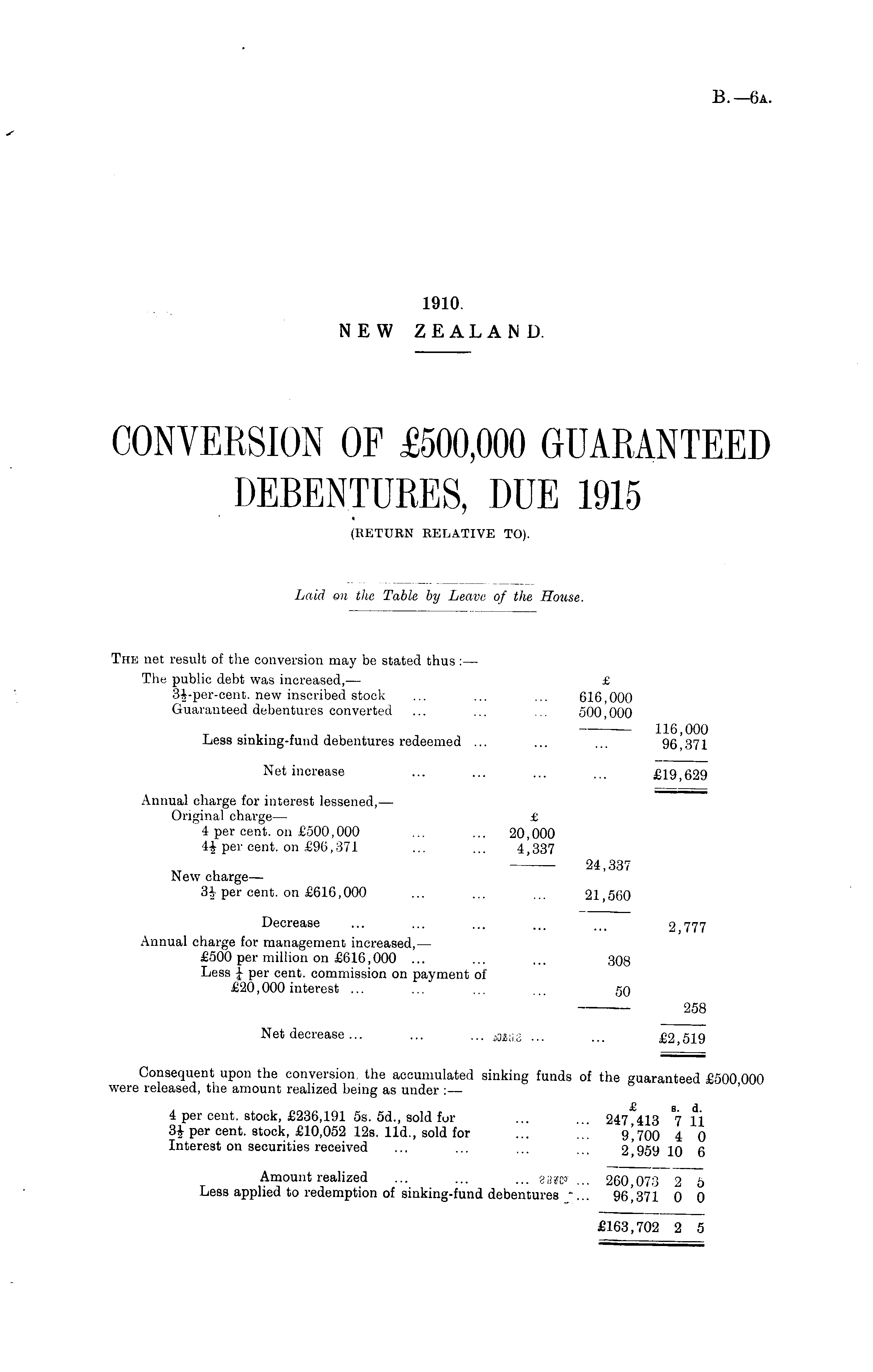 The net result of the conversion may be stated thus :— The public debt was increased, — £ 3J-per-cent. new inscribed stock ... ... ... 616,000 Guaranteed debentures converted ... ... ... 500,000 ■ 116,000 Less sinking-fund debentures redeemed ... ... ... 96,371 Net increase ... ... ... ... £19,629 Annual charge for interest lessened, — Original charge— £ 4 per cent, on £500,000 ... ... 20,000 4£ per cent, on £96,371 ... ... 4,337 24 ' 337 New charge— 3£per cent, on £616,000 ... ... ... 21,560 Decrease ... ... ... ... >## 2 777 Annual charge for management increased, — £500 per million on £616,000 ... ... ... 308 Less per cent, commission on payment of £20,000 interest ... ... ... ... 50 258 Net decrease... ... ... mas ... ... £2,519 Consequent upon the conversion, the accumulated sinking funds of the guaranteed £500 000 were released, the amount realized being as under :— 4 per cent, stock, £236,191 ss. 5d., sold for ... ... 247 413 7 li 3* per cent, stock, £10,052 12s. lid., sold for ... 9*700 4 0 Interest on securities received ... ... ... 2 95y 10 6 Amount realized ... ... ... zsw ... 260,073 2 5 Less applied to redemption of sinking-fund debentures "... 0 0 £163,702 2 5