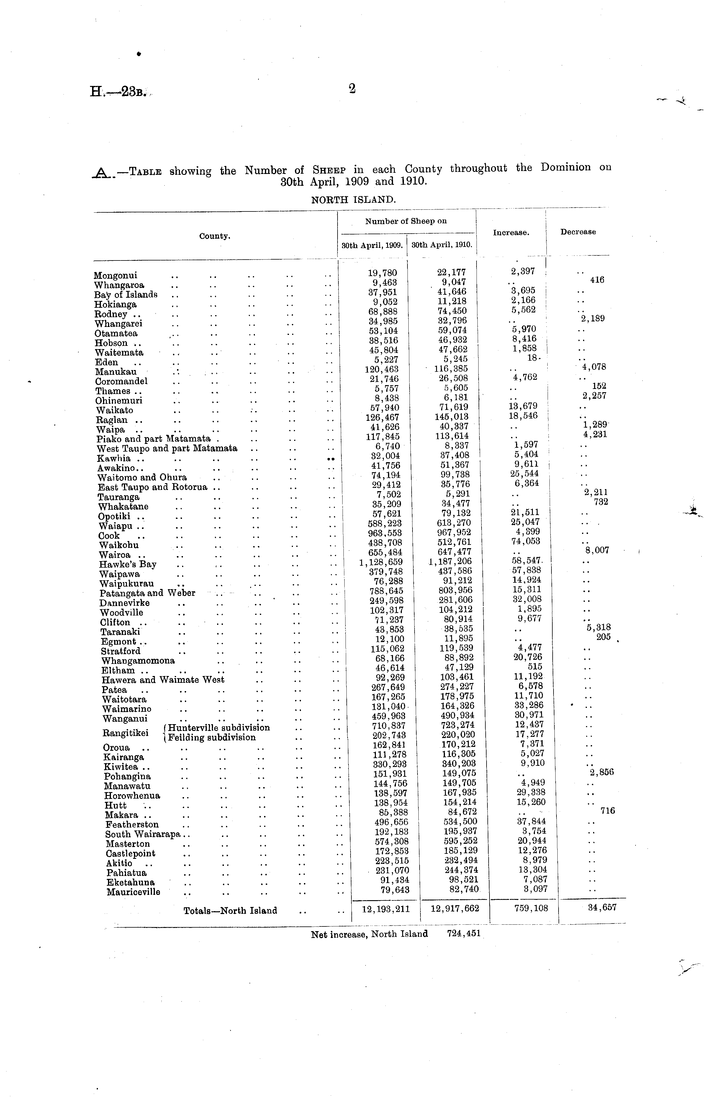 A.—Table showing the Number of Sheep in each County throughout the Dominion on 30th April, 1909 and 1910. NORTH ISLAND.