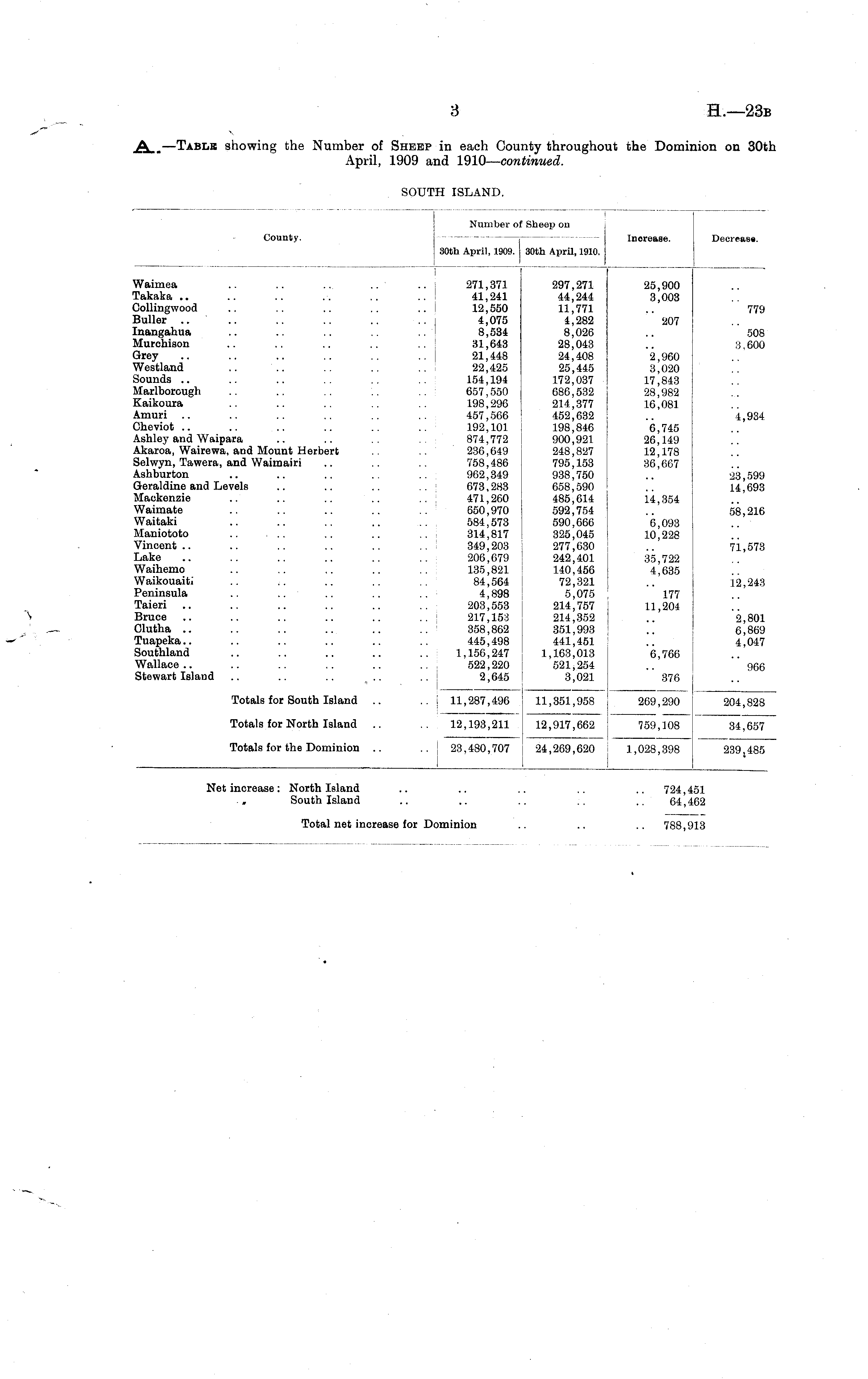 A.—Table showing the Number of Sheep in each County throughout the Dominion on 30th April, 1909 and 1910— continued. SOUTH ISLAND.