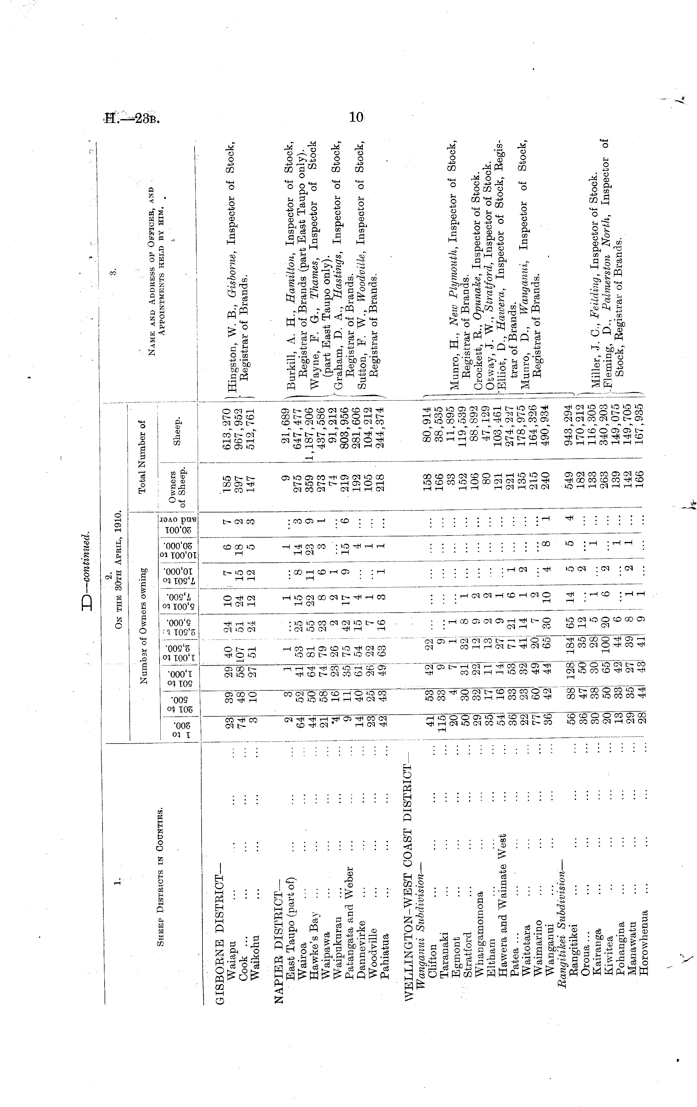 2. On the 30th App.il, 1910, I 3. 1. _ ■ i Sheep Districts in Counties. Numbsr of Owners owning Total Number of Name and Address of Officer, and Appointments held by him. So o r-H CM O rH O CM lO rH rH O r-H O Ho :r l^ O.tS » aj °r L -- i H 2 rH CM »0 I— " O o o O CM tA ta 2 8 5 CM 3 Owners 1 Q1 , „, sheep, ol Sheep. ; r GISBOENE DISTEICT— Waiapu ... .. ••• ■•• Cook ... ... ... ... ... I Waikohu ... ... ... ... 23 74 3 39 48 10 29 40 24 58107 : 51 27 51 ! 24 29 58 27 10 ! 7 24 I 15 12 ! 12 6 18 5 7 2 3 185 613,270 397 967,952 147 512,761 I Hingston, W. B., Gisborne, Inspector of Stock, Eegistrar of Brands. NAPIEE DISTEICT— East Taupo (part of) ... ... ■■■ j Wairoa ... .... Hawke's Bay Waipawa ... Waipukurau Patangata and Weber Dannevirke Woodville Pahiatua ... ... ... ... 2 64 44 21 4 9 14 23 42 3 52 50 58 16 11 40 25 43 1 1 ... 41 53 25 64 81 55 74! 79 ' 23 23! 26 2 35j 75 ' 42 61! 54 15 26| 22 i 7 49; 63 '■■ 16 1 ... 15 8 22 11 8 6 2 1 17 9 4 ... 1 ... 3 1 1 14 23 3 3 9 1 9 21,689 275 647,477 359 1,187,206 273 437,586 74 91,212 219 803,956 192 281,606 105 104,212 218 244,374 ' Burkill, A. H., Hamilton, Inspector of Stock, Eegistrar of Brands (part East Taupo only). Wayne, P. G., Thames, Inspector of Stock I (part East Taupo only). (Graham, D. A., Hastings, Inspector of Stock, Eegistrar of Brands. Sutton, P. W., Woodville, Inspector of Stock, I Eegistrar of Brands. 15 4 1 1 6 WELLINGTON-WEST COAST DISTRICT— Wanganui Subdivision — Clifton Taranaki Egmont Stratford Whangamomona Eltham Hawera and Waimate West Patea ... ... Waitotara Waimarino Wanganui Ba7tgitilcei Subdivision — Eangitikei Oroua ... Kairanga Kiwitea Pohangina Manawatu ... ... ... •■• Horowhenua ... ... ... ... 41 115 20 50 29 35 54 36 22 77 36 56 36 30 20 13 29 28 53 33 4 30 32 17 16 33 23 60 42! 42! 9 7 31! 22i 11 14: 53! 32! 49! 44J 42! 22 ... 9 9; ... 7 1 1 31! 8 22! 12 9 11 13 2 14; 27! 9 53! 71! 21 32! 41! 14 49! 20 7 44l 65 30 i i 2 2 1 ... ... 6 1 ... 1 2 ... 2 10 4 8 158 80,914 166 38,535 33 11,895 152 119,539 106 88,892 80 47,129 121 103,461 221 274,2-i7 135 178,975 215 164,326 240 490,934 1 Munro, H., New Plymouth, Inspector of Stock, Eegistrar of Brands. Crockett, E., Opunake, Inspector of Stock. Otway, J. W., Stratford, Inspector of Stock. •"Elliot", D., Hawera, Inspector of Stock, Eegistrar of Brands. Munro, D., Wanganui, Inspector of Stock, Eegistrar of Brands. "i 88' 47 38 : 50! 33i 35i 44l 128 50! 30 65j 42! 27! 43! 128 184 65 50i 35 12 30 1 28 5 65 100 20 42' 44 6 27| 39 8 m 41 9 14 5 5 2 ... 1 ... 1 6 2 ... 1 1 2 1 I 1 4 549 943,294 182 170,212 133 116,305 263 340,203 139 149,075 142 149,705 166 167,935 J I Miller, J. C, Feilding, Inspector of Stock. VFleming, D., Palmerston North, Inspector of j Stock, Eegistrar of Brands. \