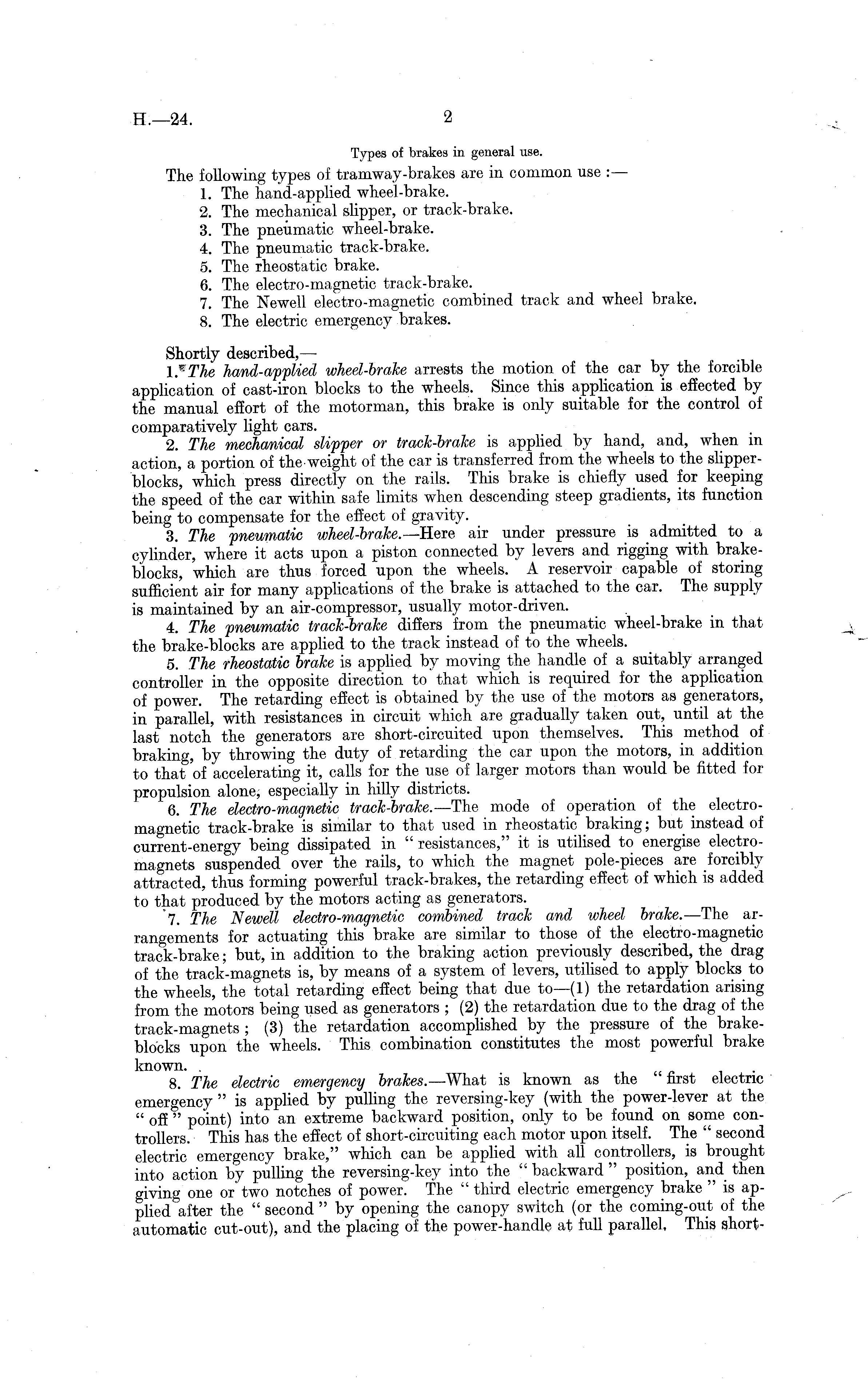 Types of brakes in general use. The following types of tramway-brakes are in common use : — 1. The hand-applied wheel-brake. 2. The mechanical slipper, or track-brake. 3. The pneumatic wheel-brake. 4. The pneumatic track-brake. 5. The rheostatic brake. 6. The electro-magnetic track-brake. 7. The Newell electro-magnetic combined track and wheel brake. 8. The electric emergency brakes. Shortly described, — l*The hand-applied wheel-brake arrests the motion of the car by the forcible application of cast-iron blocks to the wheels. Since this application is effected by the manual effort of the motorman, this brake is only suitable for the control of comparatively light cars. 2. The mechanical slipper or track-brake is applied by hand, and, when in action, a portion of the weight of the car is transferred from the wheels to the slipperblocks, which press directly on the rails. This brake is chiefly used for keeping the speed of the car within safe limits when descending steep gradients, its function being to compensate for the effect of gravity. 3. The pneumatic wheel-brake. —Here air under pressure is admitted to a cylinder, where it acts upon a piston connected by levers and rigging with brakeblocks, which are thus forced upon the wheels. A reservoir capable of storing sufficient air for many applications of the brake is attached to the car. The supply is maintained by an air-compressor, usually motor-driven. 4. The pneumatic track-brake differs from the pneumatic wheel-brake in that the brake-blocks are applied to the track instead of to the wheels. 5. The rheostatic brake is applied by moving the handle of a suitably arranged controller in the opposite direction to that which is required for the application of power. The retarding effect is obtained by the use of the motors as generators, in parallel, with resistances in circuit which are gradually taken out, until at the last notch the generators are short-circuited upon themselves. This method of braking, by throwing the duty of retarding the car upon the motors, in addition to that of accelerating it, calls for the use of larger motors than would be fitted for propulsion alone, especially in hilly districts. 6. The electro-magnetic track-brake. —The mode of operation of the electromagnetic track-brake is similar to that used in rheostatic braking; but instead of current-energy being dissipated in " resistances," it is utilised to energise electromagnets suspended over the rails, to which the magnet pole-pieces are forcibly attracted, thus forming powerful track-brakes, the retarding effect of which is added to that produced by the motors acting as generators. 7. The Newell electro-magnetic combined track and ivheel brake. —The arrangements for actuating this brake are similar to those of the electro-magnetic track-brake; but, in addition to the braking action previously described, the drag of the track-magnets is, by means of a system of levers, utilised to apply blocks to the wheels, the total retarding effect being that due to—(1) the retardation arising from the motors being used as generators ; (2) the retardation due to the drag of the track-magnets ; (3) the retardation accomplished by the pressure of the brakeblocks upon the wheels. This combination constitutes the most powerful brake known. . 8. The electric emergency brakes. —What is known as the first electric emergency " is applied by pulling the reversing-key (with the power-lever at the " off " point) into an extreme backward position, only to be found on some controllers. This has the effect of short-circuiting each motor upon itself. The " second electric emergency brake," which can be applied with all controllers, is brought into action by pulling the reversing-key into the " backward " position, and then giving one or' two notches of power. The " third electric emergency brake "is applied after the " second " by opening the canopy switch (or the coming-out of the automatic cut-out), and the placing of the power-handle at full parallel. This short-