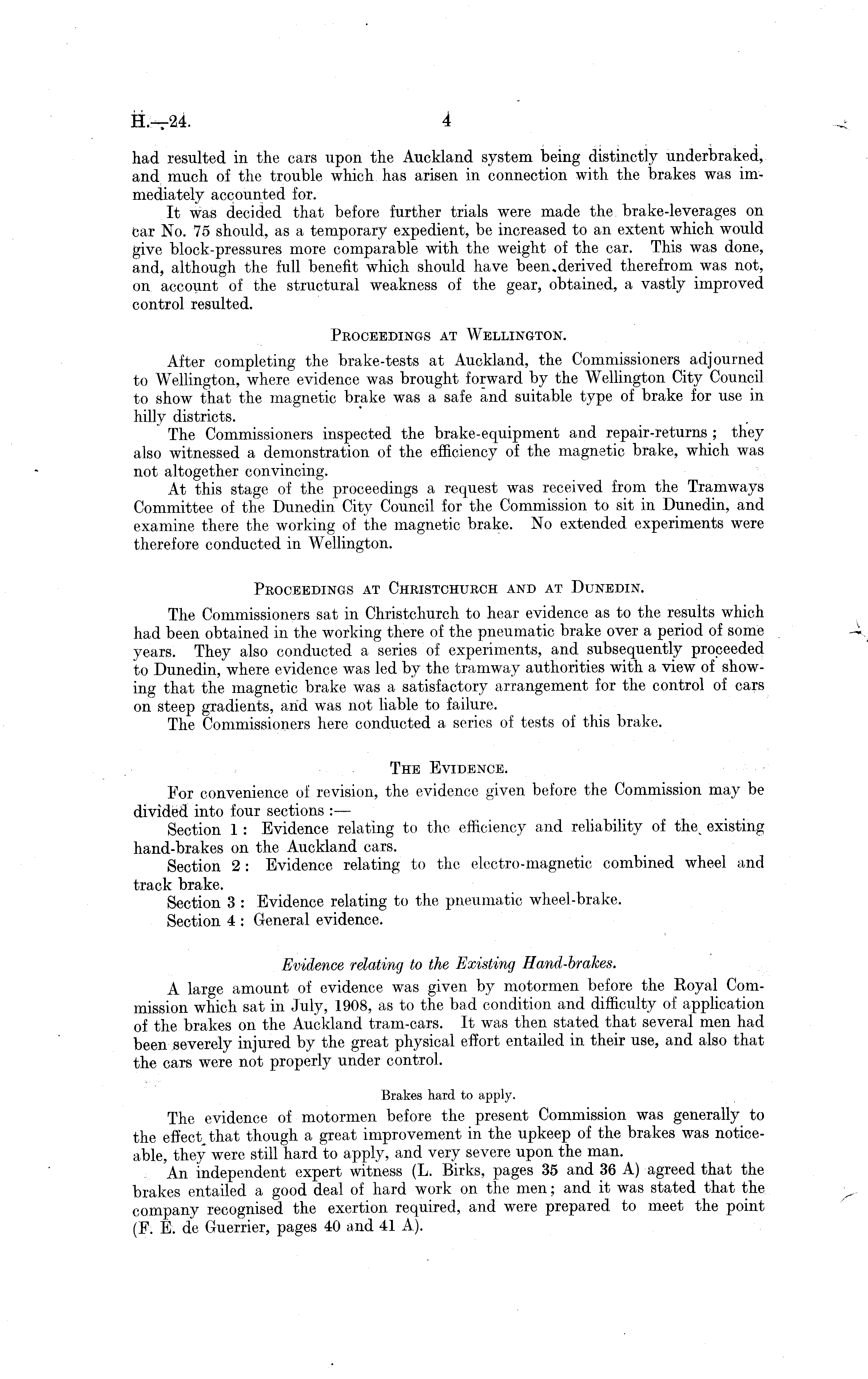 had resulted in the cars upon the Auckland system being distinctly underbraked, and much of the trouble which has arisen in connection with the brakes was immediately accounted for. It was decided that before further trials were made the brake-leverages on car No. 75 should, as a temporary expedient, be increased to an extent which would give block-pressures more comparable with the weight of the car. This was done, and, although the Ml benefit which should have been.derived therefrom was not, on account of the structural weakness of the gear, obtained, a vastly improved control resulted. Proceedings at Wellington. After completing the brake-tests at Auckland, the Commissioners adjourned to Wellington, where evidence was brought forward by the Wellington City Council to show that the magnetic brake was a safe and suitable type of brake for use in hilly districts. The Commissioners inspected the brake-equipment and repair-returns ; they also witnessed a demonstration of the efficiency of the magnetic brake, which was not altogether convincing. At this stage of the proceedings a request was received from the Tramways Committee of the Dunedin City Council for the Commission to sit in Dunedin, and examine there the working of the magnetic brake. No extended experiments were therefore conducted in Wellington. Proceedings at Christchurch and at Dunedin. The Commissioners sat in Christchurch to hear evidence as to the results which had been obtained in the working there of the pneumatic brake over a period of some years. They also conducted a series of experiments, and subsequently proceeded to Dunedin, where evidence was led by the tramway authorities with a view of showing that the magnetic brake was a satisfactory arrangement for the control of cars on steep gradients, and was not liable to failure. The Commissioners here conducted a series of tests of this brake. The Evidence. For convenience of revision, the evidence given before the Commission may be divided into four sections : — Section 1 : Evidence relating to the efficiency and reliability of existing hand-brakes on the Auckland cars. Section 2 : Evidence relating to the electro-magnetic combined wheel and track brake. Section 3 : Evidence relating to the pneumatic wheel-brake. Section 4 : General evidence. Evidence relating to the Existing Hand-brakes. A large amount of evidence was given by motormen before the Royal Commission which sat in July, 1908, as to the bad condition and difficulty of application of the brakes on the Auckland tram-cars. It was then stated that several men had been severely injured by the great physical effort entailed in their use, and also that the cars were not properly under control. Brakes hard to apply. The evidence of motormen before the present Commission was generally to the effect that though a great improvement in the upkeep of the brakes was noticeable, they were still hard to apply, and very severe upon the man. An independent expert witness (L. Birks, pages 35 and 36 A) agreed that the brakes entailed a good deal of hard work on the men; and it was stated that the company recognised the exertion required, and were prepared to meet the point (P. E. de Guerrier, pages 40 and 41 A).