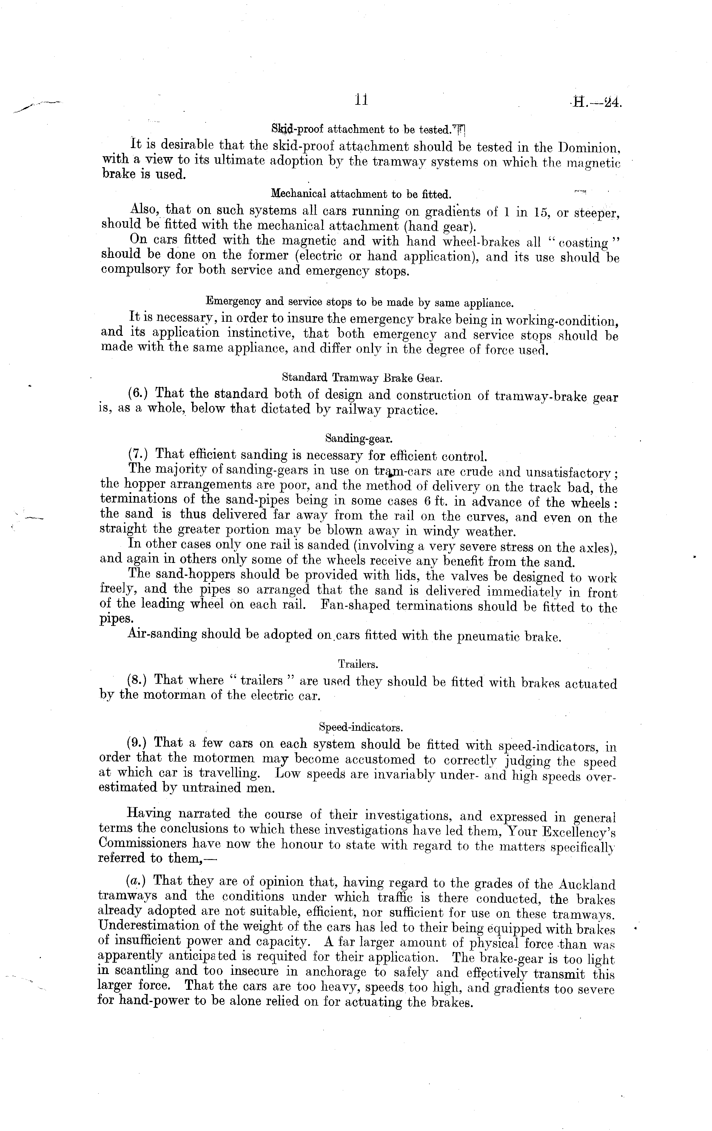 SMd-proof attachment to be tested.^f] It is desirable that the skid-proof attachment should be tested in. the Dominion, with a view to its ultimate adoption by the tramway systems on which the magnetic brake is used. Mechanical attachment to be fitted. ' "' Also, that on such systems all cars running on gradients of 1 in 15, or steeper, should be fitted with the mechanical attachment (hand gear). On cars fitted with the magnetic and with hand wheel-brakes all " coasting " should be done on the former (electric or hand application), and its use should be compulsory for both service and emergency stops. Emergency and service stops to be made by same appliance. It is necessary, in order to insure the emergency brake being in working-condition, and its application instinctive, that both emergency and service stops should be made with the same appliance, and differ only in the degree of force used. Standard Tramway Brake Gear. (6.) That the standard both of design and construction of tramway-brake gear is, as a whole, below that dictated by railway practice. Sanding-gear. (7.) That efficient sanding is necessary for efficient control. The majority of sanding-gears in use on trajn-cars are crude and unsatisfactory ; the hopper arrangements are poor, and the method of delivery on the track bad, the terminations of the sand-pipes being in some cases 6 ft. in advance of the wheels : the sand is thus delivered far away from the rail on the curves, and even on the straight the greater portion may be blown away in windy weather. In other cases only one rail is sanded (involving a very severe stress on the axles), and again in others only some of the wheels receive any benefit from the sand. The sand-hoppers should be provided with lids, the valves be designed to work freely, and the pipes so arranged that the sand is delivered immediately in front of the leading wheel on each rail. Fan-shaped terminations should be fitted to the pipes. Air-sanding should be adopted on.cars fitted with the pneumatic brake. Trailers. (8.) That where " trailers " are used they should be fitted with brakes actuated by the motorman of the electric car. Speed-indicators. (9.) That a few cars on each system should be fitted with speed-indicators, in order that the motormen may become accustomed to correctly judging the speed at which car is travelling. Low speeds are invariably under- and high speeds overestimated by untrained men. Having narrated the course of their investigations, and expressed in general terms the conclusions to which these investigations have led them., Your Excellency's Commissioners have now the honour to state with regard to the matters specifically referred to them, — {a.) That they are of opinion that, having regard to the grades of the Auckland tramways and the conditions under which traffic is there conducted, the brakes already adopted are not suitable, efficient, nor sufficient for use on these tramways. Underestimation of the weight of the cars has led to their being equipped with brakes of insufficient power and capacity. A far larger amount of physical force than was apparently anticipated is required for their application. The brake-gear is too light in scantling and too insecure in anchorage to safely and effectively transmit this larger force. That the cars are too heavy, speeds too high, and gradients too severe for hand-power to be alone relied on for actuating the brakes.