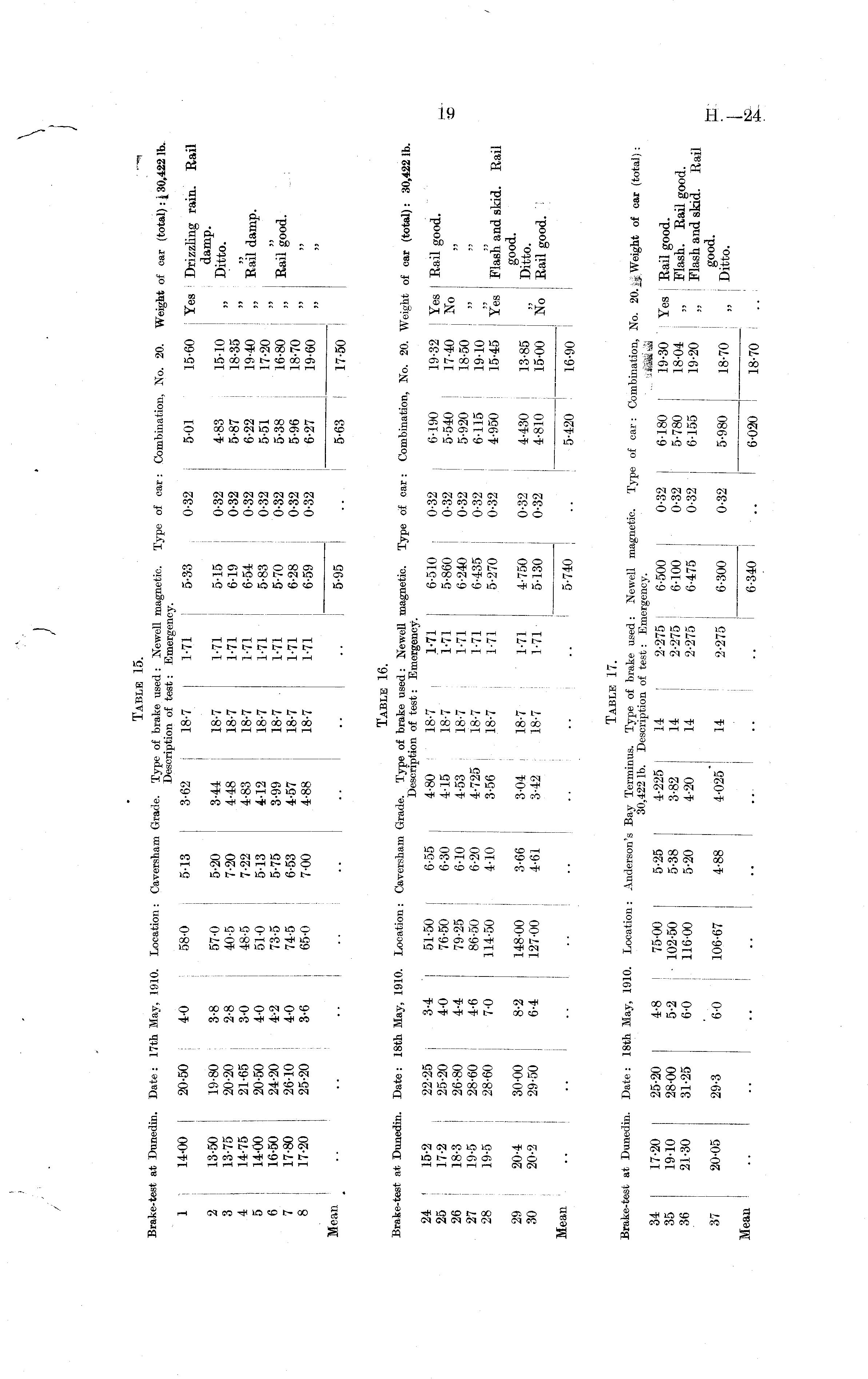 Table 15. Brake-test at Dunedin. 1 14-00 2 13-50 3 13-75 4 14-75 5 14-00 6 16-50 7 17-80 8 17-20 Mean Date: 17th May, 1910. Location: Caversham Grade. Type of brake used: Newell magnetic. Type of car: Combination. No. 20. Weight Description of test: Emergency. 20-50 4-0 58-0 5-13 3-62 18-7 1-71 j 5-33 0-32 5-01 15-60 Yes 19-80 3-8 57-0 5-20 3-44 18-7 1-71 5-15 0-32 4-83 15-10 20-20 2-8 40-5 7-20 4-48 18-7 1-71 6-19 0-32 5-87 18-35 21-65 3-0 48-5 7-22 4-83 18-7 1-71 6-54 0-32 6-22 19-40 20-50 4-0 51-0 5-13 4-12 18-7 1-71 5-83 0-32 5-51 17-20 24-20 4-2 73-5 5-75 3-99 18-7 1-71 5-70 0-32 5-38 16-80 26-10 4-0 74-5 6-53 4-57 18-7 1-71 6-28 0-32 5-96 18-70 25-20 3-6 65-0 7-00 4-88 18-7 1-71 6-59 0-32 6-27 19-60 "„ 5-95 .. 5-63 17-50 i, No. 20. Weight of car (total): £ 30,422 lb. 15-60 Yes Drizzling rain. Rail damp. 15-10 „ Ditto. 18.SK 19-40 „ Rail damp. 17.9A •■ "•™ 16-80 ,, j Rail good. 18.7A io..«n. I i 17-50 Table 16. i, No. 20. Weight of car (total): 30,4221b. Brake-test at Dunedin. 24 1 15-2 25 17-2 26 18-3 27 19-5 28 19-5 29 | 20-4 30 20-2 Mean Date: 18th May, 1910. Location: Caversham Grade. Type of brake used: Newell magnetic. Type of car: Combination, No. 20. Weight Description of test: Emergency. 22-25 j 3-4 51-50 6-55 4-80 18-7 , 1-71 6-510 , 0-32 6-190 19-32 I Yes 25-20 4-0 76-50 6-30 4-15 18-7 1-71 5-860 0-32 5-540 17-40 ! No 26-80 4-4 79-25 6-10 4-53 18-7 1-71 6-240 0-32 5-920 18-50 28-60 4-6 86-50 6-20 4-725 ; 18-7 1-71 6-435 0-32 6-115 19-10 28-60 7-0 114-50 4-10 3-56 18-7 1-71 5-270 0-32 4-950 15-45 | Yes 30-00 8-2 148-00 3-66 3-04 18-7 1-71 4-750 0-32 4-430 13-85 29-50 6-4 127-00 4-61 3-42 18-7 1-71 5-130 0-32 4-810 15-00 j No 1 •• •• •• •• •■ 5-740 .. 5-420 ! 16-90 19-32 I Yes j Rail good. 17. AA TVJV, 17-411 JNo l „ lQ.in ; 15-45 ; Yes Flash and skid. Rail good. 13-85 „ Ditto. 15-00 j No Rail good. 'j j ' t 16-90 I I Table 17. )mbination, No. 20. Jj Weight of ear (total): 19-30 Yes i Rail good. 18-04 „ ' Flash. Rail good. 19-20 „ | Flash and skid. Rail good. 18-70 „ i Ditto. Brake-test at Dunedin. 34 17-20 35 19-10 36 21-30 37 20-05 Mean Date: 18th May, 1910. Location: Anderson's Bay Terminus. Type of brake used: Newell magnetic. Type of car: Combination, No. 20. 30,422 lb. Description of test: Emergency. 25-20 4-8 I 75-00 5-25 4-225 14 2-275 j 6-500 0-32 6-180 T?30 ! Yes 28-00 5-2 s ■ 102-50 5-38 3-82 14 2-275 ' 6-100 0-32 5-780 18-04 31-25 6-0 116-00 5-20 4-20 14 2-275 | 6-475 0-32 6-155 19-20 2 9 - 3 6-0 106-67 4-88 4-025* 14 2-275 6-300 0-32 5-980 18-70 J " 6-340 ! .. 6-020 18-70 I 6-020 18-70 I ..