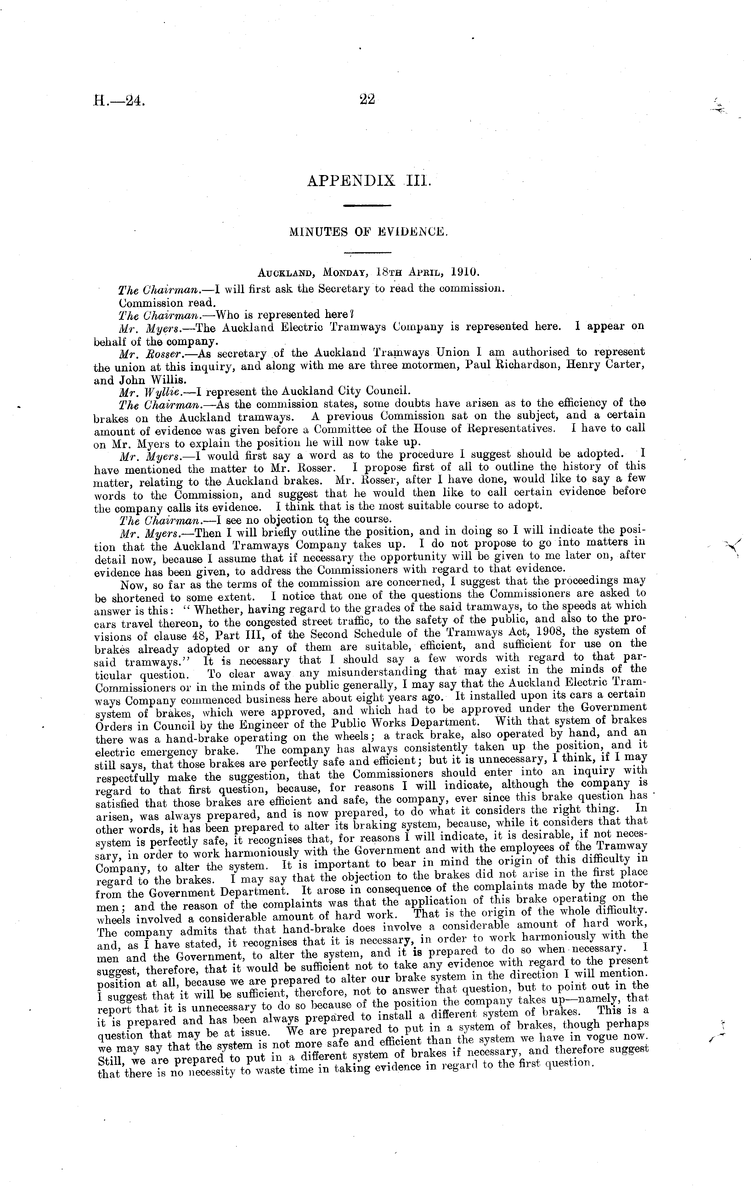 APPENDIX 111. MINUTES OF EVIDENCE. Auckland, Monday, 18th April, 1910. The Chairman. —I will first ask the Secretary to read the commission. Commission read. The Chairman. —Who is represented here? Mr. Myers. —The Auckland Electric Tramways Company is represented here. 1 appear on behalf of the company. Mr. Rosser. —As secretary of the Auckland Tramways Union I am authorised to represent the union at this inquiry, and along with me are three motormen, Paul Richardson, Henry Carter, and John Willis. Mr. WylUe. —l represent the Auckland City Council. The Chairman. —As the commission states, some doubts have arisen as to the efficiency of the brakes on the Auckland tramways. A previous Commission sat on the subject, and a certain amount of evidence was given before a Committee of the House of Representatives. I have to call on Mr. Myers to explain the position he will now take up. Mr. Myers. —I would first say a word as to the procedure I suggest should be adopted. I have mentioned the matter to Mr. Rosser. I propose first of all to outline the history of this matter, relating to the Auckland brakes. Mr. Rosser, after I have done, would like to say a few words to the Commission, and suggest that he would then like to call certain evidence before the company calls its evidence. I think that is the most suitable course to adopt. The Chairman. —I see no objection to, the course. Mr. Myers. —Then I will briefly outline the position, and in doing so I will indicate the position that the Auckland Tramways Company takes up. I do not propose to go into matters in detail now, because I assume that if necessary the opportunity will be given to me later on, after evidence has been given, to address the Commissioners with regard to that evidence. Now, so far as the terms of the commission are concerned, I suggest that the proceedings may be shortened to some extent. I notice that one of the questions the Commissioners are asked to answer is this: " Whether, having regard to the grades of the said tramways, to the speeds at which cars travel thereon, to the congested street traffic, to the safety of the public, and also to the provisions of clause 48, Part 111, of the Second Schedule of the Tramways Act, 1908, the system of brakes already adopted or any of them are suitable, efficient, and sufficient for use on the said tramways." It is necessary that I should say a few words with regard to that particular question. To clear away any misunderstanding that may exist in the minds ot the Commissioners or in the minds of the public generally, I may say that the Auckland Electric lramwavs Company commenced business here about eight years ago. It installed upon its cars a certain system of brakes, which were approved, and which had to be approved under the Government Orders in Council by the Engineer of the Public Works Department. With that system of brakes there was a hand-brake operating on the wheels; a track brake, also operated by hand, and an electric emergency brake. The company has always consistently taken up the position,.and it still says, that those brakes are perfectly safe and efficient; but it is unnecessary, I think, it 1 may respectfully make the suggestion, that the Commissioners should enter into an inquiry with re?ard to that first question, because, for reasons I will indicate, although the company i satisfied that those brakes are efficient and safe, the company ever since this brake que tion has arisen was always prepared, and is now prepared, to do what it considers the right thing. In Xr words, i "has been prepared to alter its braking system, because, while it considers that that is perfectly safe, it recognises that, for reasons I will indicate, it is desirable, if not necesto work harmoniously with the Government and with the employees of the; Tramway Comnln^"to alto the system. It is important to bear in mind the origin of this difficulty in re 3 to the brake I may say that the objection to the brakes did not arise in the first place S the Department. It arose in consequence of the oompUinta made by the motorm r- and the reason of the complaints was that the application of this brake operating on he wheals involved a considerable amount of hard work. That is the origin of -hole difficulty. Thrcompany admits that that hand-brake does involve a considerable amount of hard work and as I have stated, it recognises that it is necessary, in order to work harmoniously with the it P i S prepared *™& question that may be at issue. We are prepared ™ Pin, y