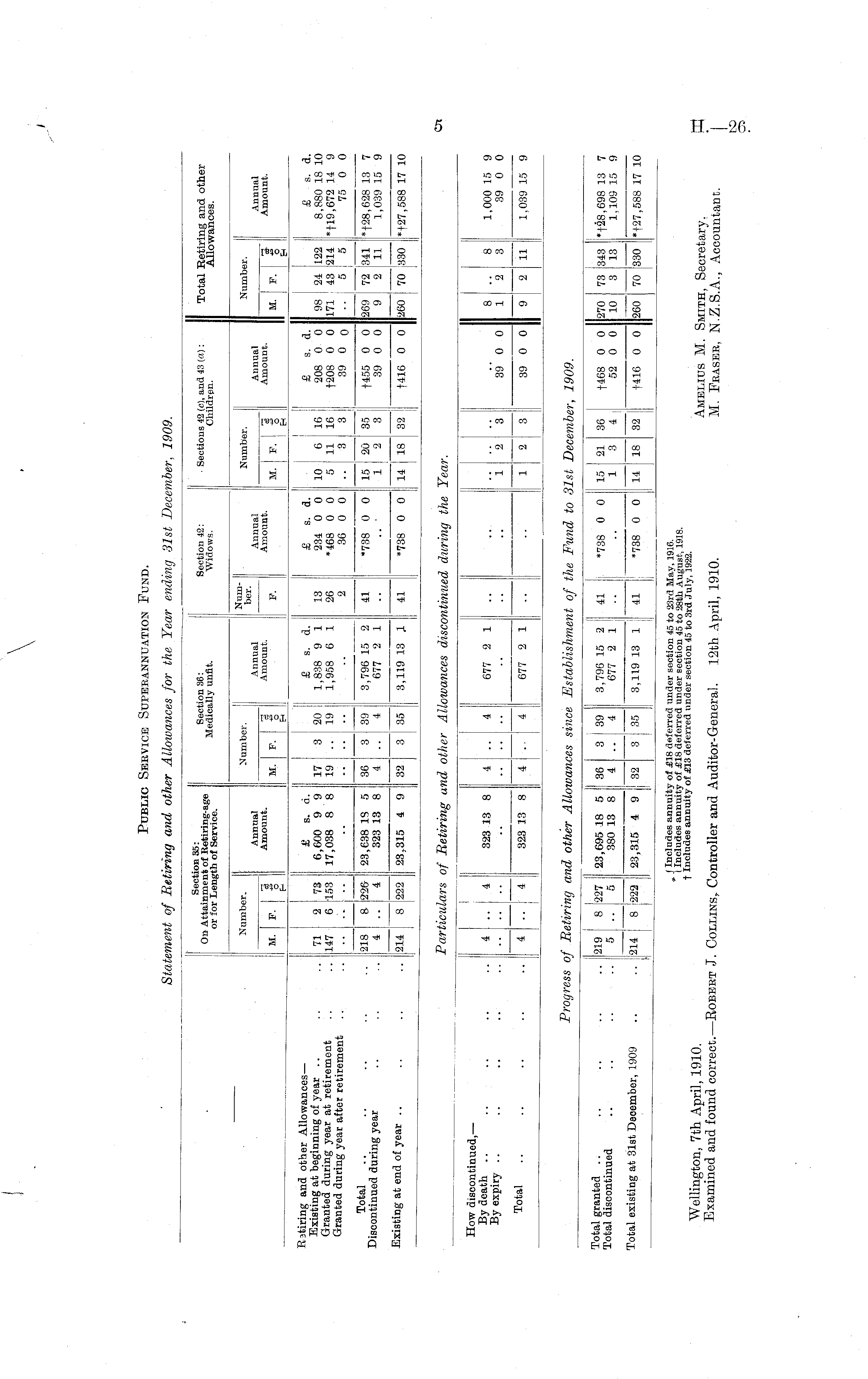 Section 85: On Attainment of Retiring-age or for Length of Service. Section 36: Medically unfit. Section 42: Widows. • Sections 42 (c), and 43 (a): Children. Total Retiring and other Allowances. Ni [mb< T. Annual Amount. ximber. Annual Amount. Number. Annual Amount. Numbi M. F. !1\ Annual Amount. Number. M. F. I Annual Amount. M. F. o M. TT £ F. 15 R3tiring and other Allowances — Existing at beginning of year .. Granted during year at retirement Granted during year after retirement 71 147 2 I ■ * i 73 153 £ s. a. 6,600 9 9 17,038 8 8 17 19 3 20 I 19 J £ s. d. 1,838 9 1 1,958 6 1 13 26 I 2 I £ s. d. 234 0 0 *468 0 0 36 0 0 10 j 6 5 11 3 15 J 20 1 2 16 16 3 £ s. d. 208 0 0 t208 0 0 39 0 o f455 0 0 39 0 0 98 ! 24 171 ! 43 .. j 5 269 72 9 2 122 214 5 £ s. d. 8,880 18 10 •fl9,672 14 9 75 0 0 ■" Total Discontinued during year 218 IT 226 i I 23,638 18 5 323 13 8 36 4 3 39 4 ■ ! 3,796 15 2 677 2 1 41 "738 0 0 35 ! 3 341 11 *f28,628 13 7 1,039 15 9 - Existing at end of year .. 214 — 8 — 23,315 4 9 32 ! 3 35 3,119 13 X 41 *738 0 0 14 18 32 |416 0 0 260 70 j |33O *f27,588 17 10 222 I I I