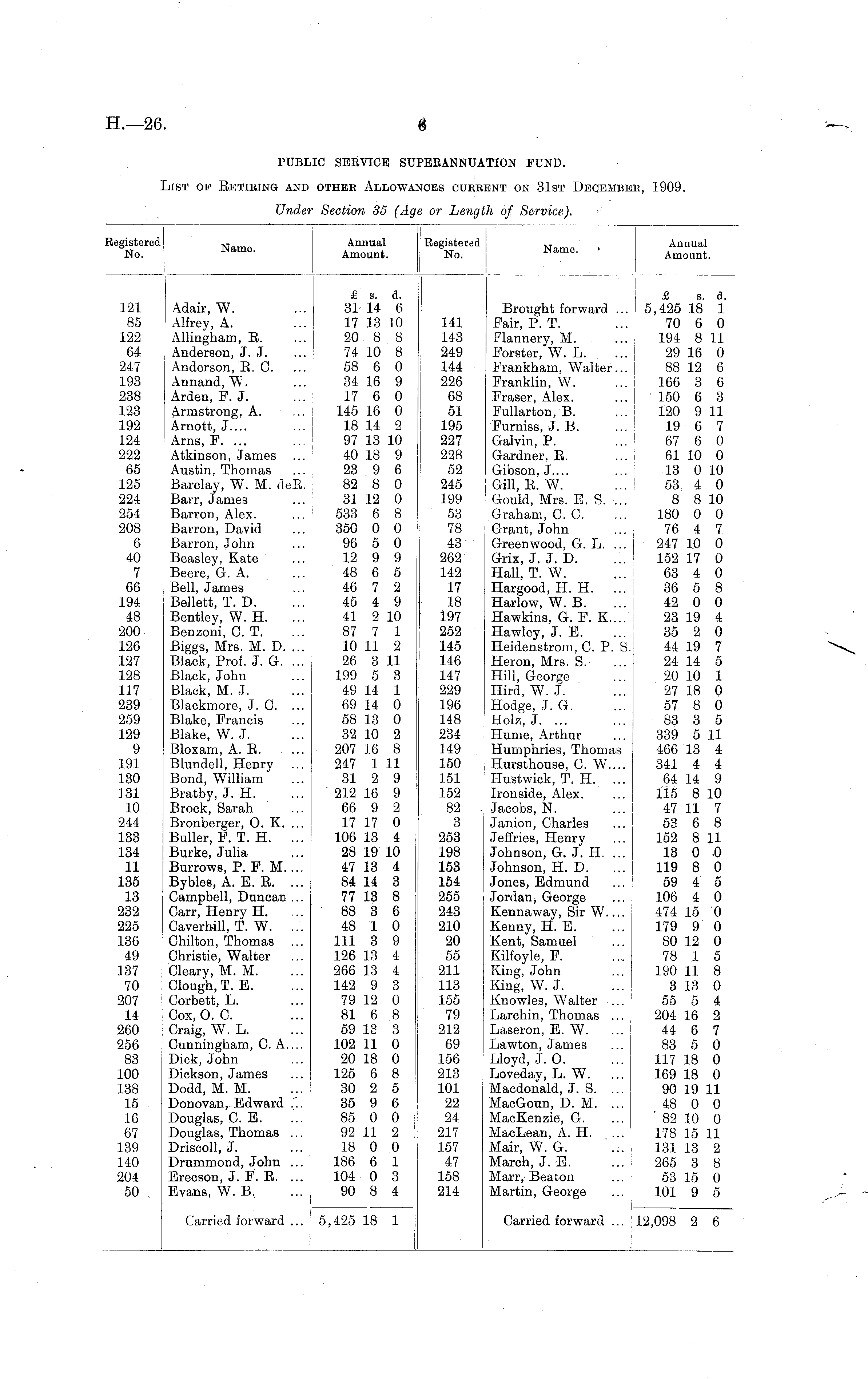 PUBLIC SERVICE SUPERANNUATION FUND. List of Retiring and other Allowances current on 31st December, 1909. Under Section 35 (Age or Length of Service).