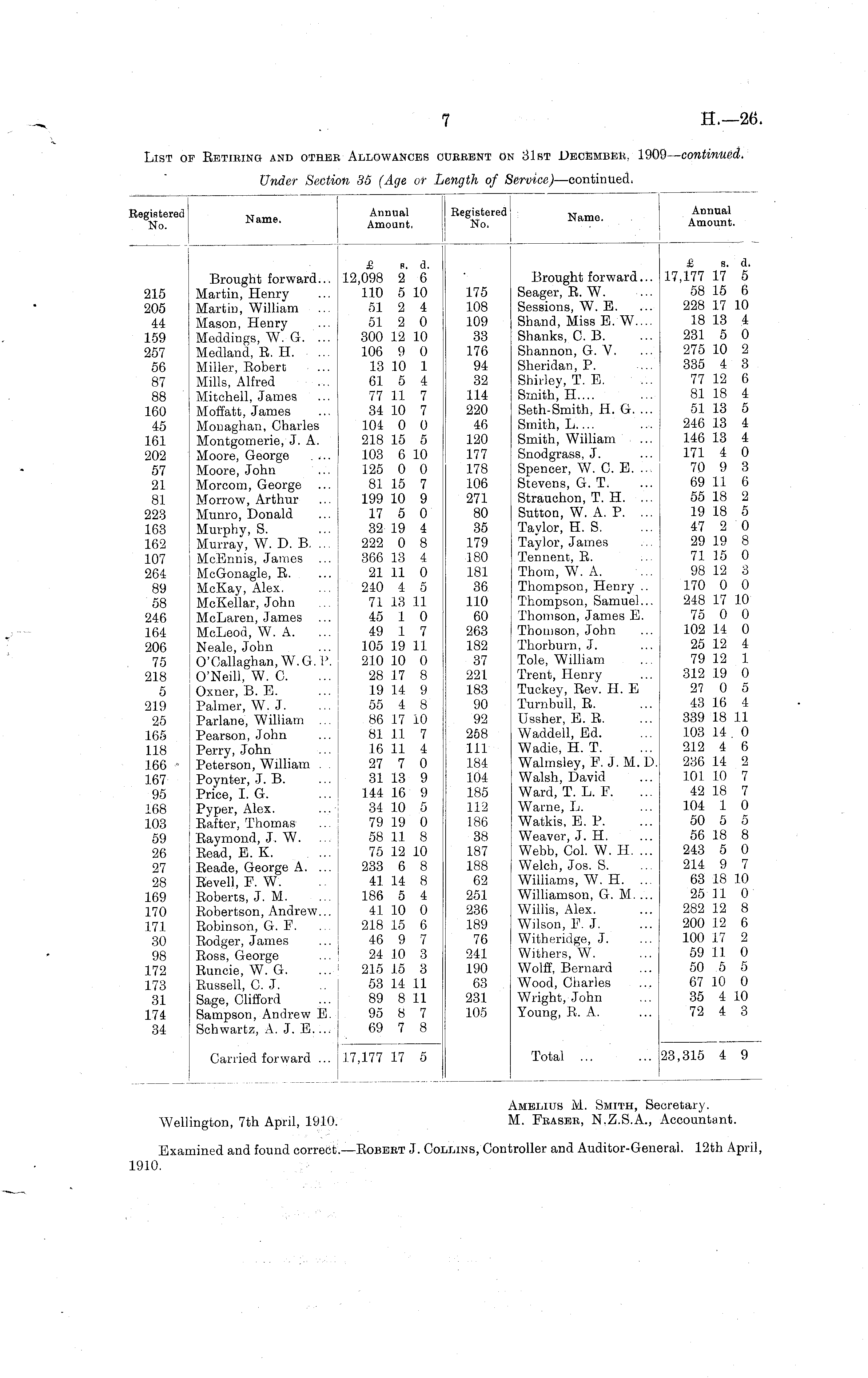 List of Retiring and other Allowances current on 31st December, 1909 — continued. Under Section 35 (Age or Length of Service) —continued.
