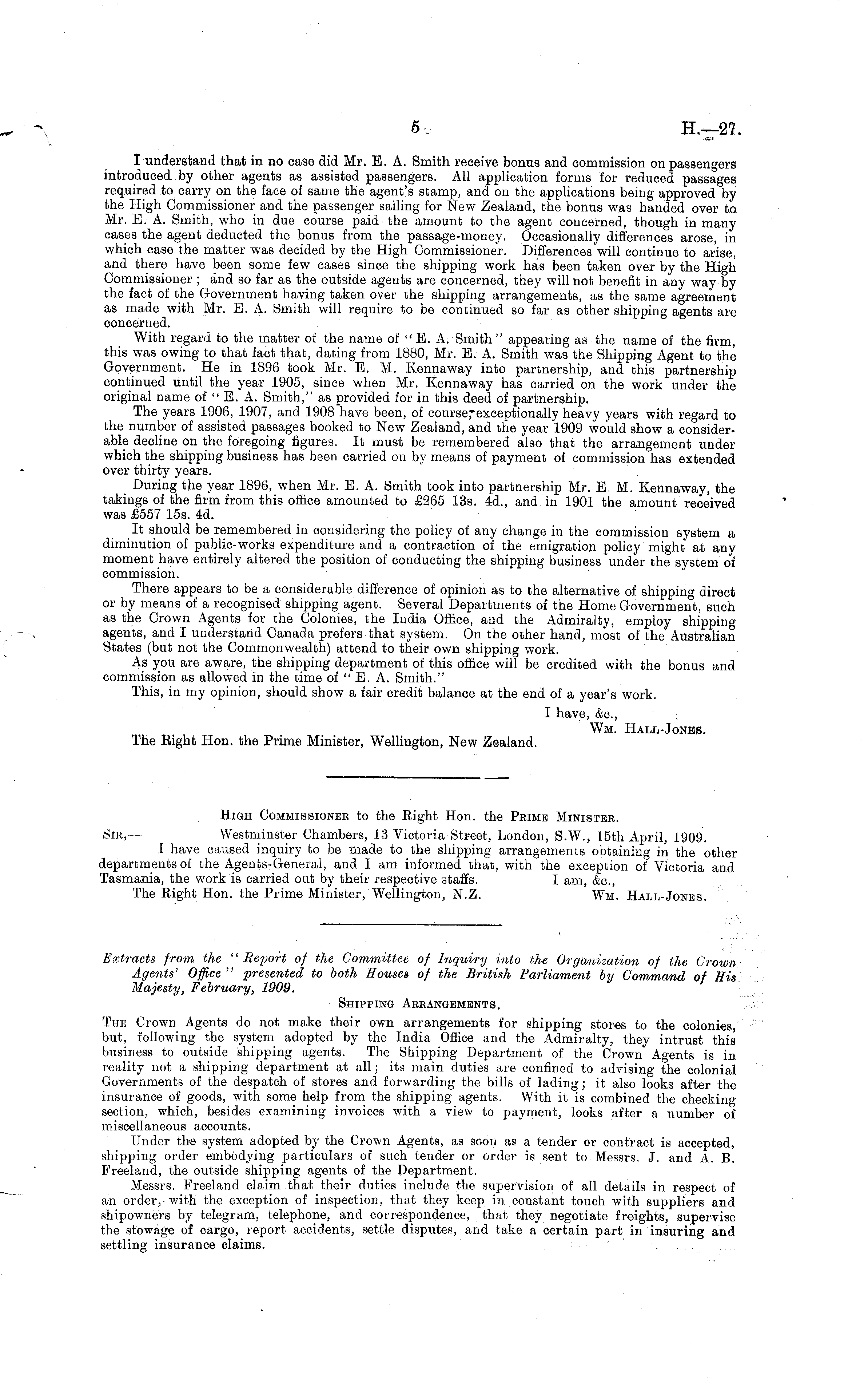 High Commissioner to the Right Hon. the Prime Minister. Sir, — Westminster Chambers, 13 Victoria Street, London, S.W., 15th April, 1909. I have caused inquiry to be made to the shipping arrangements obtaining in the other departments of the Agents-General, and I am informed that, with the exception of Victoria and Tasmania, the work is carried out by their respective staffs. I am, &c, The Right Hon. the Prime Minister, Wellington, N.Z. Wm. Hall-Jones.