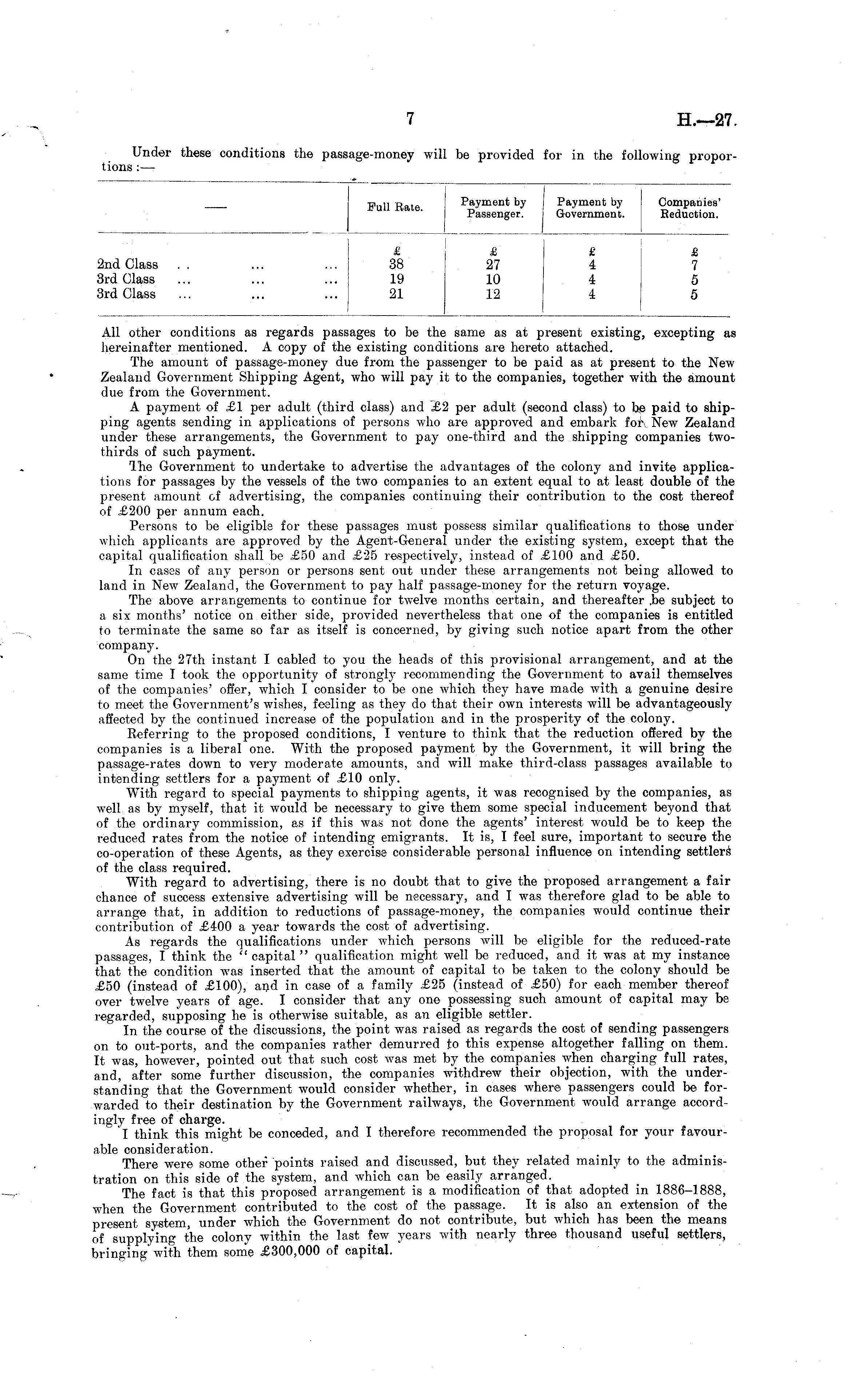 All other conditions as regards passages to be the same as at present existing, excepting as hereinafter mentioned. A copy of the existing conditions are hereto attached. The amount of passage-money due from the passenger to be paid as at present to the New Zealand Government Shipping Agent, who will pay it to the companies, together with the amount due from the Government. A payment of £1 per adult (third class) and £2 per adult (second class) to be paid to shipping agents sending in applications of persons who are approved and embark for. New Zealand under these arrangements, the Government to pay one-third and the shipping companies twothirds of such payment. Ihe Government to undertake to advertise the advantages of the colony and invite applications for passages by the vessels of the two companies to an extent equal to at least double of the present amount of advertising, the companies continuing their contribution to the cost thereof of £200 per annum each. Persons to be eligible for these passages must possess similar qualifications to those under which applicants are approved by the Agent-General under the existing system, except that the capital qualification shall be £50 and £25 respectively, instead of £100 and £50. In cases of any person or persons sent out under these arrangements not being allowed to land in New Zealand, the Government to pay half passage-money for the return voyage. The above arrangements to continue for twelve months certain, and thereafter he subject to a six months' notice on either side, provided nevertheless that one of the companies is entitled to terminate the same so far as itself is concerned, by giving such notice apart from the other company. On the 27th instant I cabled to you the heads of this provisional arrangement, and at the same time I took the opportunity of strongly recommending the Government to avail themselves of the companies' offer, which I consider to be one which they have made with a genuine desire to meet the Government's wishes, feeling as they do that their own interests will be advantageously affected by the continued increase of the population and in the prosperity of the colony. Referring to the proposed conditions, I venture to think that the reduction offered by the companies is a liberal one. With the proposed payment by the Government, it will bring the passage-rates down to very moderate amounts, and will make third-class passages available to intending settlers for a payment of £10 only. With regard to special payments to shipping agents, it was recognised by the companies, as well as by myself, that it would be necessary to give them some special inducement beyond that of the ordinary commission, as if this was not done the agents' interest would be to keep the reduced rates from the notice of intending emigrants. It is, I feel sure, important to secure the co-operation of these Agents, as they exercise considerable personal influence on intending settlers of the class required. With regard to advertising, there is no doubt that to give the proposed arrangement a fair chance of success extensive advertising will be necessary, and I was therefore glad to be able to arrange that, in addition to reductions of passage-money, the companies would continue their contribution of £400 a year towards the cost of advertising. As regards the qualifications under which persons will be eligible for the reduced-rate passages, I think the " capital " qualification might well be reduced, and it was at my instance that the condition was inserted that the amount of capital to be taken to the colony should be £50 (instead of £100), and in case of a family £25 (instead of £50) for each member thereof over twelve years of age. I consider that any one possessing such amount of capital may be regarded, supposing he is otherwise suitable, as an eligible settler. In the course of the discussions, the point was raised as regards the cost of sending passengers on to out-ports, and the companies rather demurred to this expense altogether falling on them.. It was, however, pointed out that such cost was met by the companies when charging full rates, and, after some further discussion, the companies withdrew their objection, with the understanding that the Government would consider whether, in cases where passengers could be forwarded to their destination by the Government railways, the Government would arrange accordingly free of charge. I think this might be conceded, and I therefore recommended the proposal for your favourable consideration. There were some other points raised and discussed, but they related mainly to the administration on this side of the system, and which can be easily arranged. The fact is that this proposed arrangement is a modification of that adopted in 1886-1888, when the Government contributed to the cost of the passage. It is also an extension of the present system, under which the Government do not contribute, but which has been the means of supplying the colony within the last few years with nearly three thousand useful settlers, bringing with them some £300,000 of capital.
