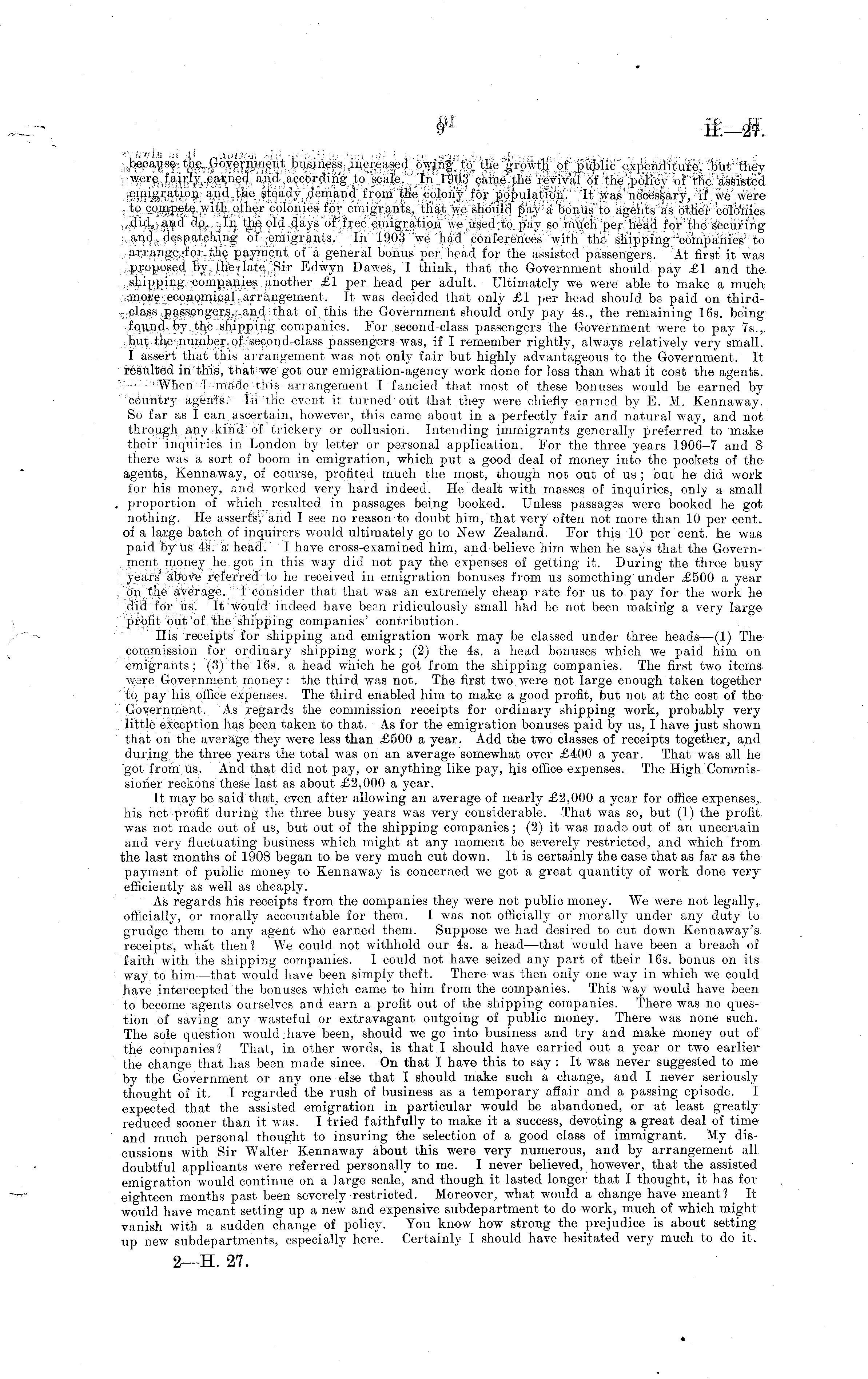 because the Govern men! business nitit.isul owing to the giowth of public expenditure, but they were,,fairly earned, and .according to scale. In 1903 came the revival of the .policy of the assisted emigration and .the steady demand from the colony for population. It jvas necessary, if we were . to compete with other colonies for emigrants, that we should pay a bonus to agents as other colonies .did,,and' do. ,In the old days'of free emigration \yo.used;to.pay so much per"'head' for'the securing ; an ; d, despatching of emigrants. In 1903 we had conferences with the shipping companies 1 to , arrange :f or. the payment of "a general bonus per head for the assisted passengers. At first it was proposed by the late Sir Edwyn Dawes, I think, that the Government should pay £1 and the . shipping companies another £1 per head per adult. Ultimately we were able to make a much :, more,economical, arrangement. It was decided that only £1 per head should be paid on third- , class passengers,:.and that of this the Government should only pay 45., the remaining 16s. being found, by the .shipping companies. For second-class passengers the Government were to pay 75., but the number of.second-class passengers was, if I remember rightly, always relatively very small. I assert that this arrangement was not only fair but highly advantageous to the Government. It resulted in this, that'we got our emigration-agency work done for less than what it cost the agents. 'When I-made this arrangement I fancied that most of these bonuses would be earned by country agents/ Li 'the event it turned out that they were chiefly earned by E. M. Kennaway. So far as I can ascertain, however, this came about in a perfectly fair and natural way, and not through any,kind of trickery or collusion. Intending immigrants generally preferred to make their inquiries in London by letter or personal application. For the three years 1906-7 and 8 there was a sort of boom in emigration, which put a good deal of money into the pockets of the agents, Kennaway, of course, profited much the most, though not out of us ; but he did work for his monej', and worked very hard indeed. He dealt with masses of inquiries, only a small proportion of which resulted in passages being booked. Unless passages were booked he got nothing. He asserts; and I see no reason to doubt him, that very often not more than 10 per cent. of a large batch of inquirers would ultimately go to New Zealand. For this 10 per cent, he was paid by us 4s. a head. I have cross-examined him, and believe him when he says that the Government money he got in this way did not pay the expenses of getting it. During the three busy years above referred to he received in emigration bonuses from us something'under £500 a year on the average. I consider that that was an extremely cheap rate for us to pay for the work he did for us. It would indeed have bean ridiculously small had he not been making a very large profit out of the shipping companies' contribution. His receipts for shipping and emigration work may be classed under three heads—(l) The commission for ordinary shipping work; (2) the 4s. a head bonuses which we paid him on emigrants; (3) the 16s. a head which he got from the shipping companies. The first two items were Government money: the third was not. The first two were not large enough taken together to pay his office expenses. The third enabled him to make a good profit, but not at the cost of the Government. As regards the commission receipts for ordinary shipping work, probably very little exception has been taken to that. As for the emigration bonuses paid by us, I have just shown that on the average they were less than £500 a year. Add the two classes of receipts together, and during the three years the total was on an average somewhat over £400 a year. That was all he got from us. And that did not pay, or anything like pay, his office expenses. The High Commissioner reckons these last as about £2,000 a year. It may be said that, even after allowing an average of nearly £2,000 a year for office expenses, his net profit during the three busy years was very considerable. That was so, but (1) the profit was not made out of us, but out of the shipping companies; (2) it was made out of an uncertain and very fluctuating business which might at any moment be severely restricted, and which from the last months of 1908 began to be very much cut down. It is certainly the case that as far as the payment of public money to Kennaway is concerned we got a great quantity of work done very efficiently as well as cheaply. As regards his receipts from the companies they were not public money. We were not legally, officially, or morally accountable for them. I was not officially or morally under any duty to grudge them to any agent who earned them. Suppose we had desired to cut down Kennaway's receipts, what then? We could not withhold our 4s. a head—that would have been a breach of faith with the shipping companies. 1 could not have seized any part of their 16s. bonus on its way to him—that would have been simply theft. There was then only one way in which we could have intercepted the bonuses which came to him from the companies. This way would have been to become agents ourselves and earn a profit out of the shipping companies. There was no question of saving any wasteful or extravagant outgoing of public money. There was none such. The sole question would.have been, should we go into business and try and make money out of the companies? That, in other words, is that I should have carried out a year or two earlier the change that has been made since. On that I have this to say :It was never suggested to me by the Government or any one else that I should make such a change, and I never seriously thought of it. I regarded the rush of business as a temporary affair and a passing episode. I expected that the assisted emigration in particular would be abandoned, or at least greatly 