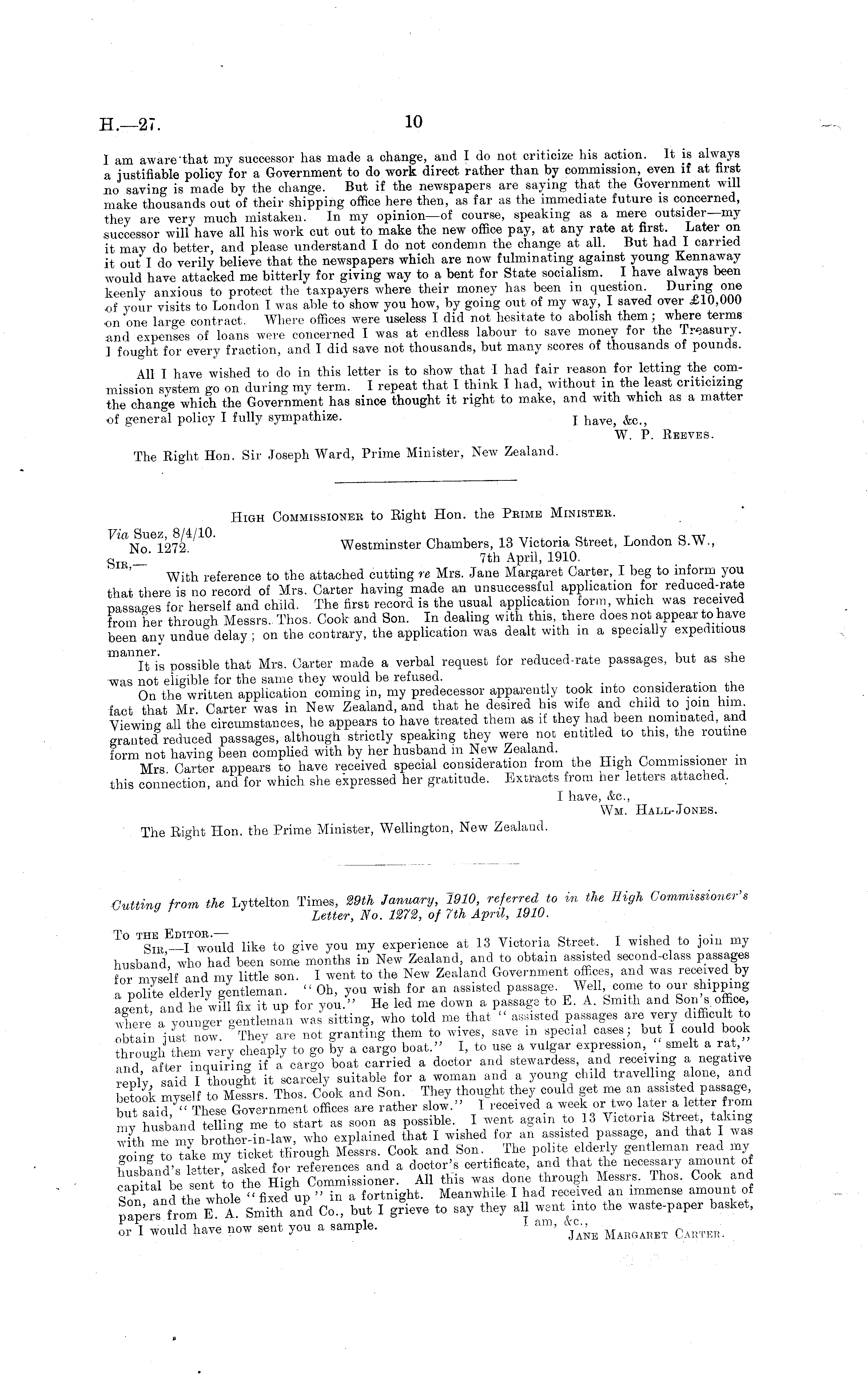 High Commissioner to Right Hon. the Prime Minister. m N Q ' Westminster Chambers, 13 Victoria Street, London S.W., gIE _' ' 7th April, 1910. With reference to the attached cutting re Mrs. Jane Margaret Carter, I beg to inform you that there is no record of Mrs. Carter having made an unsuccessful application for reduced-rate passages for herself and child. The first record is the usual application form which was received from her through Messrs.. Thos. Cook and Son. In dealing with this, there does not appear to have been any undue delay ; on the contrary, the application was dealt with in a specially expeditious It is possible that Mrs. Carter made a verbal request for reduced-rate passages, but as she was not eligible for the same they would be refused. On the written application coming in, my predecessor apparently took into consideration the fact that Mr. Carter was in New Zealand, and that he desired his wife and child to join bm Viewing all the circumstances, he appears to have treated them as if they had been nominated, and granted reduced passages, although strictly speaking they were not entitled to this, the routine form not having been complied with by her husband m New Zealand. Mrs Carter appears to have received special consideration from the High Commissioner in this connection, and for which she expressed her gratitude. Extracts from her letters attached. I have, &c, Wm. Hall-Jones. The Right Hon. the Prime Minister, Wellington, New Zealand.
