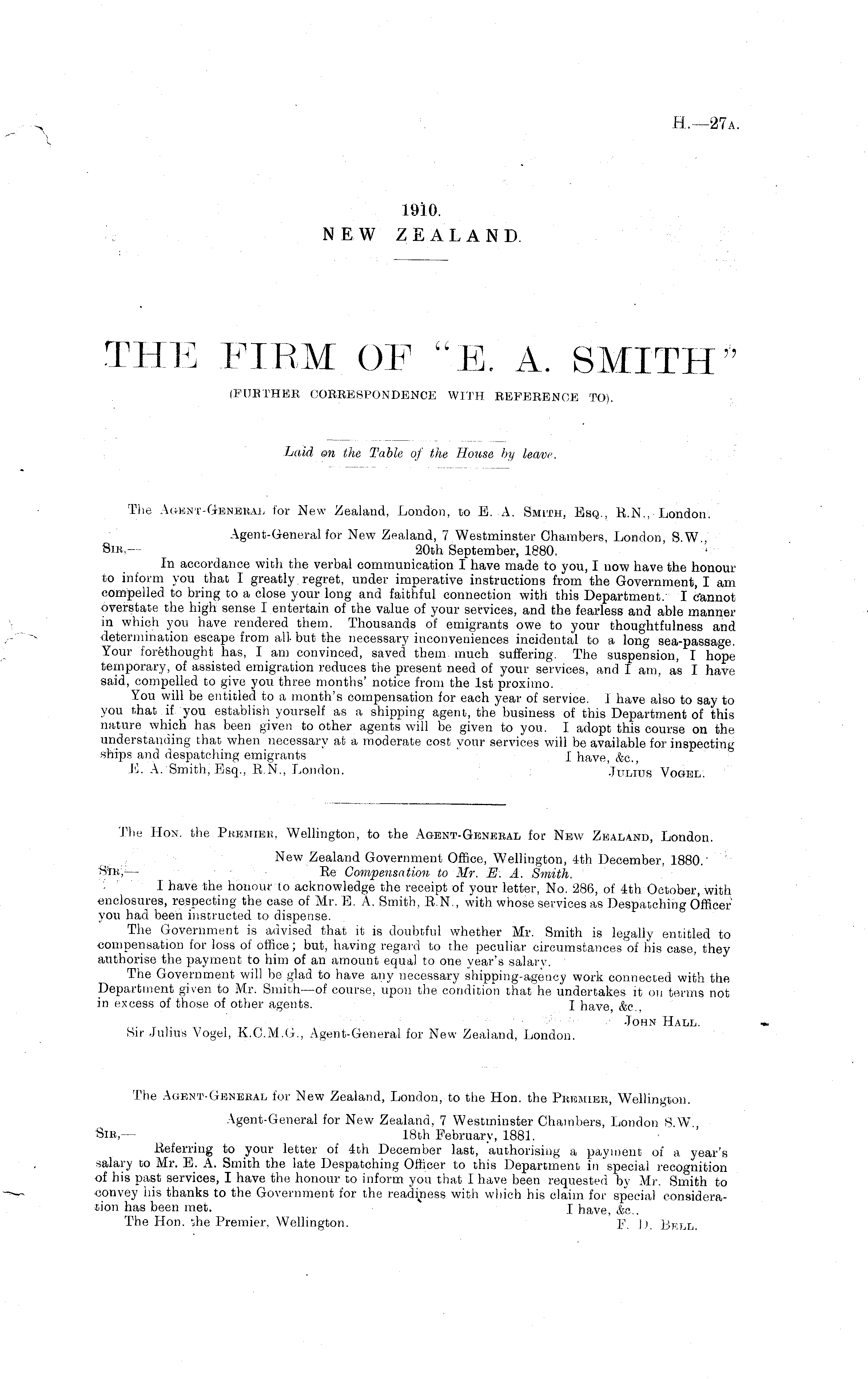 The Hon. the Pbemiek, Wellington, to the Agent-Gbnebal for New Zealand, London. New Zealand Government Office, Wellington, 4th December, 1880.' S£bV — Re Compensation to Mr. E. A. Smith. I have the honour to acknowledge the receipt of your letter, No. 286, of 4th October, with enclosures, respecting the case of Mr. E. A. Smith, E.N., with whose services as Despatching Officer you had been instructed to dispense. The Government is advised that it is doubtful whether Mr. Smith is legally entitled to compensation for loss of office; but, having regard to the peculiar circumstances of his case, they authorise the payment to him of an amount equal to one year's salary. The Government will be glad to have any necessary shipping-agency work connected with the Department given to Mr. Smith—of course, upon the condition that he undertakes it on terms not in excess of those of other agents. I have, &c, John Hall. Sir Julius Vogel, K.C.M.G., Agent-General for New Zealand, London. The Agent-General for New Zealand, London, to the Hon. the Premier, Wellington. Agent-General for New Zealand, 7 Westminster Chambers, London S. W Sir,— 18th February, 1881. Referring to your letter of 4th December last, 'authorising a payment of a year's salary to Mr. E. A. Smith the late Despatching Officer to this Department in special recognition of his past services, I have the honour to inform you that I have been requested by Mr. Smith to convey his thanks to the Government for the readiness with which his claim for special consideration has been met. I have, &c. The lion, she Premier, Wellington. F. I ). Bell.
