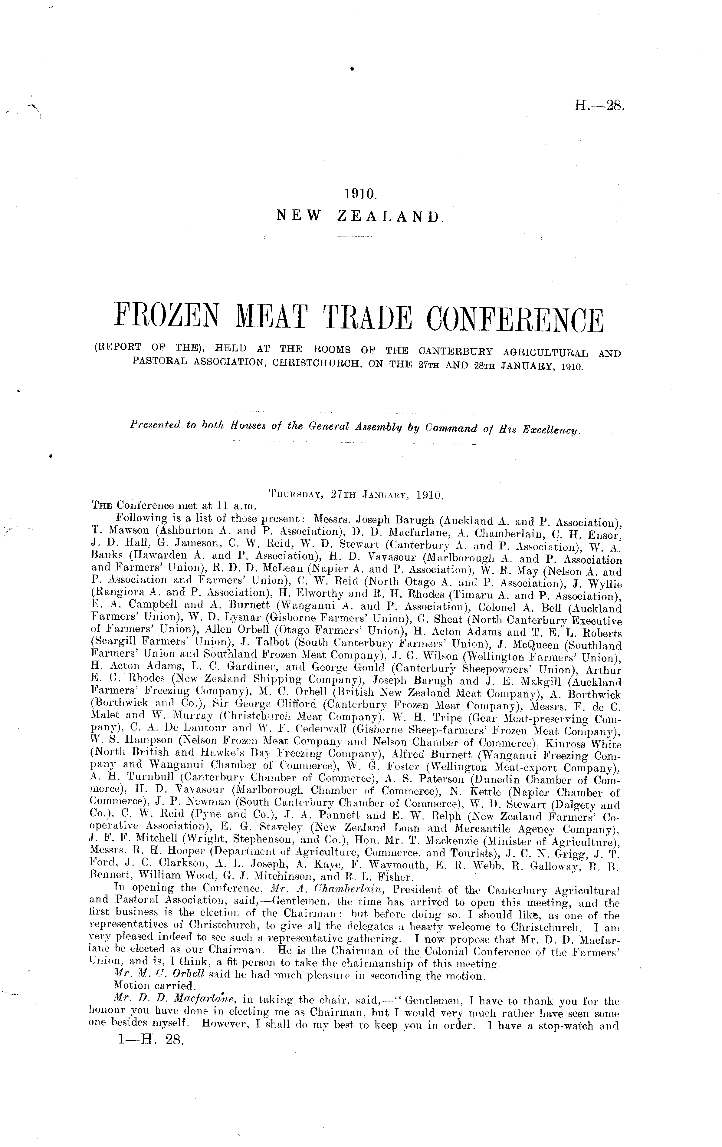 Thursday, 27th January, 1910. The Conference met at 11 a.m. Following is a list of those present: Messrs. Joseph Barugh (Auckland A. and P Association) T. Mawson (Ashburton A. and P. Association), D. D. Macfarlane, A. Chamberlain, C. H Ensor J. D. Hall, G. Jameson, C. W. Reid, W. D. Stewart (Canterbury A. and P. Association)' W A. Banks (Hawarden A. and P. Association), H. D. Vavasour (Marlborough A. and P Association and Farmers' Union), R. D. D. McLean (Napier A. and P. Association), W. R. May (Nelson A. and P. Association and Farmers' Union), C. W. Reid (North Otago A. and P. Association), J. Wyllie (Rangiora A. and P. Association), H. Ehvorthy and R. H. Rhodes (Timaru A. and P. Association), E. A. Campbell and A. Burnett (Wanganui A. and P. Association), Colonel A. Bell (Auckland Farmers' Union), W. D. Lysnar (Gisborne Farmers' Union), G. Sheat (North Canterbury Executive of Farmers' Union), Allen Orbell (Otago Farmers' Union), H. Acton Adams and T. E. L Roberts (Scargill Farmers' Union), J. Talbot (South Canterbury Farmers' Union), J. McQueen (Southland Farmers' Union and Southland Frozen Meat Company), J. G. Wilson (Wellington Farmers' Union), H. Acton Adams, L. C. Gardiner, and George Gould (Canterbury Shipowners' Union), Arthur E. G. Rhodes (New Zealand Shipping Company), Joseph Barugh and J. E. Makgill (Auckland Farmers' Freezing Company), M. C. Orbell (British New Zealand Meat Company), A. Borthwick (Borthwick and Co.), Sir George Clifford (Canterbury Frozen Meat Company), Messrs F de C Malet and W. Murray (Christclmrch Meat Company), W. H. Tripe (Gear Meat-preserving Company), C. A. De Lautour and W. F. Cederwall (Gisborne Sheep-farmers' Frozen Meat Company), W. S. Hampson (Nelson Frozen Meat Company and Nelson Chamber of Commerce), Kinross White (North British and Hawke's Bay Freezing Company), Alfred Burnett (Wanganui Freezing Company and Wanganui Chamber of Commerce), W. G. Foster (Wellington Meat-export Company), A. H. Turnbull (Canterbury Chamber of Commerce), A. S. Paterson (Dunedin Chamber of Commerce), H. D. Vavasour (Marlborough Chamber of Commerce), N. Kettle (Napier Chamber of Commerce), J. P. Newman (South Canterbury Chamber of Commerce), W. D. Stewart (Dalgety and Co.), C. W. Reid (Pyne and Co.), J. A. Pannett and E. W. Relph (New Zealand Farmers' Cooperative Association), E. G. Staveley (New Zealand Loan and Mercantile Agency Company), J. F. F. Mitchell (Wright, Stephenson, and Co.), Hon. Mr. T. Mackenzie (Minister of Agriculture), Messrs. R. H. Hooper (Department of Agriculture, Commerce, and Tourists), J. C. N. Grigg, J T Ford, J. C. Clarkson, A. L. Joseph, A. Kaye, F. Waymouth, E. R. Webb, R Galloway R. B. Bennett, William Wood, G. J. Mitchinson, and R. L. Fisher. In opening the Conference, Mr. A. Chamberlain, President of the Canterbury Agricultural and Pastoral Association, said, —Gentlemen, the time has arrived to open this meeting, and the first business is the election of the Chairman; but before doing so, I should like, as one of the representatives of Christchurch, to give all the delegates a hearty welcome to Christchurch. I am very pleased indeed to see such a representative gathering. I now propose that Mr. D. D. Macfarlane be elected as our Chairman. He is the Chairman of the Colonial Conference of the Farmers' Union, and is, I think, a fit person to take the chairmanship of this meeting Mr. M. O. Orbell said he had much pleasure in seconding the motion. Motion carried. Mr. J). D. Macfarlcme, in taking the chair, said, —" Gentlemen, I have to thank you for the honour you have done in electing me as Chairman, but I would very much rather have seen some one besides myself. However, T shall do my best to keep you in order. I have a stop-watch and