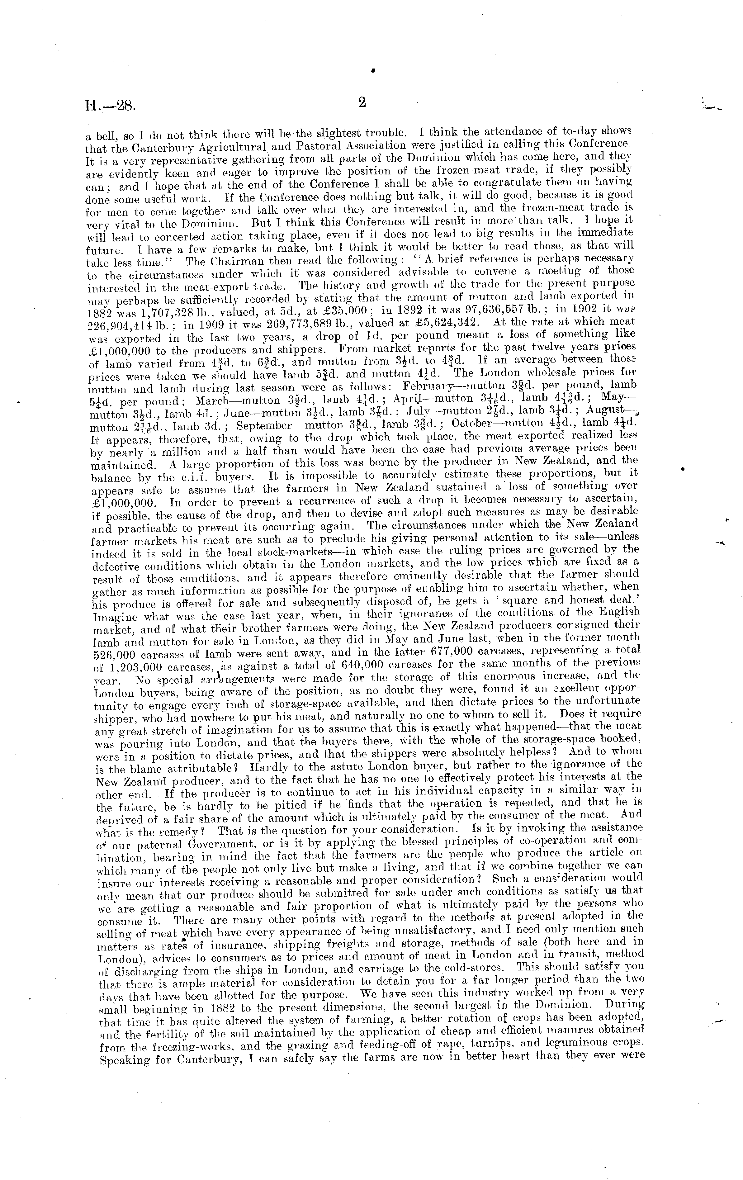 a bell, so Ido not think there will be the slightest trouble. I think the attendance of to-day shows that the Canterbury Agricultural and Pastoral Association were justified in calling this Conference. It is a very representative gathering from all parts of the Dominion which has come here, and they are evidently keen and eager to improve the position of the frozen-meat trade, if they possibly can ■ and I hope that at the end of the Conference 1 shall be able to congratulate them on having done some useful work. If the Conference does nothing but talk, it will do good, because it is good for men to come together and talk over what they are interested in, and the frozen-meat trade is very vital to the Dominion. But I think this Conference will result in more'than talk. I hope it will lead to concerted action taking place, even if it does not lead to big results in the immediate future I have a few remarks to make, but I think it would be better to read those, as that will take less time." The Chairman then read the following :" A brief reference , is perhaps necessary to the circumstances under which it was considered advisable to convene a meeting of those interested in the meat-export trade. The history and growth of the trade for the present purpose may perhaps be sufficiently recorded by stating that the amount of mutton and lamb exported in 1882 was 1 707,3281b., valued, at 5d., at £35,000; in 1892 it was 97,636,5571b. ; in 1902 it was 226 904,414 lb. : in 1909 it was 269,773,689 lb., valued at £5,624,342. At the rate at which meat was exported in the last two years, a drop of Id. per pound meant a loss of something like £] 000 000 to the producers arid shippers. From market reports for the past twelve years prices of lamb varied from 4fd. to 6|d., and mutton from 3|d. to 4fd. If an average between those prices were taken we should have lamb sf-d. and mutton 4Jd. The London wholesale prices for mutton and lamb during last season were as follows: February—mutton 3|d. per pound, lamb aid per pound; March—mutton 3fd., lamb 4£d. ; April—mutton lamb 4ifd.; Maymutton 3W., lamb id. ; June—mutton 3|d., lamb 3fd. ; July—mutton 2fd., lamb 3£d. ; August—,, mutton 2"d, lamb 3d.; September—mutton 3|d., lamb 3fd.; October—mutton 4|d., lamb 4Jd. It appears, therefore, that, owing to the drop which took place, the meat exported realized less by nearly a million and a half than would have been the case had previous average prices been maintained. A large proportion of this loss was borne by the producer in New Zealand, and the balance by the c.i.f. bikers. It is impossible to accurately estimate these proportions, but it appears safe to assume'that the farmers in New Zealand sustained a loss of something over £1,000,000. In order to prevent a recurrence of such a drop it becomes necessary to ascertain, if possible, the cause of the drop, and then to devise and adopt such measures as may be desirable and practicable to prevent its occurring again. The circumstances under which the New Zealand farmer markets his meat are such as to preclude his giving personal attention to its sale—unless indeed it is sold in the local stock-markets —in which case the ruling prices are governed by the defective conditions which obtain in the London markets, and the low prices which are fixed as a result of those conditions, and it appears therefore eminently desirable that the farmer should o-ather as much information as possible for the purpose of enabling him to ascertain whether, when his produce is offered for sale and subsequently disposed of, he gets a ' square and honest deal ' Imagine what was the case last year, when, in their ignorance of the conditions of the English market and of what their brother farmers were doing, the New Zealand producers consigned thenlamb and mutton for sale in London, as they did in May and June last, when in the former month 526 000 carcases of lamb were sent away, and in the latter 677,000 carcases, representing a total of 1,203,000 carcases, as against a total of 640,000 carcases for the same months of the previous year' No special arAngementg were made for the storage of this enormous increase, and the London buyers, being aware of the position, as no doubt they were, found it an excellent opportunity to engage every inch of storage-space available, and then dictate prices to the unfortunate shipper who had nowhere to put his meat, and naturally no one to whom to sell it. Does it require any great stretch of imagination for us to assume that this is exactly what happened—that the meat was pouring into London, and that the buyers there, with the whole of the storage-space booked, were, in a position to dictate prices, and that the shippers were absolutely helpless ? And to whom is the blame attributable ? Hardly to the astute London buyer, but rather to the ignorance of the New Zealand producer, and to the fact that he has no one to effectively protect his interests at the other end . If the producer is to continue to act in his individual capacity in a similar way in the future, he is hardly to be pitied if he finds that the operation is repeated, and that he is deprived of a fair share of the amount which is ultimately paid by the consumer of the meat. And what is the remedy? That is the question for your consideration. Is it by invoking the assistance of our paternal Government, or is it by applying the blessed principles of co-operation and combination bearing in mind the fact that the farmers are the people who produce the article on which many of the people not only live but make a living, and that if we combine together we can insure our'interests receiving a reasonable and proper consideration? Such a consideration would only mean that our produce should be submitted for sale under such conditions as satisfy us that we 'are getting a reasonable and fair proportion of what is ultimately paid by the persons who consume it. There are many other 