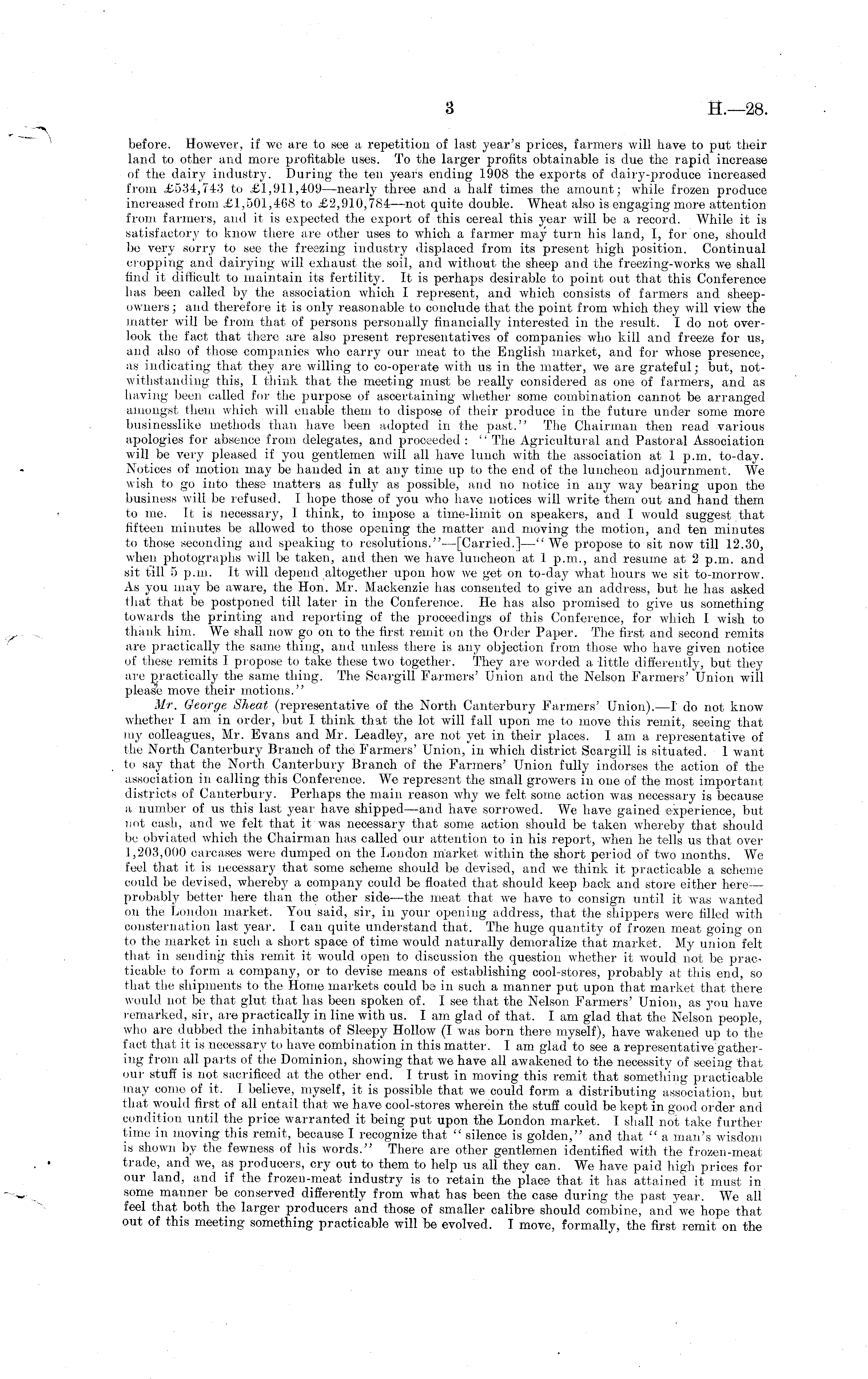 before. However, if we are to see a repetition of last year's prices, farmers will have to put their land to other and more profitable uses. To the larger profits obtainable is due the rapid increase of the dairy industry. During the ten years ending 1908 the exports of dairy-produce increased from £534,743 to £1,911,409 —nearly r three and a half times the amount; while frozen produce increased from £1,501,408 to £2,910,784 —not quite double. Wheat also is engaging more attention from farmers, and it is expected the export of this cereal this year will be a record. While it is satisfactory to know there are other uses to which a farmer may turn his land, I, for one, should be very sorry to see the freezing industry displaced from its present high position. Continual cropping and dairying will exhaust the soil, and without the sheep and the freezing-works we shall find it difficult to maintain its fertility. It is perhaps desirable to point out that this Conference has been called by the association which I represent, and which consists of farmers and sheepowners ; and therefore it is only reasonable to conclude that the point from which they will view the matter will be from that of persons personally financially interested in the result. Ido not overlook the fact that there are also present representatives of companies who kill and freeze for us, and also of those companies who carry our meat to the English market, and for whose presence, as indicating that they are willing to co-operate with us in the matter, we are grateful; but, notwithstanding this, I think that the meeting must be really considered as one of farmers, and as having been called for the purpose of ascertaining whether some combination cannot be arranged amongst them which will enable them to dispose of their produce in the future under some more businesslike methods than have been adopted in the past." The Chairman then read various apologies for absence from delegates, and proceeded: " The Agricultural and Pastoral Association will be very pleased if you gentlemen will all have lunch with the association at 1 p.m. to-day. Notices of motion may be handed in at any time up to the end of the luncheon adjournment. We wish to go into these matters as fully as possible, and no notice in any way bearing upon the business will be refused. I hope those of you who have uotices will write them out and hand them to me. It is necessary, 1 think, to impose a time-limit on speakers, and I would suggest that fifteen minutes be allowed to those opening the matter and moving the motion, and ten minutes to those seconding and speaking to resolutions." —[Carried.] —"We propose to sit now till 12.30, when photographs will be taken, and then we have luncheon at 1 p.m., and resume at 2 p.m. and sit till 5 p.m. It will depend altogether upon how we get on to-day what hours we sit to-morrow. As you may be aware, the Hon. Mr. Mackenzie has consented to give an address, but he has asked that that be postponed till later in the Conference. He has also promised to give us something towards the printing and reporting of the proceedings of this Conference, for which I wish to thank him. We shall now go on to the first remit on the Order Paper. The first and second remits are practically the same thing, and unless there is any objection from those who have given notice of these remits I propose to take these two together. They are warded a little differently, but they are practically the same thing. The Scargill Farmers' Union and the Nelson Farmers' Union will please move their motions." Mr. George Sheat (representative of the North Canterbury Farmers' Union). —I do not know whether I am in order, but I think that the lot will fall upon me to move this remit, seeing that my colleagues, Mr. Evans and Mr. Leadley, are not yet in their places. lam a representative of the North Canterbury Branch of the Farmers' Union, in which district Scargill is situated. 1 want to say that the North Canterbury Branch of the Farmers' Union fully indorses the action of the association in calling this Conference. We represent the small growers in one of the most important districts of Canterbury. Perhaps the main reason why we felt some action was necessary is because a number of us this last year have shipped—and have sorrowed. We have gained experience, but not cash, and we felt that it was necessary that some action should be taken whereby that should be obviated which the Chairman has called our attention to in his report, when he tells us that over 1,203,000 carcases were dumped on the London market within the short period of two months. We feel that it is necessary that some scheme should be devised, and we think it practicable a scheme could be devised, whereby a company could be floated that should keep back and store either here— probably better here than the other side —the meat that we have to consign until it was wanted on the London market. You said, sir, in your opening address, that the shippers were filled with consternation last year. I can quite understand that. The huge quantity of frozen meat going on to the market in such a short space of time would naturally demoralize that market. My union felt that in sending this remit it would open to discussion the question whether it would not be practicable to form a company, or to devise means of establishing cool-stores, probably at this end, so that the shipments to the Home markets could be in such a manner put upon that market that there would not be that glut that has been spoken of. I see that the Nelson Farmers' Union, as you have remarked, sir, are practically in line with us. I am glad of that. lam glad that the Nelson people, who are dubbed the inhabitants of Sleepy Hollow (I was born there myself), have wakened up to the fact that it is necessary to have combination in this matter. I am glad to see a representative gathering from all parts of the Dominion, showing that we h