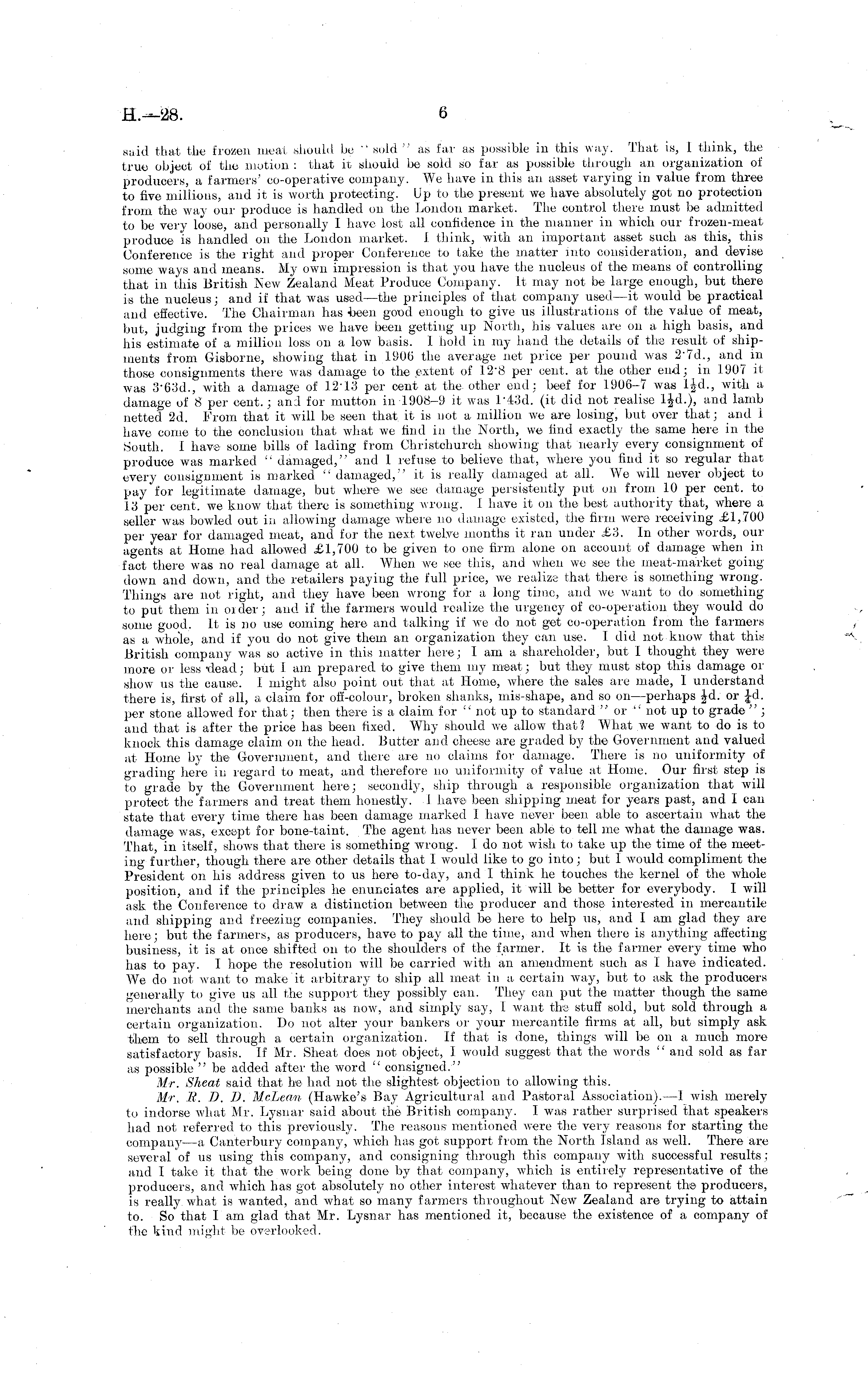 said that tilt; frozen meat should be " sold' , as far as possible in this way. That is, 1 think, the true object of the motion : that it should be sold so far as possible through an organization of producers, a farmers' co-operative company. We have in this an asset varying in value from three to five millions, and it is worth protecting. Up to the present we have absolutely got no protection from the way our produce is handled on the London market. The control there must be admitted to be very loose, and personally 1 have lost all confidence in the manner in which our frozen-meat produce is handled on the London market. 1 think, with an important asset such as this, this Conference is the right and proper Conference to take the matter into consideration, and devise some ways and means. My own impression is that you have the nucleus of the means of controlling that in this British New Zealand Meat Produce Company. It may not be large enough, but there is the nucleus; and if that was used—the principles of that company used —it would be practical and effective. The Chairman has -been good enough to give us illustrations of the value of meat, but, judging from the prices we have been getting up North, his values are on a high basis, and his estimate of a million loss on a low basis. 1 hold in my hand the details of the result of shipments from Gisborne, showing that in 1906 the average net price per pound was 2'7d., and in those consignments there was damage to the .extent of 128 per cent, at the other end; in 1907 it was «"-63d., with a damage of 12• 13 per cent at the other end: beef for 1906-7 was IJd., with a damage of 8 per cent.; and for mutton in 1908-9 it was l'43d. (it did not realise and lamb netted 2d. From that it will be seen that it is not a million we are losing, but over that; and 1 have come to the conclusion that what we find in the North, we find exactly the same here in the South. 1 have some bills of lading from Christchurch showing that nearly every consignment of produce was marked " damaged," and 1 refuse to believe that, where you find it so regular that every consignment is marked " damaged," it is really damaged at all. We will never object to pay for legitimate damage, but where we see damage persistently put on from 10 per cent, to 13 per cent, we know that there is something wrong. 1 have it on the best authority that, where a seller was bowled out in allowing damage where no damage existed, the firm were receiving ,£1,700 per year for damaged meat, and for the next twelve months it ran under £'6. In other words, our agents at Home had allowed £1,700 to be given to one firm alone on account of damage when in fact there was no real damage at all. When we see this, and when we see the meat-market going down and down, and the retailers paying the full price, we realize that there is something wrong. Things are not right, and they have been wrong for a long time, and we want to do something to put them in order; and if the farmers would realize the urgency of co-operation they would do some good. It is no use coming here and talking if we do not get co-operation from the farmers as a whole, and if you do not give them an organization they can use. J did not know that this British company was so active in this matter here; 1 am a shareholder, but I thought they were more or less -dead; but 1 am prepared to give them my meat; but they must stop this damage or show us the cause. I might also point out that at Home, where the sales are made, I understand there is, first of all, a claim for off-colour, broken shanks, mis-shape, and so on —perhaps |d. or Jd. per stone allowed for that; then there is a claim for " not up to standard " or " not up to grade " ; and that is after the price has been fixed. Why should we allow that? What we want to do is to knock this damage claim on the head. Butter and cheese are graded by the Government and valued at Home by the Government, and there are no claims for damage. There is no uniformity of grading here in regard to meat, and therefore no uniformity of value at Home. Our first step is to grade by the Government here; secondly, ship through a responsible organization that will protect the farmers and treat them honestly. 1 have been shipping meat for years past, and I can state that every time there has been damage marked I have never been able to ascertain what the damage was, except for bone-taint. The agent has never been able to tell me what the damage was. That, in itself, shows that there is something wrong. Ido not wish to take up the time of the meeting further, though there are other details that I would like to go into; but 1 would compliment the President on his address given to us here to-day, and I think he touches the kernel of the whole position, and if the principles he enunciates are applied, it will be better for everybody. I will ask the Conference to draw a distinction between the producer and those interested in mercantile and shipping and freezing companies. They should be here to help us, and I am glad they are here; but the farmers, as producers, have to pay all the time, and when there is anything affecting business, it is at once shifted on to the shoulders of the farmer. It is the farmer every time who has to pay. I hope the resolution will be carried with an amendment such as I have indicated. We do not want to make it arbitrary to ship all meat in a certain way, but to ask the producers generally to give us all the support they possibly can. They can put the matter though the same merchants and the same banks as now, and simply say, I want the stuff sold, but sold through a certain organization. Do not alter your bankers or your mercantile firms at all, but simply ask them to sell through a certain organization. If that is done, things will be on a much more satisfactory basis. If Mr. Sheat does not object, 1 would suggest that the words " and sold as far as possible " be added after the 