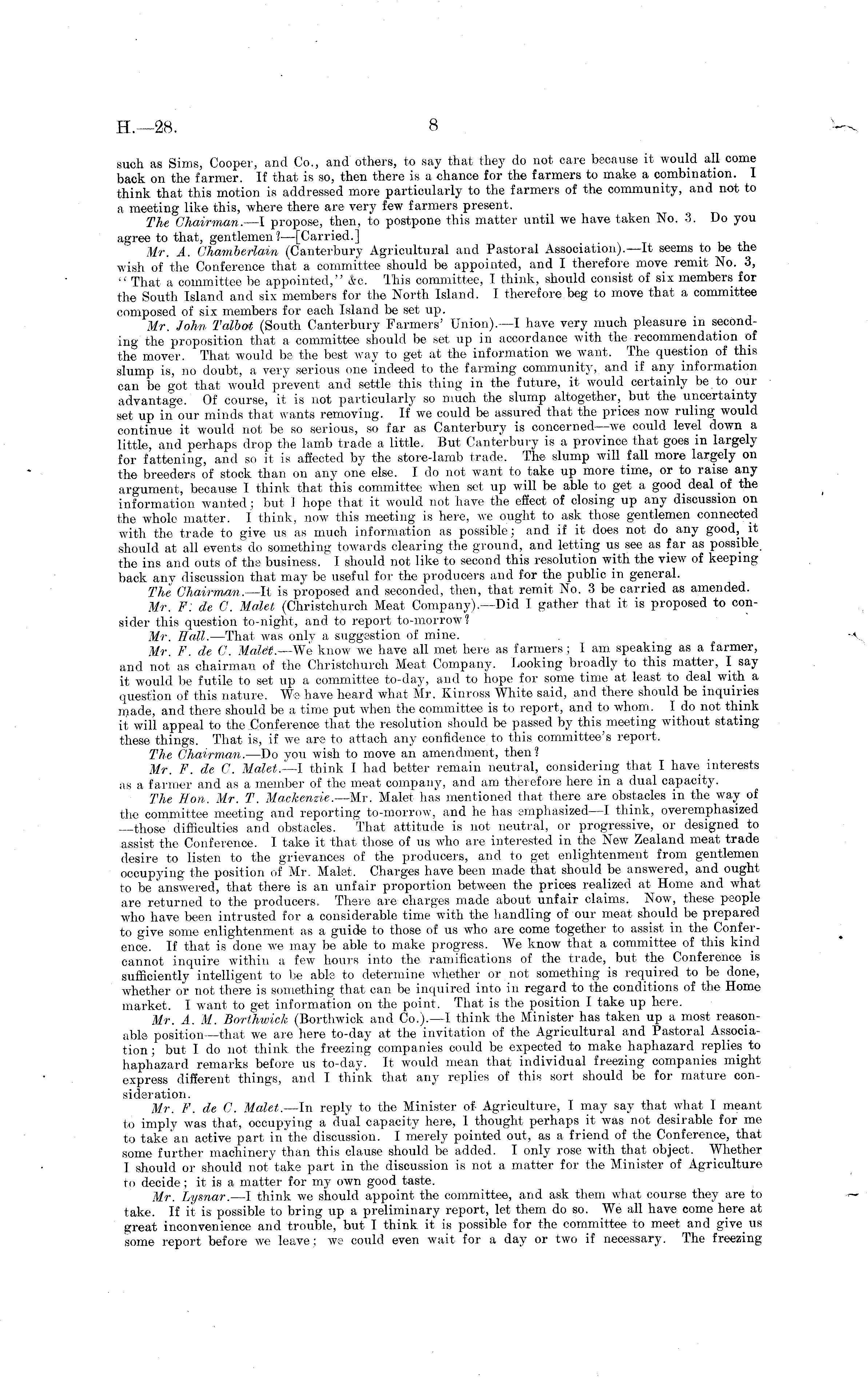 such as Sims, Cooper, and Co., and others, to say that they do not care because it would all come back on the farmer. If that is so, then there is a chance for the farmers to make a combination. I think that this motion is addressed more particularly to the farmers of the community, and not to a meeting like this, where there are very few farmers present. The Chairman. —I propose, then, to postpone this matter until we have taken No. 3. Do you agree to that, gentlemen? —[Carried.] Mr. A. Chamberlain (Canterbury Agricultural and Pastoral Association). —It seems to be the wish of the Conference that a committee should be appointed, and I therefore move remit No. 3, " That a committee be appointed," &c. Ibis committee, I think, should consist of six members for the South Island and six members for the North Island. I therefore beg to move that a committee composed of six members for each Island be set up. Mr. John T alb at (South Canterbury Farmers' Union).—l have very much pleasure in seconding the proposition that a committee should be set up in accordance with the recommendation of the mover. That would be the best way to get at the information we want. The question of this slump is, no doubt, a very serious one indeed to the farming community, and if any information can be got that would prevent and settle this thing in the future, it would certainly be to our advantage. Of course, it is not particularly so much the slump altogether, but the uncertainty set up in our minds that wants removing. If we could be assured that the prices now ruling would continue it would not be so serious, so far as Canterbury is concerned —we could level down a little, and perhaps drop the lamb trade a little. But Canterbury is a province that goes in largely for fattening, and so it is affected by the store-lamb trade. The slump will fall more largely on the breeders of stock than on any one else. I do not want to take up more time, or to raise any argument, because I think that this committee when set up will be able to get a good deal of the information wanted ; but 1 hope that it would not have the effect of closing up any discussion on the whole matter. I think, now this meeting is here, we ought to ask those gentlemen connected with the trade to give us as much information as possible; and if it does not do any good, it should at all events do something towards clearing the ground, and letting us see as far as possible the ins and outs of the business. I should not like to second this resolution with the view of keeping back any discussion that may be useful for the producers and for the public in general. The Chairman.— -It is proposed and seconded, then, that remit No. 3be carried as amended. Mr. F. de C. Malet (Christchurch Meat Company).—Did I gather that it is proposed to consider this question to-night, and to report to-morrow? Mr. Hall. —That was only a suggestion of mine. Mr. F. de C. Malet. —We know we have all met here as farmers ; 1 am speaking as a farmer, and not as chairman of the Christchurch Meat Company. Looking broadly to this matter, I say it would be futile to set up a committee to-day, and to hope for some time at least to deal with a question of this nature. We have heard what Mr. Kinross White said, and there should be inquiries made, and there should be a time put when the committee is to report, and to whom. Ido not think it will appeal to the Conference that the resolution should be passed by this meeting without stating these things. That is, if we are to attach any confidence to this committee's report. The Chairman. —Do you wish to move an amendment, then? Mr. F. de C. Malet.—l think I had better remain neutral, considering that I have interests as a farmer and as a member of the meat company, and am therefore here in a dual capacity. The Hon. Mr. T. Mackenzie. —Mr. Malet has mentioned that there are obstacles in the way of the committee meeting and reporting to-morrow, and he has emphasized —I think, overemphasized those difficulties and obstacles. That attitude is not neutral, or progressive, or designed to assist the Conference. I take it that those of us who are interested in the New Zealand meat trade desire to listen to the grievances of the producers, and to get enlightenment from gentlemen occupying the position of Mr. Malet, Charges have been made that should be answered, and ought to be answered, that there is an unfair proportion between the prices realized at Home and what are returned to the producers. There are charges made about unfair claims. Now, these people who have been intrusted for a considerable time with the handling of our meat should be prepared to give some enlightenment as a guide to those of us who are come together- to assist in the Conference. If that is done we may be able to make progress. We know that a committee of this kind cannot inquire within a few hours into the ramifications of the trade, but the Conference is sufficiently intelligent to be able to determine whether or not something is required to be done, whether or not there is something that can be inquired into in regard to the conditions of the Home market, I want to get information on the point. That is the position I take up here. Mr. A. M. Borthwick (Borthwick and Co.). —1 think the Minister has taken up a most reasonable position that we are here to-day at the invitation of the Agricultural and Pastoral Association ; but I do not think the freezing companies could be expected to make haphazard replies to haphazard remarks before us to-day. It would mean that individual freezing companies might express different things, and I think that an}- replies of this sort should be for mature consideration. Mr. F. de C. Malet. —ln reply to the Minister of Agriculture, I may say that what I meant to imply was that, occupying a dual capacity here, 1 thought perhaps it was not desirable for me to take an active part in the discussion. I merely pointed out, a