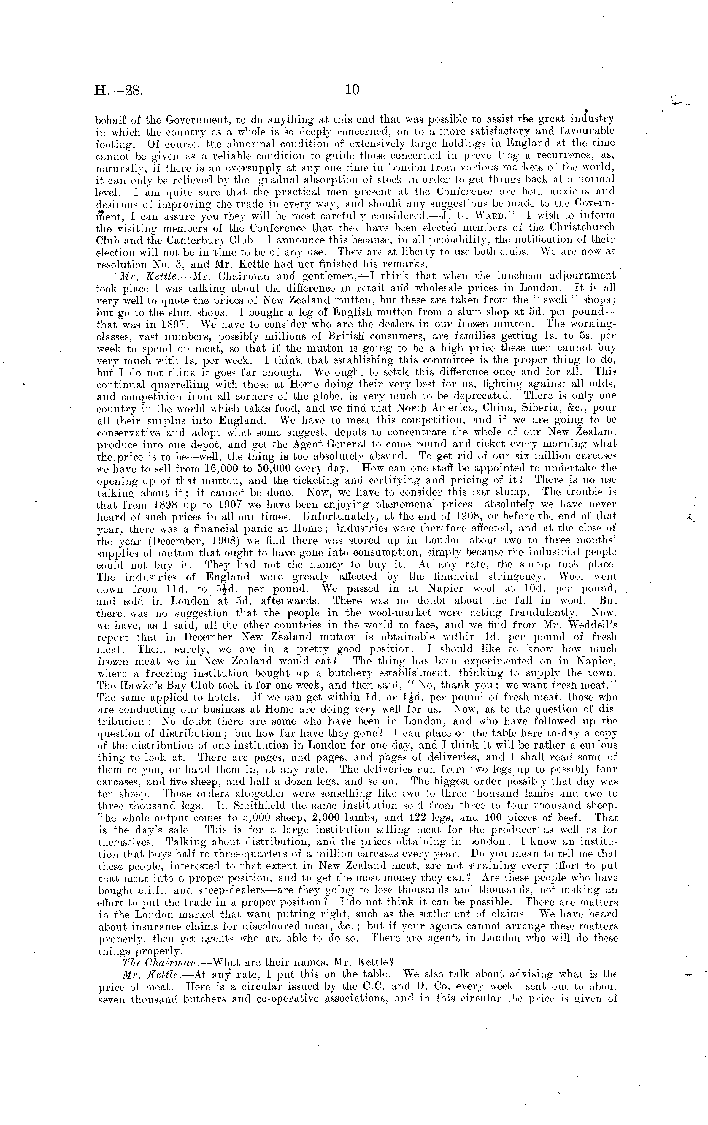■ behalf of the Government, to do anything at this end that was possible to assist the great industry in which the country as a whole is so deeply concerned, on to a more satisfactory and favourable footing. Of course, the abnormal condition of extensively large holdings in England at the time cannot be given as a reliable condition to guide those concerned in preventing a recurrence, as, naturally, if there is an ovorsupply at any one time in London from various markets of the world, it can only be relieved by the gradual absorption of stock in order to get things back at a normal level. I am quite sure that the practical men present at the Conference are both anxious and desirous of improving the trade in every way, and should any suggestions be made to the Government, I can assure you they will be most carefully considered. — J. G. Wabd." 1 wish to inform the visiting members of the Conference that they have bsen elected members of the Christchurch Club and the Canterbury Club. I announce this because, in all probability, the notification of their election will not be in time to be of any use. They are at liberty to use both clubs. We are now at resolution. No. 3, and Mr. Kettle had not finished his remarks. Mr. Kettle. —Mr. Chairman and gentlemen, —I think that when the luncheon adjournment took place I was talking about the difference in retail arid wholesale prices in London. It is all very well to quote the prices of New Zealand mutton, but these are taken from the " swell " shops; but go to the slum shops. I bought a leg of English mutton from a slum shop at sd. per pound— that was in 1897. We have to consider who are the dealers in our frozen mutton. The workingclasses, vast numbers, possibly millions of British consumers, are families getting Is. to ss. per week to spend on meat, so that if the mutton is going to be a high price these men cannot buy very much with Is, per week. I think that establishing this committee is the proper thing to do, but I do not think it goes far enough. We ought to settle this difference once and for all. This continual quarrelling with those at Home doing their very best for us, fighting against all odds, and competition from all corners of the globe, is very much to be deprecated. There is only one country in the world which takes food, and we find that North America, China, Siberia, &c, pour all their surplus into England. We have to meet this competition, and if we are going to be conservative and adopt what some suggest, depots to concentrate the whole of our New Zealand produce into one depot, and get the Agent-General to come round and ticket every morning what the. price is to be—well, the thing is too absolutely absurd. To get rid of our six million carcases we have to sell from 16,000 to 50,000 every day. How can one staff be appointed to undertake the opening-up of that mutton, and the ticketing and certifying and pricing of it? There is no use talking about it; it cannot be done. Now, we have to consider this last slump. The trouble is that from 1898 tip to 1907 we have been enjoying phenomenal prices—absolutely we have never heard of such prices in all our times. Unfortunately, at the end of 1908, or before the end of that 3'ear, there was a financial panic at Home; industries were therefore affected, and at the close of the year (December , , 1908) we find there was stored up in London about two to three months' supplies of mutton that ought to have gone into consumption, simply because the industrial people could not buy it. They had not the money to buy it. At any rate, the slump took place. The industries of England were greatly affected by the financial stringency. Wool went down from lid. to s|d. per pound. We passed in at Napier wool at 10d. per pound, and sold in London at sd. afterwards. There was no doubt about the fall in wool. But there, was no suggestion that the people in the wool-market were acting fraudulently. Now, we have, as I said, all the other countries in the world to face, and we find from Mr. Weddell's report that in December New Zealand mutton is obtainable within Id. per pound of fresh meat. Then, surely, we are in a pretty good position. I should like to know how much frozen meat we in New Zealand would eat? The thing lias been experimented on in Napier, where a freezing institution bought up a butchery establishment, thinking to supply the town. The Hawke's Bay Club took it for one week, and then said, " No, thank you; we want fresh meat." The same applied to hotels. If we can get within Id. or ljd. per pound of fresh meat, those who are conducting our business at Home are doing very well for us. Now, as to the question of distribution : No doubt there are some who have been in London, and who have followed up the question of distribution; but how far have they gone? I can place on the table here a copy of the distribution of one institution in London for one day, and I think it will be rather a curious thing to look at. There are pages, and pages, and pages of deliveries, and I shall read some of them to you, or hand them in, at any rate. The deliveries run from two legs up to possibly four carcases, and five sheep, and half a dozen legs, and so on. The biggest order possibly that day was ten sheep. Those" orders altogether were something like two to three thousand lambs and two to three thousand legs. In Smithfield the same institution sold from three' to four thousand sheep. The whole output comes to 5,000 sheep, 2,000 lambs, and 422 legs, and 400 pieces of beef. That is the day's sale. This is for a large institution selling meat for the producer , as well as for themselves. Talking about distribution, and the prices obtaining in London : I know an institution that buys half to three-quarters of a million carcases every year. Do you mean to tell me that these people, interested to that extent in New Zealand meat, are not straining every effort to put that meat into a proper position, and t