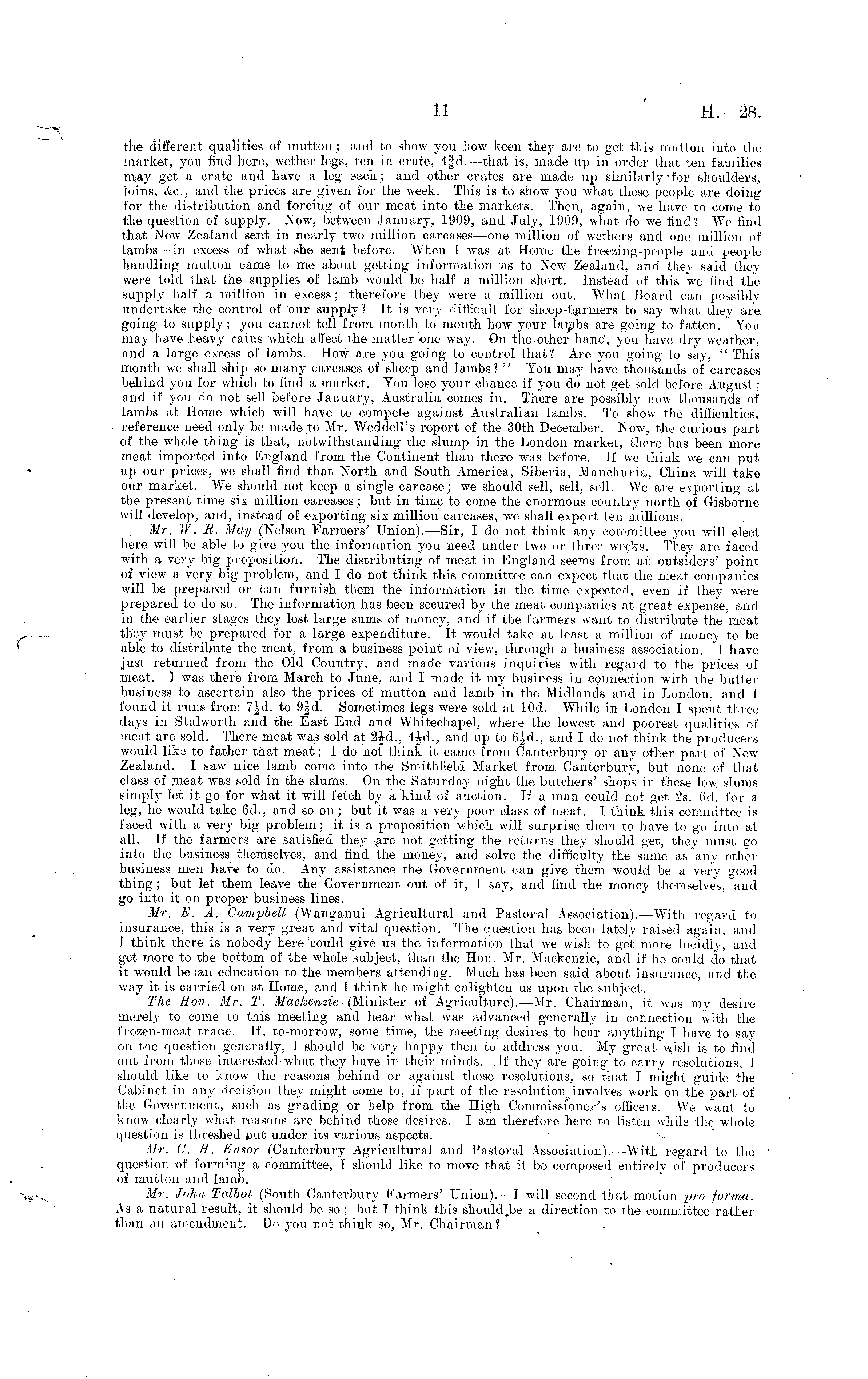 the different qualities of mutton; and to show you how keen they are to get this mutton into the market, you find here, wether-legs, ten in crate, <tfd. —that is, made up in order that ten families miay get a crate and have a leg each; and other crates are made up similarly'for shoulders, loins, &c, and the prices are given for the week. This is to show you what these people are doing for the distribution and forcing of our meat into the markets. Then, again, we have to come to the question of supply. Now, between January, 1909, and July, 1909, what do we find? We find that New Zealand sent in nearly two million carcases —one million of wethers and one million of lambs —in excess of what she sent before. When I was at Home the freezing-people and people handling mutton came to me about getting information as to New Zealand, and they said they were told that the supplies of lamb would be half a million short. Instead of this we find the supply half a million in excess; therefore they were a million out. What Board can possibly undertake the control of 'our supply? It is very difficult for sheep-f\armers to say what they are going to supply; you cannot tell from month to month how your lambs are going to fatten. You may have heavy rains which affect the matter one way. On theother hand, you have dry weather, and a large excess of lambs. How are you going to control that? Are you going to say, " This month we shall ship so-many carcases of sheep and lambs? " You may have thousands of carcases behind you for which to find a market. You lose your chance if you do not get sold before August; and if you do not sell before January, Australia comes in. There are possibly now thousands of lambs at Home which will have to compete against Australian lambs. To show the difficulties, reference need only be made to Mr. Weddell's report of the 30th December. Now, the curious part of the whole thing is that, notwithstanding the slump in the London market, there has been more meat imported into England from the Continent than there was before. If we think we can put up our prices, we shall find that North and South America, Siberia, Manchuria, China will take our market. We should not keep a single carcase; we should sell, sell, sell. We are exporting at the present time six million carcases; but in time to come the enormous country north of Gisborne will develop, and, instead of exporting six million carcases, we shall export ten millions. Mr. W. B. May (Nelson Farmers' Union). —Sir, I do not think any committee you will elect here will be able to give }'ou the information you need under two or three weeks. They are faced with a very big proposition. The distributing of meat in England seems from an outsiders' point of view a very big problem, and I do not think this committee can expect that the meat companies will be prepared or can furnish them the information in the time expected, even if they were prepared to do so. The information has been secured by the meat companies at great expense, and in the earlier stages they, lost large sums of money, and if the farmers want to distribute the meat they must be prepared for a large expenditure. It would take at least a million of money to be able to distribute the meat, from a business point of view, through a business association. I have just returned from the Old Country, and made various inquiries with regard to the prices of meat. I was there from March to June, and I made it my business in connection with the butter business to ascertain also the prices of mutton and lamb in the Midlands and in London, and I found it runs from. 7|-d. to 9jd. Sometimes legs were sold at 10d. While in London I spent three days in Stalworth and the East End and Whitechapel, where the lowest and poorest qualities of meat are sold. There meat was sold at 2jd., 4jd., and up to 6|d., and Ido not think the producers would like to father that meat; I do not think it came from Canterbury or any other part of New Zealand. I saw nice lamb come into the Smithfield Market from Canterbury, but none of that class of meat was sold in the slums. On the Saturday night the butchers' shops in these low slums simply let it go for what it will fetch by a kind of auction. If a man could not get 2s. Gd. for a leg, he would take 6d., and so on; but it was a very poor class of meat. I think this committee is faced with a very big problem; it is a proposition which will surprise them to have to go into at all. If the farmers are satisfied they iare not getting the returns they should get, they must go into the business themselves, and find : the money, and solve the difficulty the same as any other business men have to do. Any assistance the Government can give them would be a very good thing; but let them leave the Government out of it, I say, and find the money themselves, and go into it on proper business lines. Mr. E. A. Campbell (Wanganui Agricultural and Pastoral Association). —With regard to insurance, this is a very great and vital question. The question has been lately raised again, and I think there is nobody here could give us the information that we wish to get more lucidly, and get more to the bottom of the whole subject, than the Hon. Mr. Mackenzie, and if he could do that it would be san education to the members attending. Much has been said about insurance, and the way it is carried on at Home, and I think he might enlighten us upon the subject. The Hon. Mr. T. Mackenzie (Minister of Agriculture).—Mr. Chairman, it was my desire merely to come to this meeting and hear what was advanced generally in connection with the frozen-meat trade. If, to-morrow, some time, the meeting desires to hear anything I have to say on the question generally, I should be very happy then to address you. My great wish is to find out from those interested what they have in their minds. If they are going to carry resolutions, I should like to know the reasons behind or against those resolutions