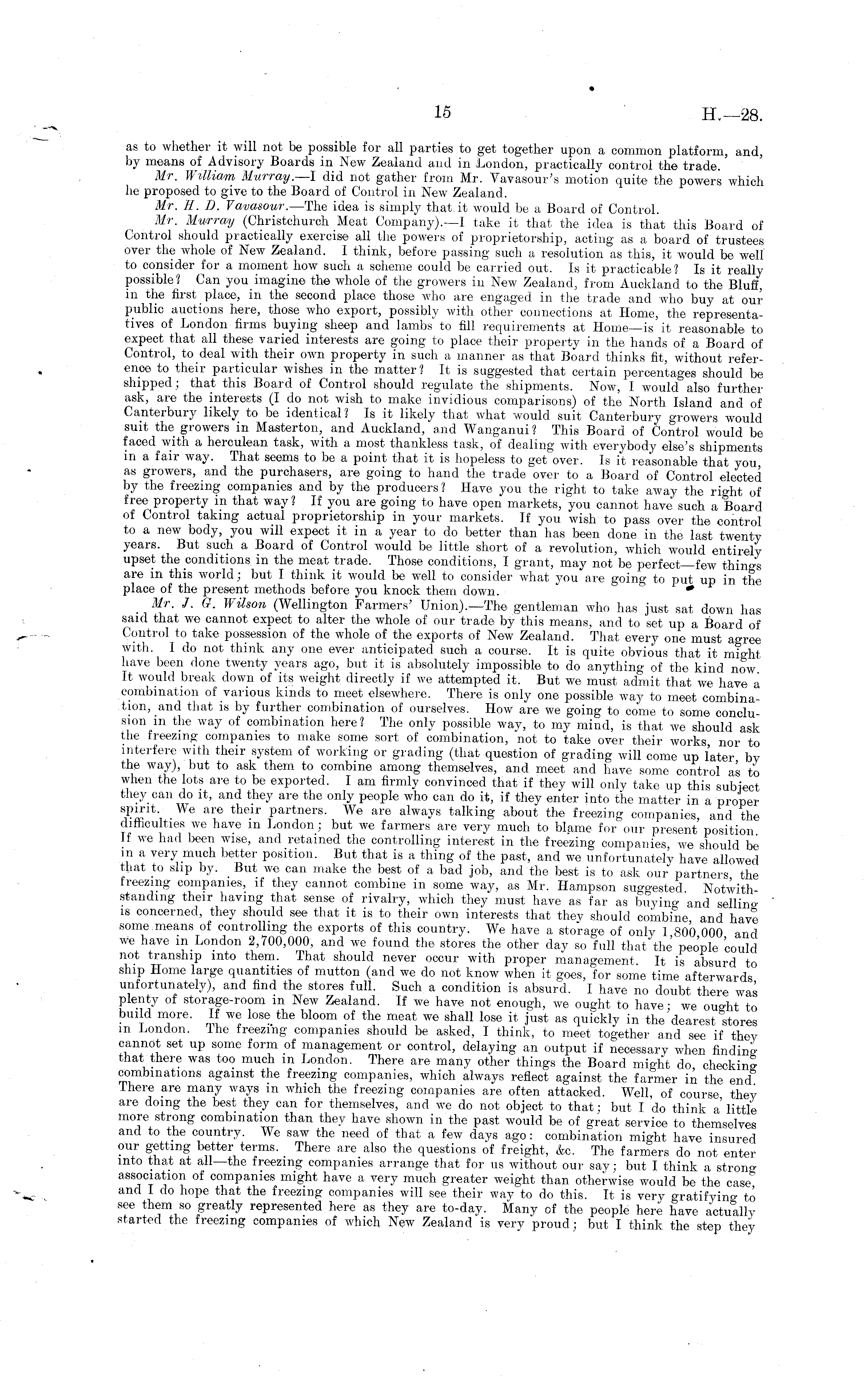 as to whether it will not be possible for all parties to get together upon a common platform, and, by means of Advisory Boards in New Zealand and in London, practically control the trade. Mr. William Murray.—l did not gather from Mr. Vavasour's motion quite the powers which he proposed to give to the Board of Control in New Zealand. Mr, E. D. Vavasour. —The idea is simply that, it would be a Board of Control. Mr. Murray (Christchurch Meat Company).—! take it that the idea is that this Board of Control should practically exercise all the powers of proprietorship, acting as a board of trustees over the whole of New Zealand. I think, before passing such a resolution as this, it would be well to consider for a moment how such a scheme could be carried out. Is it practicable ? Is it reallypossible? Can you imagine the whole of the growers in New Zealand, from Auckland to the Bluff, in the first place, in the second place those who are engaged in the trade and who buy at our public auctions here, those who export, possibly with other connections at Home, the representatives of London firms buying sheep and lambs" to fill requirements at Home—is it reasonable to expect that all these varied interests are going to place their property in the hands of a Board of Control, to deal with their own property in such a manner as that Board thinks fit, without reference to their particular wishes in the matter? It is suggested that certain percentages should be shipped; that this Board of Control should regulate the shipments. Now, I would also further ask, are the interests (I do not wish to make invidious comparisons) of the North Island and of Canterbury likely to be identical? Is it likely that what would suit Canterbury growers would suit the growers in Masterton, and Auckland, and Wanganui? This Board of Control would be faced with a herculean task, with a most thankless task, of dealing with everybody else's shipments in a fair way. That seems to be a point that it is hopeless to get over. Is it reasonable that you as growers, and the purchasers, are going to hand the trade over to a Board of Control elected by the freezing companies and by the producers? Have you the right to take away the right of free property in that way? If you are going to have open markets, you cannot have such a Board of Control taking actual proprietorship in your markets. If you wish to pass over the control to a new body, you will expect it in a year to do better than has been done in the last twenty years. But such a Board of Control would be little short of a revolution, which would entirely upset the conditions in the meat trade. Those conditions, I grant, may not be perfect—few things are in this world; but I think it would be well to consider what you are going to put up in the place of the present methods before you knock them down. • Mr. J. G. Wilson (Wellington Farmers' Union).—The gentleman who has just sat down has said that we cannot expect to alter the whole of our trade by this means, and to set up a Board of Control to take possession of the whole of the exports of New Zealand. That every one must agree with. I do not think any one ever anticipated such a course. It is quite obvious that it might have been done twenty years ago, but it is absolutely impossible to do anything of the kind now It would break down of its weight directly if we attempted it. But we must admit that we have a combination of various kinds to meet elsewhere. There is only one possible way to meet combina,tion, and that is by further combination of ourselves. How are we going to come to some conclu sion in the way of combination here ? The only possible way, to my mind, is that we should ask the freezing companies to make some sort of combination, not to take over their works nor to interfere with their system of working or grading (that question of grading will come up later by the way), but to ask them to combine among themselves, and meet and have some control as to when the lots are to be exported. lam firmly convinced that if they will only take up this subject they can do it, and they are the only people who can do it, if they enter into the matter in a proper spirit. We are their partners. We are always talking about the freezing companies and the difficulties we have in London; but we farmers are very much to blame for our present position If we had been wise, and retained the controlling interest in the freezing companies we should be in a very much better position. But that is a thing of the past, and we unfortunately have allowed that to slip by. But we can make the best of a bad job, and the best is to ask our partners the freezing companies, if they cannot combine in some way, as Mr. Hampson suggested Notwithstanding their having that sense of rivalry, which they must have as far as buying and sellinois concerned, they should see that it is to their own interests that they should combine and have some means of controlling the exports of this country. We have a storage of only 1 800 000 and we have in London 2,700,000, and we found the stores the other day so full that the people 'could not tranship into them. That should never occur with proper management. It is absurd to ship Home large quantities of mutton (and we do not know when it goes, for some time afterwards unfortunately), and find the stores full. Such a condition is absurd. I have no doubt there was plenty of storage-room in New Zealand. If we have not enough, we ought to have ;we ought to build more. If we lose the bloom of the meat we shall lose it just as quickly in the dearest stores m London. Ihe freezing companies should be asked, I think, to meet together and see if they cannot set up some form of management or control, delaying an. output if necessary when findingthat there was too much in London. There are many other things the Board might do checking combinations against the freezing companies, which always reflect against the farmer in