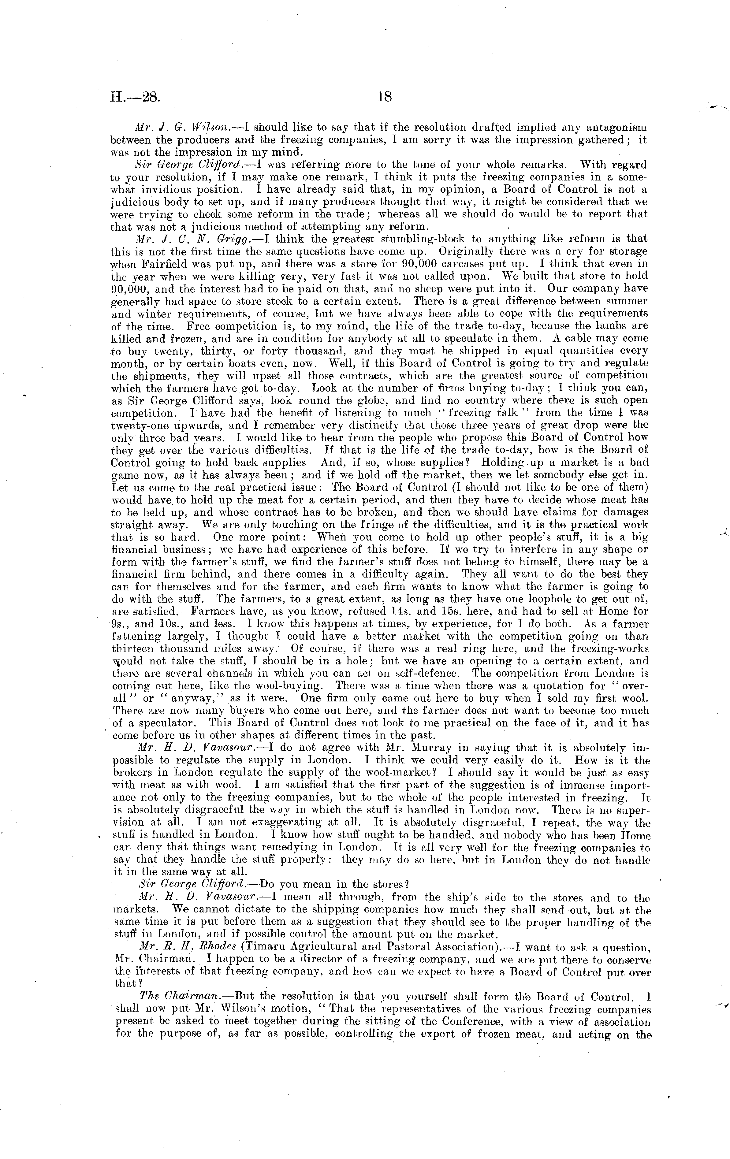 Mr. J . G. Wilson. —I should like to say that if the resolution drafted implied any antagonism between the producers and the freezing companies, lam sorry it was the impression gathered; it was not the impression in my mind. Sir George Clifford. —I was referring more to the tone of your whole remarks. With regard to your resolution, if I may make one remark, I think it puts the freezing companies in a somewhat invidious position. I have already said that, in my opinion, a Board of Control is not a judicious body to set up, and if many producers thought that way, it might be considered that we were trying to check some reform in the trade ; whereas all we should do would be to report that that was not a judicious method of attempting any reform. , Mr. J. C. N. Grigg. —l think the greatest stumbling-block to anything like reform is that this is not the first time the same questions have come up. Originally there was a cry for storage when Fairfield was put up, and there was a store for 90,000 carcases put up. I think that even in the year whet) we were killing very, very fast it was not called upon. We built that store to hold 90,000, and the interest had to be paid on that, and no sheep were put into it. Our company have generally had space to store stock to a certain extent. There is a great difference between summer and winter requirements, of course, but we have always been able to cope with the requirements of the time. Free competition is, to my mind, the life of the trade to-day, because the lambs are killed and frozen, and are in condition for anybody at all to speculate in them. A cable may come to buy twenty, thirty, or forty thousand, and they must be shipped in equal quantities every month, or by certain boats even, now. Well, if this Board of Control is going to try and regulate the shipments, they will upset all those contracts, which are the greatest source of competition which the farmers have got to-day. Look at the number of firms buying to-day ; I think you can, as Sir George Clifford says, look round the globe, and rind no country where there is such open competition. I have had the benefit of listening to much "freezing talk " from the time I was twenty-one upwards, and I remember very distinctly that those three years of great drop were the only three bad years. I would like to hear from the people who propose this Board of Control how they get over the various difficulties. If that is the life of the trade to-day, how is the Board of Control going to hold back supplies And, if so, whose supplies? Holding up a market is a bad game now, as it has always been ; and if we hold off the market, then we let somebody else get in. Let us come to the real practical issue: The Board of Control (I should not like to be one of them) would have, to hold up the meat for a certain period, and then they have to decide whose meat has to be held up, and whose contract has to be broken, and then we should have claims for damages straight away. We are only touching on the fringe of the difficulties, and it is the practical work that is so hard. One more point: When you come to hold up other people's stuff, it is a big financial business; we have had experience of this before. If we try to interfere in any shape or form with the farmer's stuff, we find the farmer's stuff doss not belong to himself, there may be a financial firm behind, and there comes in a difficult}- again. They all want to do the best the)' can for themselves and for the farmer, and each firm wants to know what the farmer is going to do with the stuff. The farmers, to a great extent, as long as they have one loophole to get out of, are satisfied. Farmers have, as you know, refused 14s. and 15s. here, and had to sell at Home for 95., and 10s., and less. I know this happens at times, by experience, for Ido both. As a farmer fattening largely, I thought 1 could have a better market with the competition going on than thirteen thousand miles away. . Of course, if there was a real ring here, and the freezing-works w,ould not take the stuff, I should be in a hole; but we have an opening to a certain extent, and there are several channels in which you can act on self-defence. The competition from London is coming out here, like the wool-buying. There was a time when there was a quotation for " overall " or " anyway," as it were. One firm only came out here to buy when I sold my first wool. There are now many buyers who come out here, and the farmer does not want to become too much of a speculator. This Board of Control does not look to me practical on the face of it, and it has come before us in other shapes at different times in the past. Mr. 11. D. Vavasour. —l do not agree with Mr. Murray in saying that it is absolutely impossible to regulate the supply in London. T think we could very easily do it. How is it the brokers in London regulate the supply of the wool-market? I should say it would be just as easy with meat as with wool. lam satisfied that the first part of the suggestion is of immense importance not only to the freezing companies, but to the whole of the people interested in freezing. It is absolutely disgraceful the way in which the stuff is handled in London now. There is no supervision at all. I am not exaggerating at all. It is absolutely disgraceful, I repeat, the way the stuff is handled in London. I know how stuff ought to be handled, and nobody who has been Home can deny that things want remedying in London. It is all very well for the freezing companies to say that they handle the stuff properly: they may do so here, but in London they do not handle it in the same way at all. Sir George Clifford. —Do you mean in the stores? Mr. H. D. Vavasour.—l mean all through, from the ship's side to the stores and to the markets. We cannot dictate to the shipping companies how much they shall send out, but at the same time it is put before them as a suggestion that they should see to the proper handling of