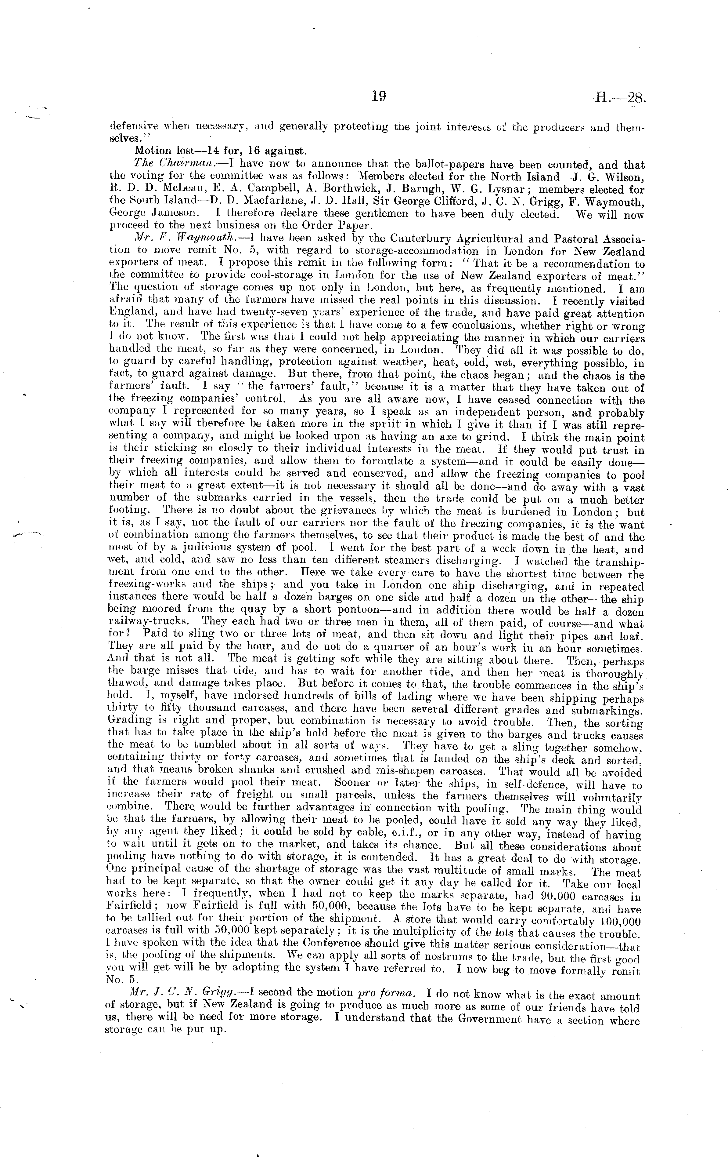 defensive when necessary, and generally protecting the joint interests of the producers and themselves." Motion lost—l 4 for, 16 against. The Chairman. —I have now to announce that the ballot-papers have been counted, and that the voting for the committee was as follows: Members elected for the North Island— J. G. Wilson, R. I). D. McLean, E. A. Campbell, A. Borthwick, J. Barugh, W. G. Lysnar; members elected for the South Island —D. I). Macfarlane, J. D. Hall, Sir George Clifford, J. C. N. Grigg, F. Waymouth, George Jameson. I therefore declare these gentlemen to have been duly elected. We will now proceed to the next business cm the Order Paper. Mr. F. Waymouth. —l have been asked by the Canterbury Agricultural and Pastoral Association to move remit No. 5, with regard to storage-accommodation in London for New Zealand exporters of meat. I propose this remit in the following form: " That it be a recommendation to the committee to provide cool-storage in London for the use of New Zealand exporters of meat." The question of storage comes up not only in London, but here, as frequently mentioned. I am afraid that many of the farmers have missed the real points in this discussion. I recently visited England, and have had twenty-seven years' experience of the trade, and have paid great attention to it. The result of this experience is that I have come to a few conclusions, whether right or wrong Ido not- know. The first was that I could not help appreciating the manner in which our carriers handled the meat, so far as they were concerned, in London. They did all it was possible to do, to guard by careful handling, protection against weather, heat, cold, wet, everything possible, in fact, to guard against damage. But there, from that point, the chaos began; and the chaos is the farmers' fault. I say "the farmers' fault," because, it is a matter that they have taken out of the freezing companies' control. As you are all aware now, I have ceased connection with the company I represented for so many years, so I speak as an independent person, and probably what 1 say will therefore be taken more in the spriit in which I give it than if I was still representing a company, and might be looked upon as having an axe to grind. I think the main point is their sticking so closely to their individual interests in the meat. If they would put trust in their freezing companies, and allow them to formulate a system-—and it could be easily done— by which all interests could be served and conserved, and allow the freezing companies to pool their meat to a great extent—it is not necessary it should all be done —and do away with a vast number of the submarks carried in the vessels, then the trade could be put on a much better footing. There is no doubt about the grievances by which the meat is burdened in London; but it is, as 1 say, not the fault of our carriers nor the fault of the freezing companies, it is the want of combination among the farmers themselves, to see that their product is made the best of and the most of by a judicious system of pool. I went for the best part of a week down in the heat, and wet, and cold, and saw no less than ten different steamers discharging. I watched the transhipment from one end to the other. Here we take every care to have the shortest time between the freezing-works and the ships; and you take in London one ship discharging, and in repeated instances there w-ould be half a dozen barges on one side and half a dozen on the other the ship being moored from the quay by a short pontoon—and in addition there would be half a dozen railway-trucks. They each had two or three men in them, all of them paid, of course—and what for? Paid to sling two or three lots of meat, and then sit down and light their pipes and loaf. They are all paid by the hour, and do not do a quarter of an hour's work in an hour sometimes. And that is not all. The meat is getting soft while they are sitting about there. Then, perhaps the barge misses that tide, and has to wait for another tide, and then her meat is thoroughly thawed, and damage takes place. But before it comes to,that, the trouble commences in the ship's hold. I, myself, have indorsed hundreds of bills of lading where we have been shipping perhaps thirty to fifty thousand carcases, and there have been several different grades and submarkings. Grading is right and proper, but combination is necessary to avoid trouble. Then, the sorting that has to take place in the ship's hold before the meat is given to the barges and trucks causes the meat to be tumbled about in all sorts of ways. They have to get a sling together somehow, containing thirty or forty carcases, and sometimes that is landed on the ship's deck and sorted,' and that means broken shanks and crushed and mis-shapen carcases. That would all be avoided if the farmers would pool their meat. Sooner or later the ships, in self-defence, will have to increase their rate of freight on small parcels, unless the farmers themselves will voluntarily combine. There would be further advantages in connection with pooling. The main thing would be that the farmers, by allowing their meat to be pooled, could have it sold any way they liked, by any agent they liked; it could be sold by cable, c.i.f., or in any other way, instead of having to wait until it gets on to the market, and takes its chance. But all these considerations about pooling have nothing to do with storage, it is contended. It has a great deal to do with storage. One principal cause of the shortage of storage was the vast multitude of small marks. The meat had to be kept separate, so that the owner could get it any day he called for it. Take our local works here: I frequently, when I had not to keep the marks separate, had 90,000 carcases in Fairfield; now Fairfield is full with 50,000, because the lots have to be kept separate, and have to be tallied out for their portion of the shipment. A store that would car