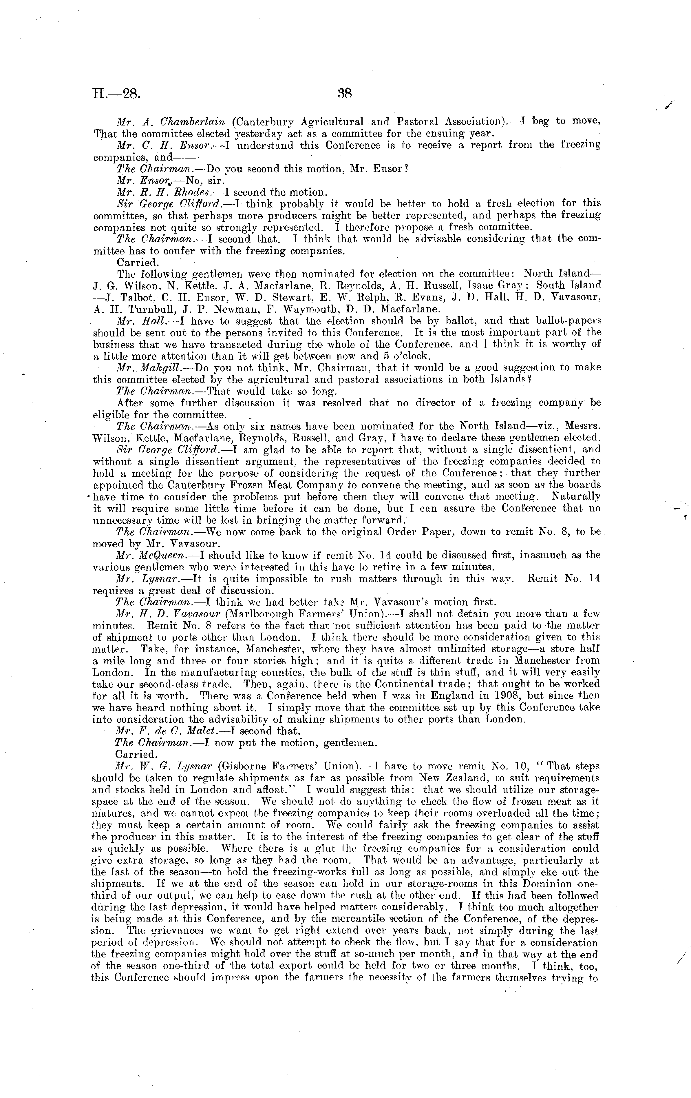 Mr. A. Chamberlain (Canterbury Agricultural and Pastoral Association). —I beg to move, That the committee elected yesterday act as a committee for the ensuing year. Mr. C. H. Ensor. —l understand this Conference is to receive a report from the freezing companies, and The Chairman. —Do you second this motion, Mr. Ensor ? Mr. Ensor % . —No, sir. Mr. R. H. Rhodes, —I second the motion. Sir George Clifford. —I think probably it would be better to hold a fresh election for this committee, so that perhaps more producers might be better represented, and perhaps the freezing companies not quite so strongly represented. I therefore propose a fresh committee. The Chairman. —l second that. I think that would be advisable considering that the committee has to confer with the freezing companies. Carried. The following gentlemen were then nominated for election on the committee: North Island— J. G. Wilson, N. Kettle, J. A. Macfarlane, E. Reynolds, A. H. Russell, Isaac Gray; South Island —J. Talbot, C. H. Ensor, W. D. Stewart, E. W. Relph, R. Evans, J. D. Hall, H. D. Vavasour, A. H. Turnbull, J. P. Newman, F. Waymouth, D. D. Macfarlane. Mr. Hall. —l have to suggest that the election should be by ballot, and that ballot-papers should be sent out to the persons invited to this Conference. It is the most important part of the business that we have transacted during the whole of the Conference, and I think it is worthy of a little more attention than it will get between now and 5 o'clock. Mr.Makgill. —Do you not think, Mr. Chairman, that it would be a good suggestion to make this committee elected by the agricultural and pastoral associations in both Islands? The Chairman. —That would take so long. After some further discussion it was resolved that no director of a freezing company be eligible for the committee. The Chairman. —As only six names have been nominated for the North Island —viz., Messrs. Wilson, Kettle, Macfarlane, Reynolds, Russell, and Gray, I have to declare these gentlemen elected. Sir George Clifford. —I am glad to be able to report that, without a single dissentient, and without a single dissentient argument, the representatives of the freezing companies decided to hold a meeting for the purpose of considering the request of the Conference; that they further appointed the Canterbury Frozen Meat Company to convene the meeting, and as soon as the boards ' have time to consider the problems put before them they will convene that meeting. Naturally it will require some little time before it can be done, but I can assure the Conference that no unnecessary time will be lost in bringing the matter forward. The Chairman. —We now come back to the original Order Paper, down to remit No. 8, to be moved by Mr. Vavasour. Mr. McQueen. —I should like to know if remit No. li could be discussed first, inasmuch as the various gentlemen who wero interested in this have to retire in a few minutes. Mr. Lysnar. —It is quite impossible to rush matters through in this way. Remit No. 14 requires a great deal of discussion. The Chairman. —l think we had better take Mr. Vavasour's motion first. Mr. H. D. Vavasour (Marlborough Farmers' Union). —I shall not detain you more than a few minutes. Remit No. 8 refers to the fact that not sufficient attention has been paid to the matter of shipment to ports other than London. I think there should be more consideration given to this matter. Take, for instance, Manchester, where they have almost unlimited storage—a store half a mile long and three or four stories high; and it is quite a different trad© in Manchester from London. In the manufacturing counties, the bulk of the stuff is thin stuff, and it will very easily take our second-class trade. Then, again, there is the Continental trade; that ought to be worked for all it is worth. There was a Conference held when I was in England in 1908, but since then we have heard nothing about it. I simply move that the committee set up by this Conference take into consideration the advisability of making shipments to other ports than London. Mr. F. de C. Malet. —l second that. The Chairman. —l now put the motion, gentlemen. Carried. Mr. W. G. Lysnar (Gisborne Farmers' Union). —I have to move remit No. 10, " That steps should be taken to regulate shipments as far as possible from New Zealand, to suit requirements and stocks held in London and afloat." I would suggest this: that we should utilize our storagespace at the end of the season. We should not do anything to check the flow of frozen meat as it matures, and we cannot expect the freezing companies to keep their rooms overloaded all the time; they must keep a certain amount of room. We could fairly ask the freezing companies to assist the producer in this matter. It is to the interest of the freezing companies to get clear of the stuff as quickly as possible. Where there is a glut the freezing companies for a consideration could give extra storage, so long as they had the room. That would be an advantage, particularly at the last of the season —to hold the freezing-works full as long as possible, and simply eke out the shipments. If we at the end of the season can hold in our storage-rooms in this Dominion onethird of our output, we can help to ease down the rush at the other end. If this had been followed during the last depression, it would have helped matters considerably. I think too much altogether is being made at this Conference, and by the mercantile section of the Conference, of the depression. The grievances we want to get right extend over years back, not simply during the last period of depression. We should not attempt to check the flow, but I say that for a consideration the freezing companies might hold over the stuff at so-much per month, and in that way at the end of the season one-third of the total export could be held for two or three months. I think, too, this Conference should impress upon the farmers the n