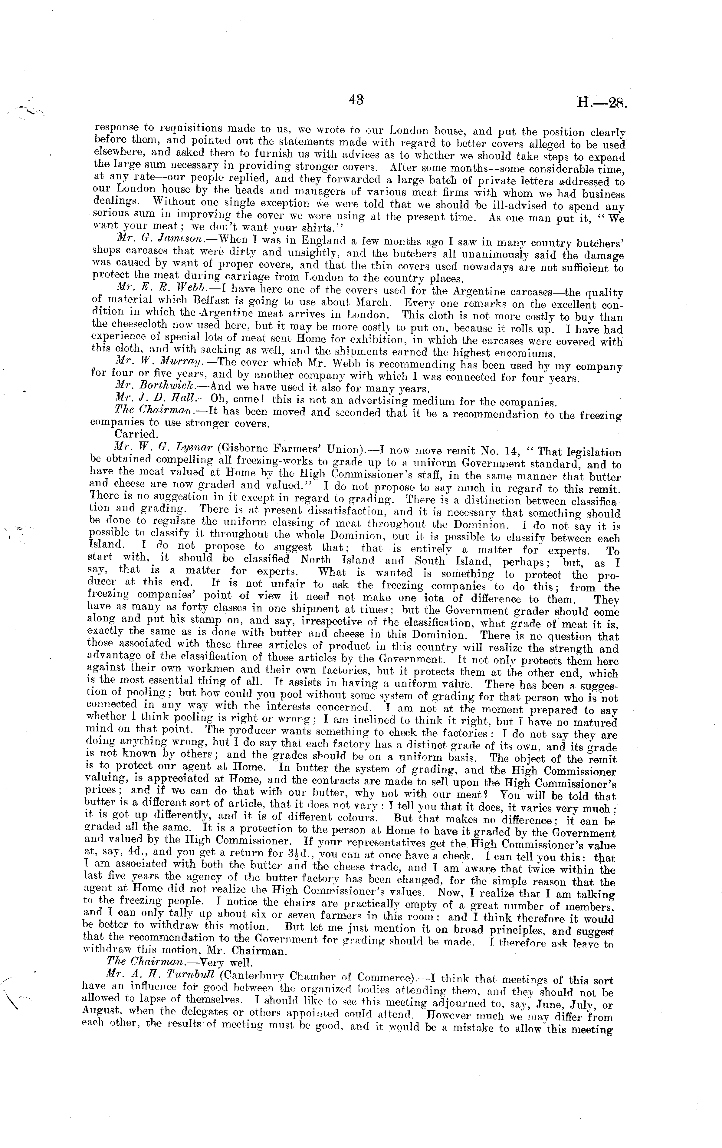 response to requisitions made to us, we wrote to our London bouse, and put the position clearly before them, and pointed out the statements made with regard to better covers alleged to be used elsewhere, and asked them to furnish us with advices as to whether we should take steps to expend the large sum necessary in providing stronger covers. After some months—some considerable time at any rate—our people replied, and they forwarded a large baton of private letters addressed to our London house by the heads and managers of various meat firms with whom we had business dealings. Without one single exception we were told that we should be ill-advised to spend any serious sum m improving the cover we were using at the present time. As one man put it "We want your meat; we don't want your shirts." Mr. G. Jameson. —When I was in England a few months ago I saw in many country butchers' shops carcases that were dirty and unsightly, and the butchers all unanimously said the damage was caused by want of proper covers, and that the thin covers used nowadays are not sufficient to protect the meat during carriage from London to the country places. Mr. EB. Webb.—l have here one of the covers used for the Argentine carcases—the quality ol material which Belfast is going to use about March. Every one remarks on the excellent condition in which the -Argentine meat arrives in London. This cloth is not more costly to buy than the cheesecloth now used here, but it may be more costly to put on, because it rolls up I have had experience of special lots of meat sent Home for exhibition, in which the carcases were covered with this cloth, and with sacking as well, and the shipments earned the highest encomiums Mr. W Murray.— -The cover which Mr. Webb is recommending has been used by my company tor tour or five years, and by another company with which I was connected for four years Mr. Borthwick. —And we have used it also for many years. mi' ii D -' Sall ' — Oh, com 6! tnis is not an advertising medium for the companies. the Chairman.— lt has been moved and seconded that it be a recommendation to the freezing companies to use stronger covers. Carried. Mr. W. G. Lysnar (Gisborne Farmers' Union).—l now move remit No. 14, " That legislation be obtained compelling all freezing-works to grade up to a uniform Government standard and to have the meat valued at Home by the High Commissioner's staff, in the same manner that butter and cheese are now graded and valued." I do not propose to say much in regard to this remit Ihere is no suggestion in it except in regard to grading. There is a distinction between classification and grading. There is at present dissatisfaction, and it is necessary that something should be done to regulate the uniform classing of meat throughout the Dominion. I do not say it is possible to classify it throughout the whole Dominion, but it is possible to classify between each island. _ 1 do not propose to suggest that; that is entirely a matter for' experts To start with, _ it should be classified North Island and South" Island, perhaps- but 'as I say, that is a matter for experts. What is wanted is something to protect the producer at this end. It is not unfair to ask the freezing companies to do this- from the freezing companies' point of view it need not make one iota of difference to them They have as many as forty classes in one shipment at times; but the Government grader should come along and put his stamp on, and say, irrespective of the classification, what °rade of meat it is exactly thesame as is done with butter and cheese in this Dominion. There is no question that those associated with these three articles of product in this country will realize the strength and advantage of the classification of those articles by the Government. " It not only protects them here against their own workmen and their own factories, but it protects them at the other end which is the most essential thing of all. It assists in having a uniform value. There has been a suggestion or pooling; but how could you pool without some system of grading for that person who is not connected in any way with the interests concerned. I am not at the moment prepared to say whether I think pooling is right or wrong; lam inclined to think it right, but I have no matured mind on that point, The producer wants something to check the factories :I do not say they are doing anything wrong, but I do say that each factory has a distinct grade of its own, and its grade is not known by others; and the grades should be on a uniform basis. The object of the remit is to protect our agent at Home. In butter the system of grading, and the High Commissioner valuing, is appreciated at Home, and the contracts are made to sell upon the High Commissioner's prices; and if we can do that with our butter, why not with our meat? You will be told that butter is a different sort of article, that it does not vary : T tell you that it does, it varies very much • it is got up differently, and it is of different colours. But that makes no difference; it can be graded all the same It is a protection to the person at Home to have it graded by the Government and valued by the High Commissioner. If your representatives get the. High Commissioner's value at, say, 4d., and you get a return for 3|d., you can at once have a check. I can tell you this: that lam associated with both the butter and the cheese trade, and I am aware that twice within the last five years the agency of the butter-factory has been changed, for the simple reason that the agent at Home did not realize the High Commissioner's values. Now, I realize that lam talking to the freezing people. I notice the chairs are practically empty of a great number of members and 1 can only tally up about six or seven farmers in this room; and I think therefore it would be better to withdraw this motion. But let me just mention it on broad principles, and suggest that the recommen