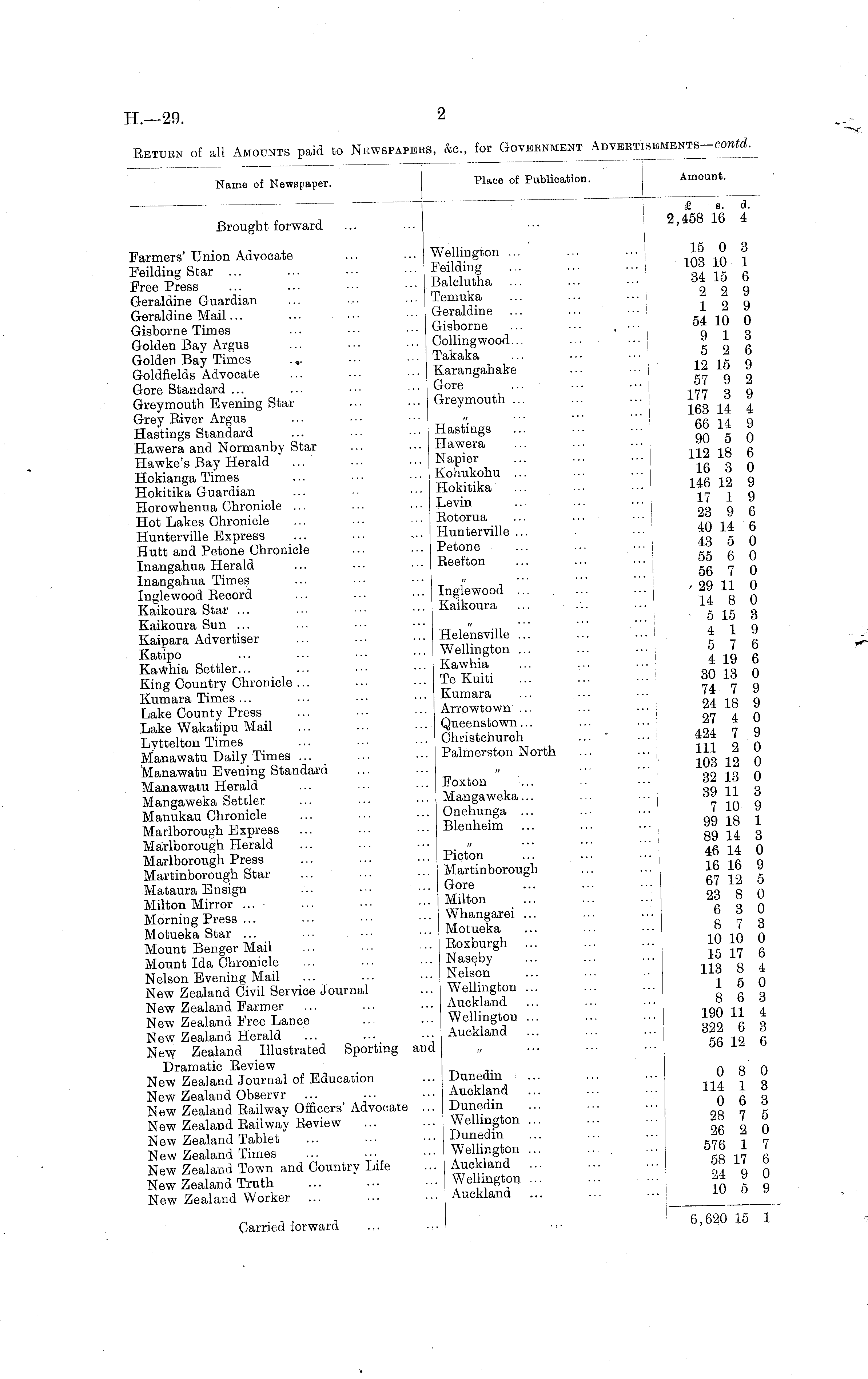 Place of Publication. moun Name of Newspaper. i i £ s. d. 2,458 16 4 Brought forward Farmers' Union Advocate ... ■ • • Feilding Star ... ... ■ ■ • • • ■ F Free Press ... . • • • • ■ '" ■ S Geraldine Guardian ... .... ••• T Geraldine Mail... . ■ • • ■ • • • • G Gisborne Times • • • • ■ • ... G Golden Bay Argus ... ■ ■ ■ ... C Golden Bay Times . „. • • ■ "' 1 Goldfields Advocate ... •■• •■• * Gore Standard ... ... ■■■ '" Greymouth Evening Star ... ... C Grey Biver Argus ... ■ ■ • Hastings Standard ... •■■ '" \ Hawera and Normanby Star ... •■■ I Hawke's Bay Herald ... ■ ■ ■ '" \ Hokianga Times ■ ■ ■ ■ ■ • ... I Hokitika Guardian ... •• " -i Horowhenua Chronicle ... ■ ■ ■ ... i Hot Lakes Chronicle ... ■ • • " i Hunterville Express ... ••• ■■■ ' Hutt and Petone Chronicle ••• •■• } Inangahua Herald ... ••• ■■■ J Inangahua Times ... •■• ••• . Inglewood Becord ... • ■ ■ ■ • ■ : Kaikoura Star ... ... ■ ■ ■ Kaikoura Sun ... ... ••_• ••■ Kaipara Advertiser Katipo Kawhia Settler... King Country Chronicle ... Kumara Times ... Lake County Press Lake Wakatipu Mail Lyttelton Times Manawatu Daily Times ... Manawatu Evening Standard Manawatu Herald Mangaweka Settler Manukau Chronicle Marlborough Express Marlborough Herald Marlborough Press Martinborough Star Mataura Ensign Milton Mirror ... ■ Morning Press ... Motueka Star ... Mount Benger Mail Mount Ida Chronicle Nelson Evening Mail New Zealand Civil Service Journal New Zealand Farmer New Zealand Free Lance New Zealand Herald ... ■•■ •■• New Zealand Illustrated Sporting and Dramatic Beview New Zealand Journal of Education New Zealand Observr New Zealand Bailway Officers' Advocate ... New Zealand Bailway Beview New Zealand Tablet New Zealand Times New Zealand Town and Country Life New Zealand Truth New Zealand Worker ... Wellington ... Feilding Balclutha Temuka Geraldine Gisborne Colling wood... Takaka Karangahake Gore Greymouth ... Hastings Hawera Napier Kohukohu ... Hokitika Levin Eotorua Hunterville ... Petone Beefton Inglewood ... Kaikoura Helensville ... Wellington ... Kawhia Te Kuiti Kumara Arrowtown ... Queenstown... Christchurch Palmerston North Foxton Mangaweka... . Onehunga ... Blenheim . Picton . Martinborough . Gore . Milton . Whangarei ... . Motueka . Boxburgh . Naseby . Nelson . Wellington ... . Auckland . Wellington ... . Auckland d ... j [ ... ... ... ... J ... ... ... ... i 15 0 3 103 10 1 34 15 6 2 2 9 12 9 54 10 0 9 13 5 2 6 12 15 9 57 9 2 177 3 9 163 14 4 66 14 9 90 5 0 112 18 6 16 3 0 146 12 9 17 1 9 23 9 6 40 14 6 43 5 0 55 6 0 56 7 0 ' 29 11 0 14 8 0 5 15 3 4 19 5 7 6 4 19 6 30 13 0 74 7 9 24 18 9 27 4 0 424 7 9 111 2 0 103 12 0 32 13 0 39 11 3 7 10 9 99 18 1 89 14 3 46 14 0 16 16 9 67 12 5 23 8 0 6 3 0 8 7 3 10 10 0 15 17 6 113 8 4 15 0 8 6 3 190 11 4 322 6 3 56 12 6 .. Dunedin .. Auckland .. Dunedin .. Wellington ... .. Dunedin Wellington ... .. Auckland .. Wellington ... .. Auckland 0 8 0 114 1 3 0 6 3 28 7 5 26 2 0 576 1 7 58 17 6 24 9 0 10 5 9 —— Carried forward I 6,620 15 1 6,620 15 1