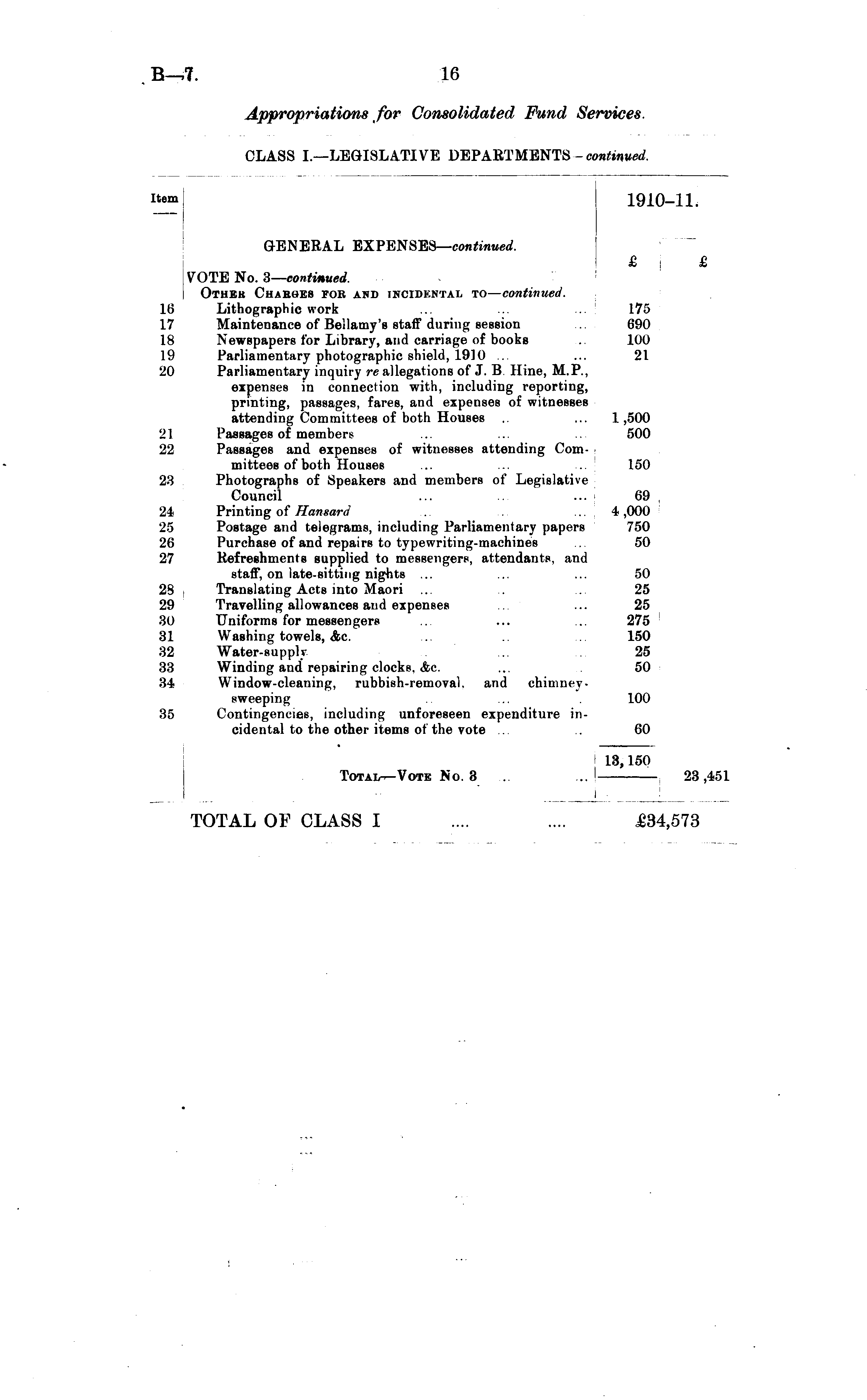 »«* 1910-11. GENERAL EXPENSES— continued. £ £ VOTE No. 3— continued. Other Charges for and incidental to — continued. 16 Lithographic work ... ... ... 175 17 Maintenance of Bellamy's staff during session ... 690 18 Newspapers for Library, and carriage of books .. 100 19 Parliamentary photographic shield, 1910 ... ... 21 20 Parliamentary inquiry re allegations of J. B. Hine, M.P., expenses in connection with, including reporting, printing, passages, fares, and expenses of witnesses attending Committees of both Houses ... 1,500 21 Passages of members ... ... ... 500 22 Passages and expenses of witnesses attending Committees of both Houses ... ... 150 23 Photographs of Speakers and members of Legislative Council ... ... ... 69 , 24 Printing of Hansard ... ... ... 4,000 < 25 Postage and telegrams, including Parliamentary papers 750 26 Purchase of and repairs to typewriting-machines .. 50 27 Refreshments supplied to messengers, attendants, and staff, on late-sitting nights ... ... ... 50 28 i Translating Acts into Maori ... ... 25 29 Travelling allowances and expenses ... ... 25 30 Uniforms for messengers ... ... ... 275 31 Washing towels, Ac. ... ... 150 32 Water-supply ... 25 33 Winding and repairing clocks. &c. ... 50 34 Window-cleaning, rubbish-removal, and chimney. sweeping ... 100 35 Contingencies, including unforeseen expenditure incidental to the other items of the vote ... .. 60 13,150 Total—Vote No. 3 ... .:. 23,45 j TOTAL OF CLASS I .... .... £34,573