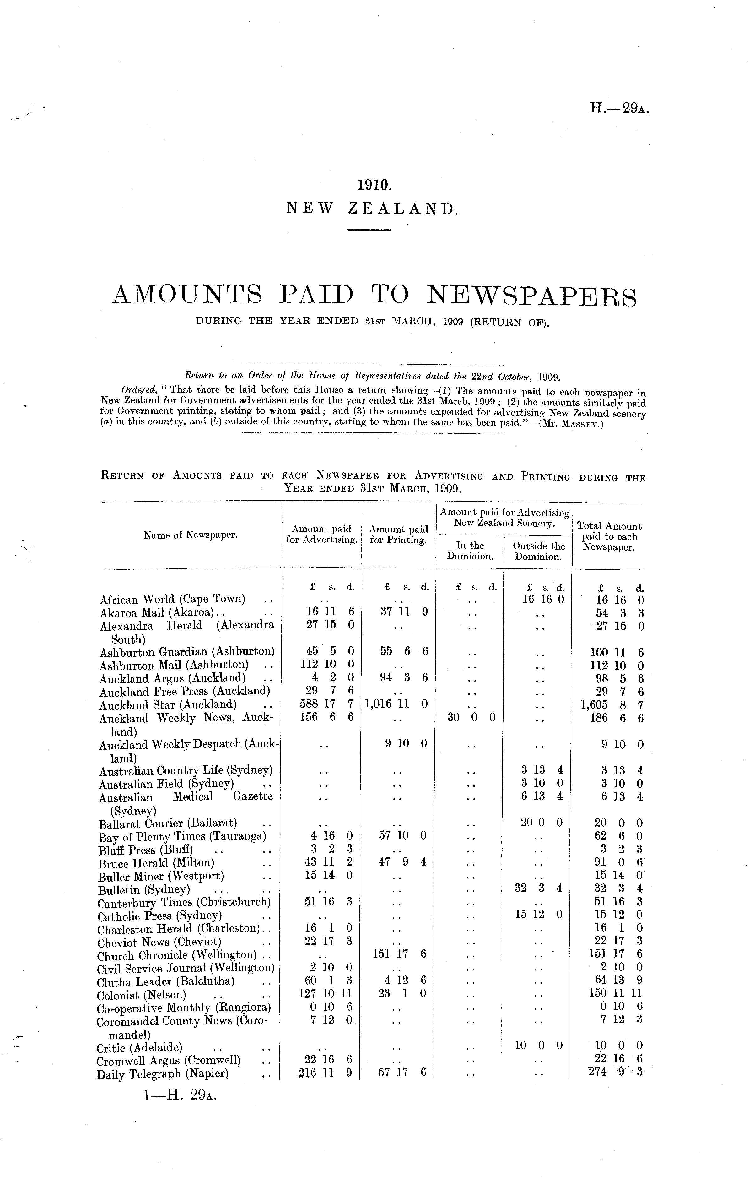 Return to an Order of the House of Representatives dated the 22nd October, 1909. Ordered, " That there be laid before this House a return showing—(l) The amounts paid to each newspaper in New Zealand for Government advertisements for the year ended the 31st March, 1909 ; (2) the amounts similarly paid for Government printing, stating to whom paid ; and (3) the amounts expended for advertising New Zealand scenery (a) in this country, and (b) outside of this country, stating to whom the same has been paid."—(Mr. Massey.)